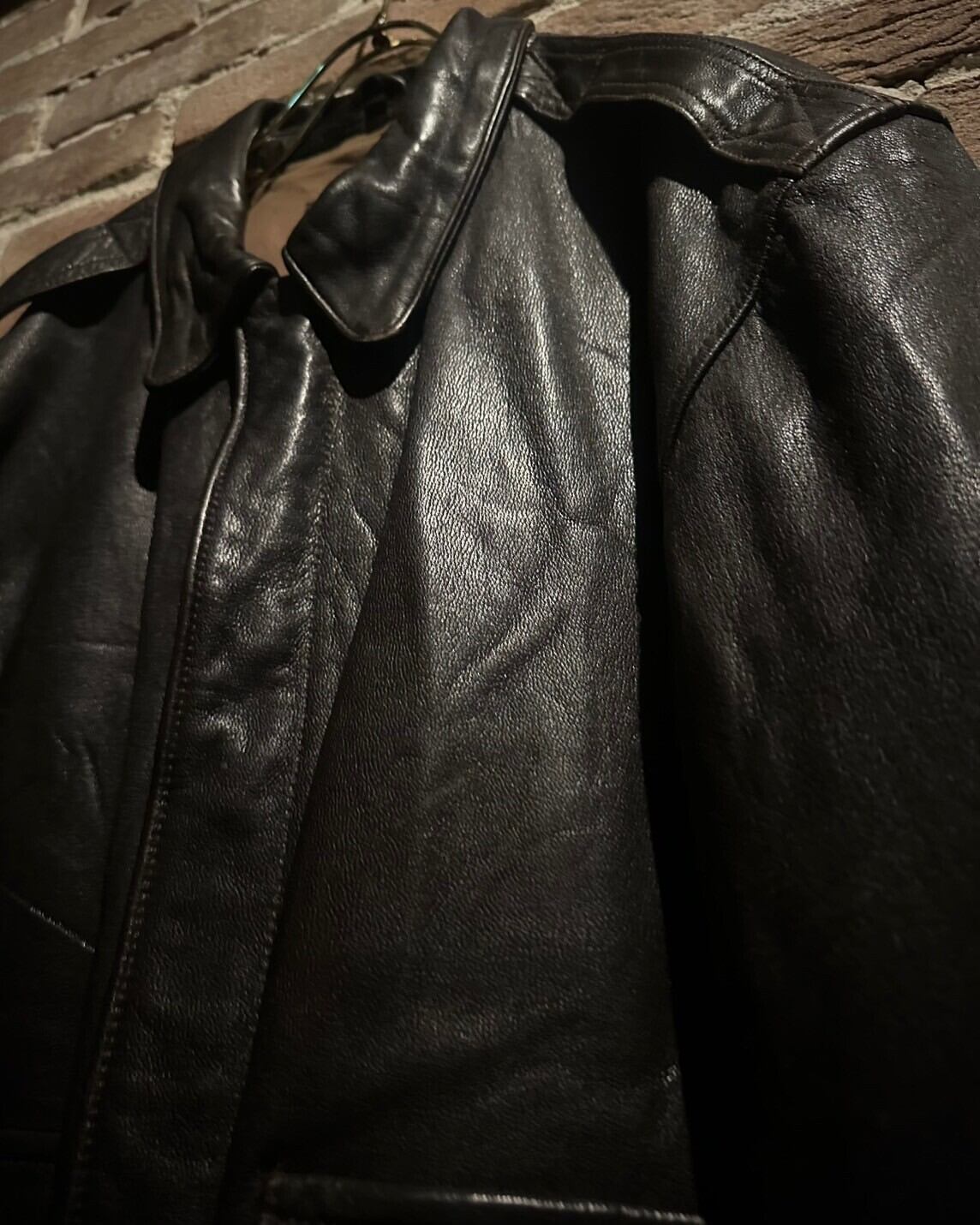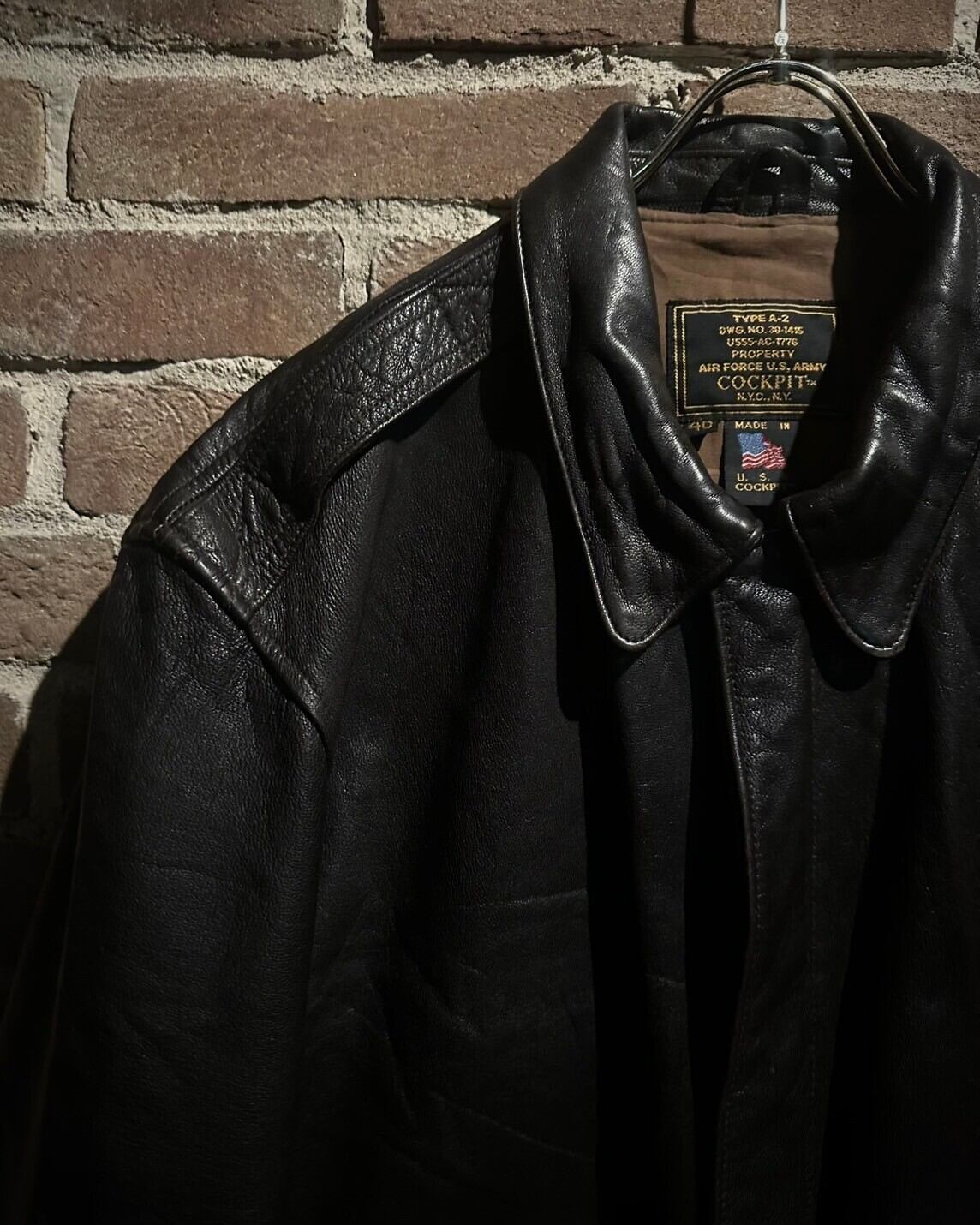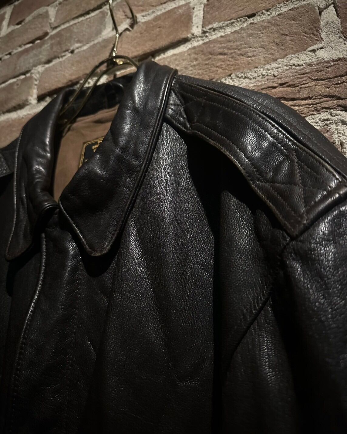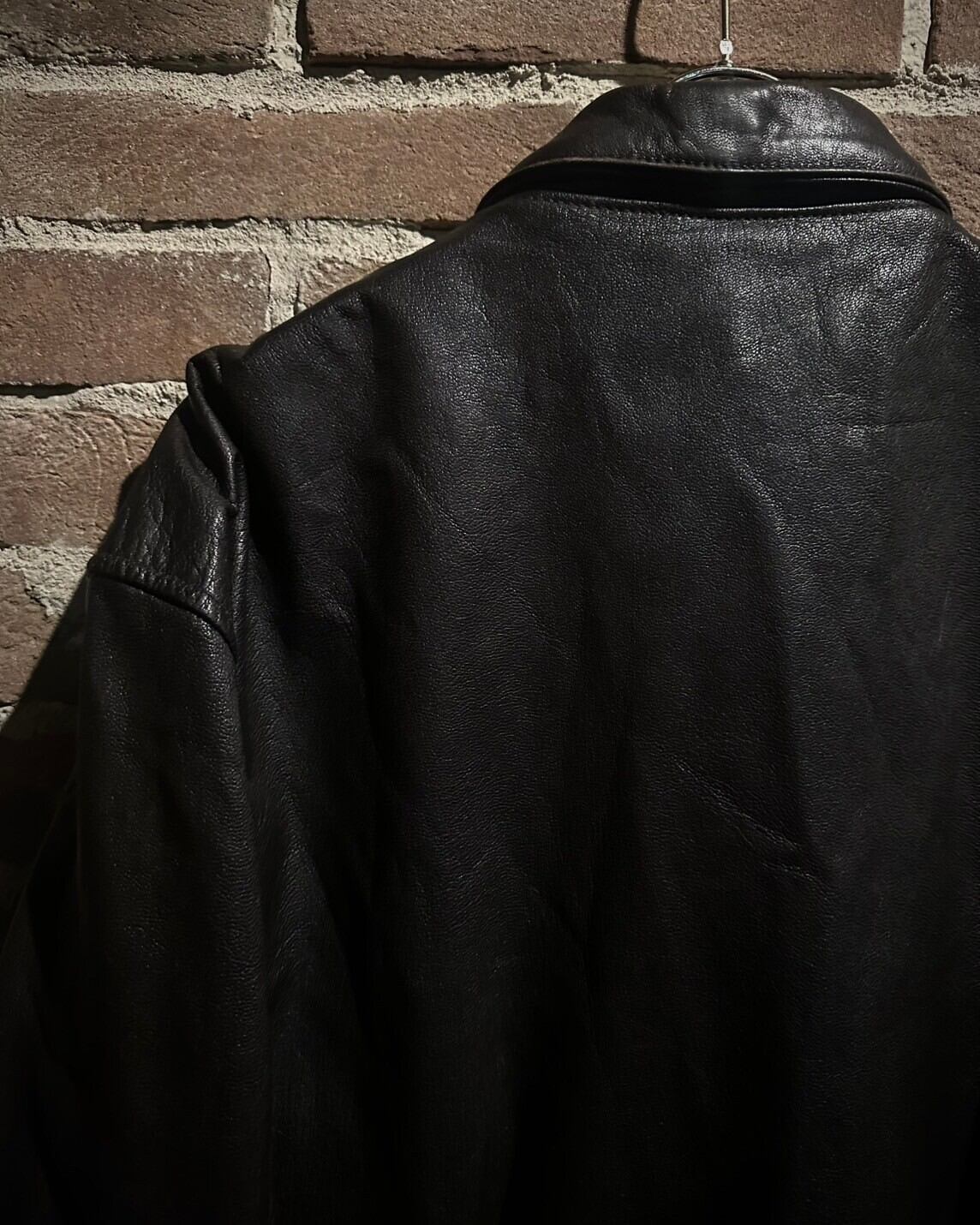 1931年に米陸軍航空隊に採用された、フライトジャケットの名作"A-2"をデザインソースにした1着。写真からもヒシヒシと伝わる上質なブラックレザーが無骨さを引き立ててくれています。
