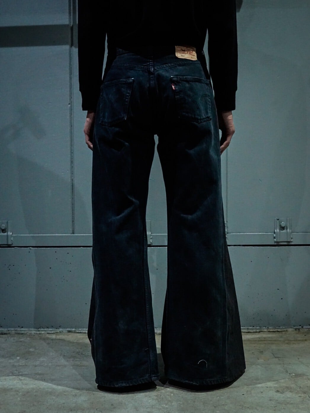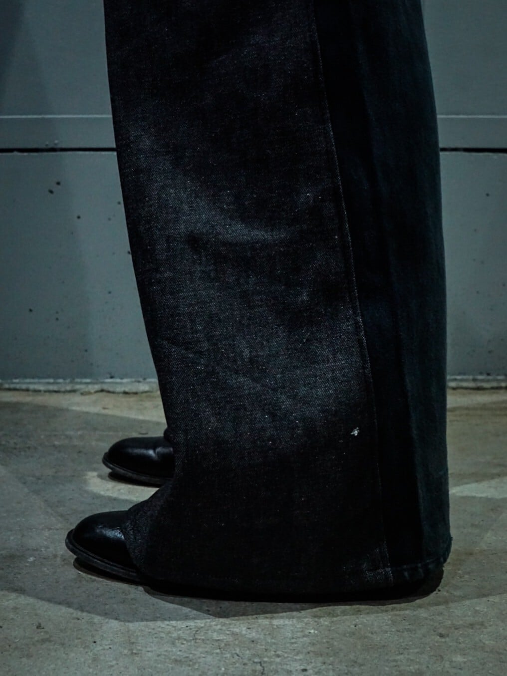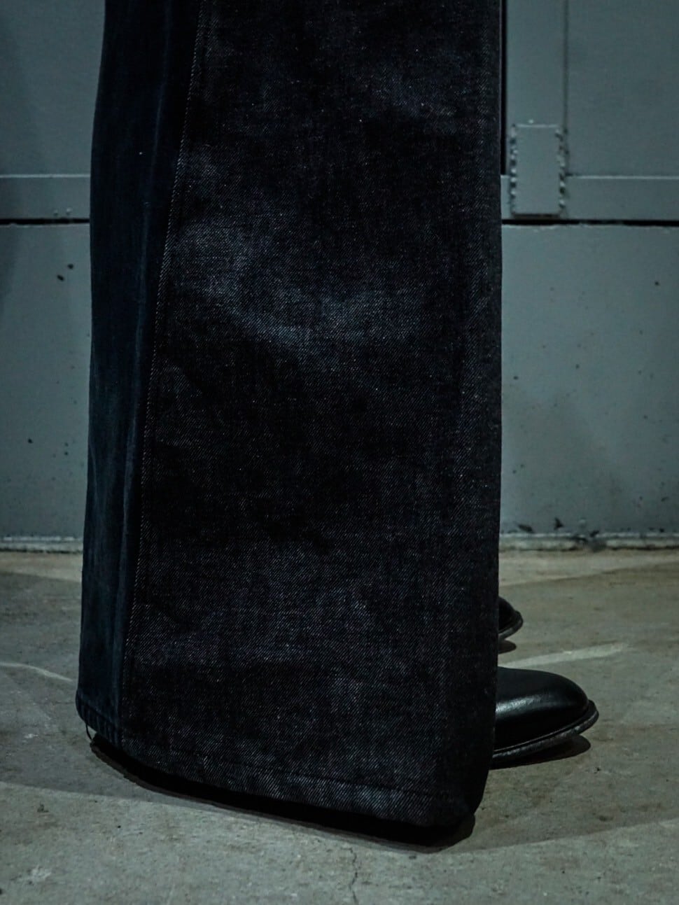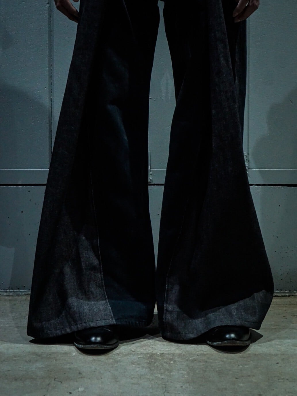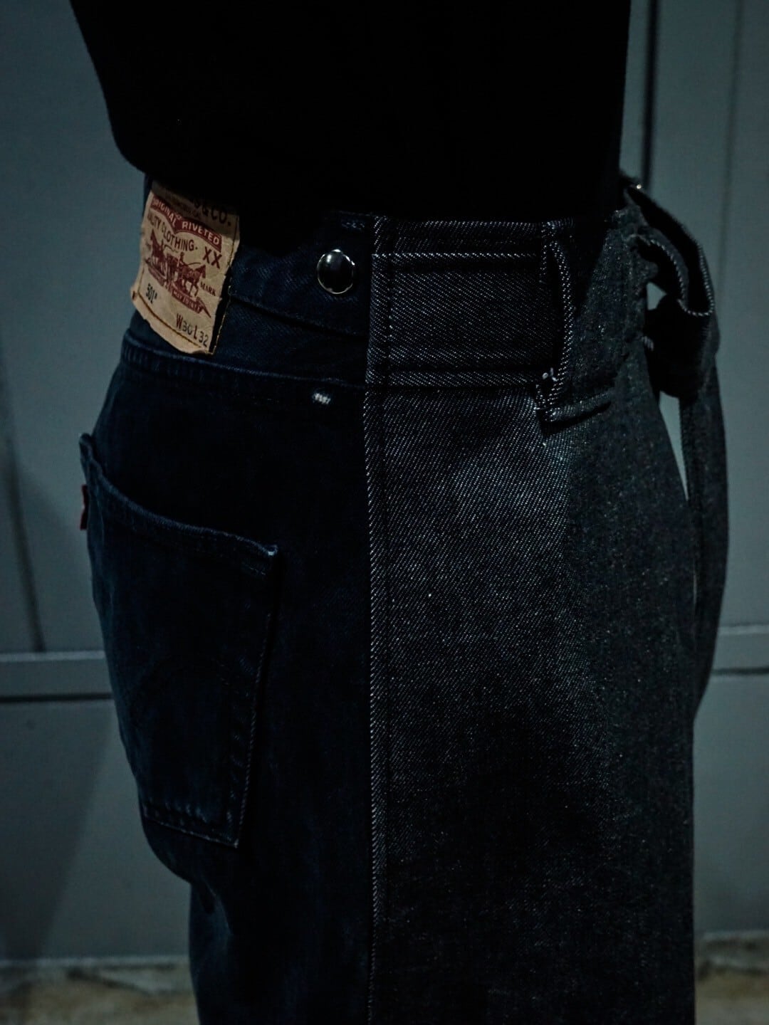 当店が誇る"Original Remake"シリーズより、2色のデニム生地をドッキング。140cmを超えるウエスト部分を折り返し、立体的なレイブシルエットを生み出すリメイクの1着をご紹介致します。