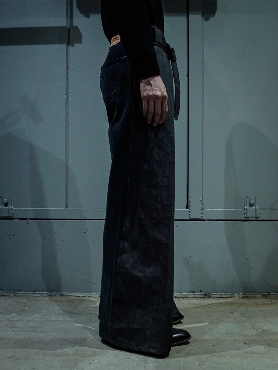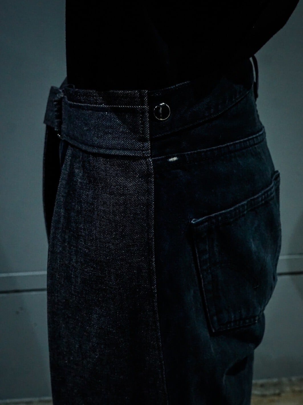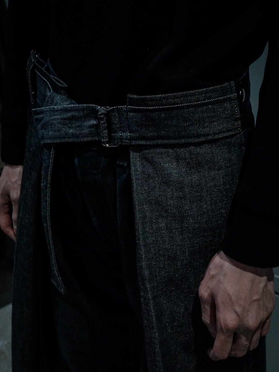 ベルト部分にはドローコードを搭載。2種のデニムを用いた色のコントラスト、デニムのハリ感から生まれる立体的なシルエットがめちゃくちゃ良いんです。
