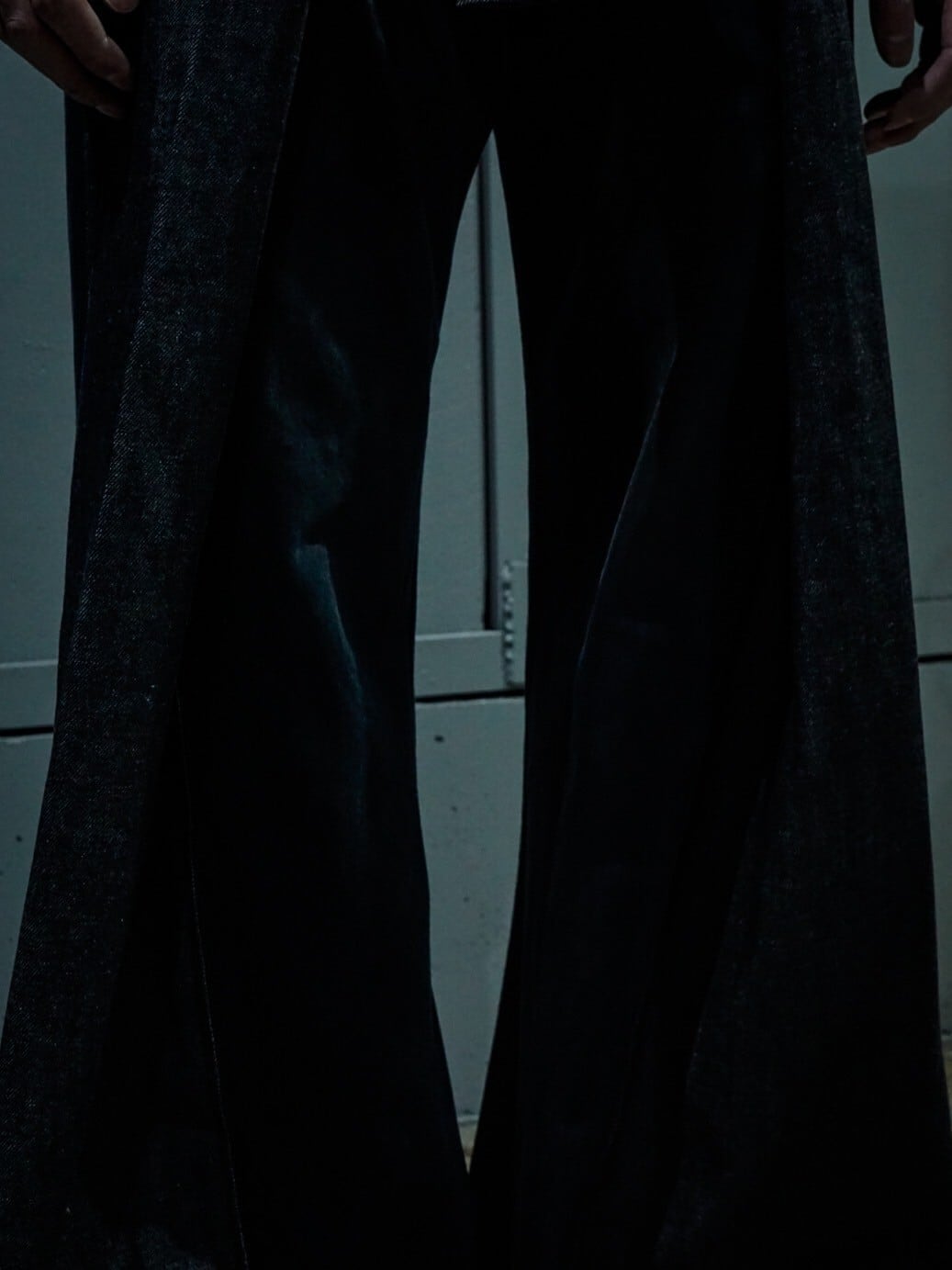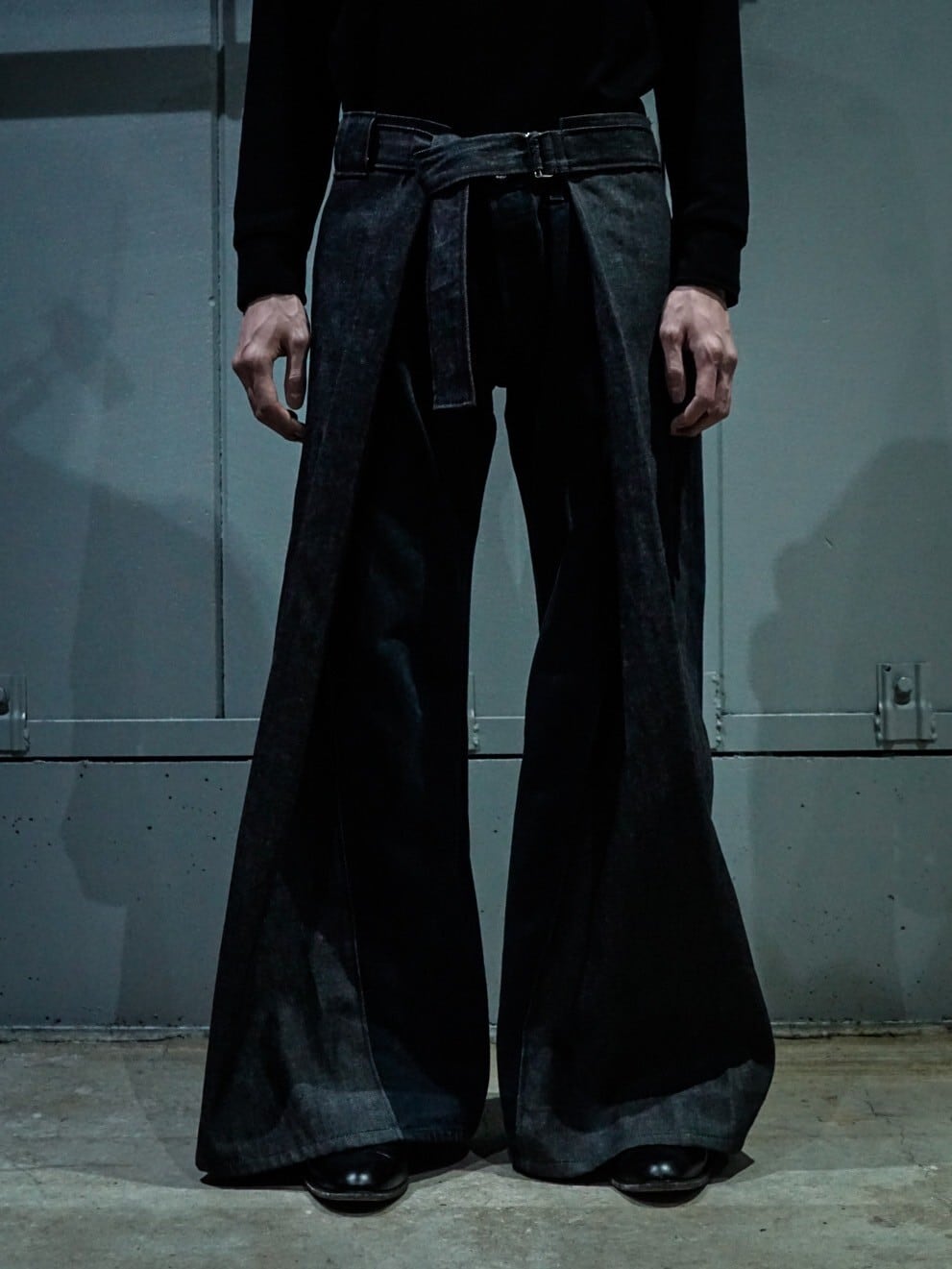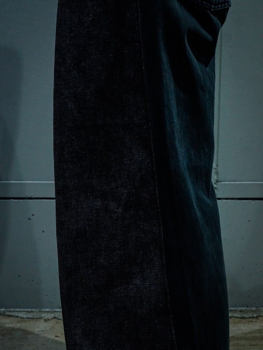 ベルト部分にはドローコードを搭載。2種のデニムを用いた色のコントラスト、デニムのハリ感から生まれる立体的なシルエットがめちゃくちゃ良いんです。