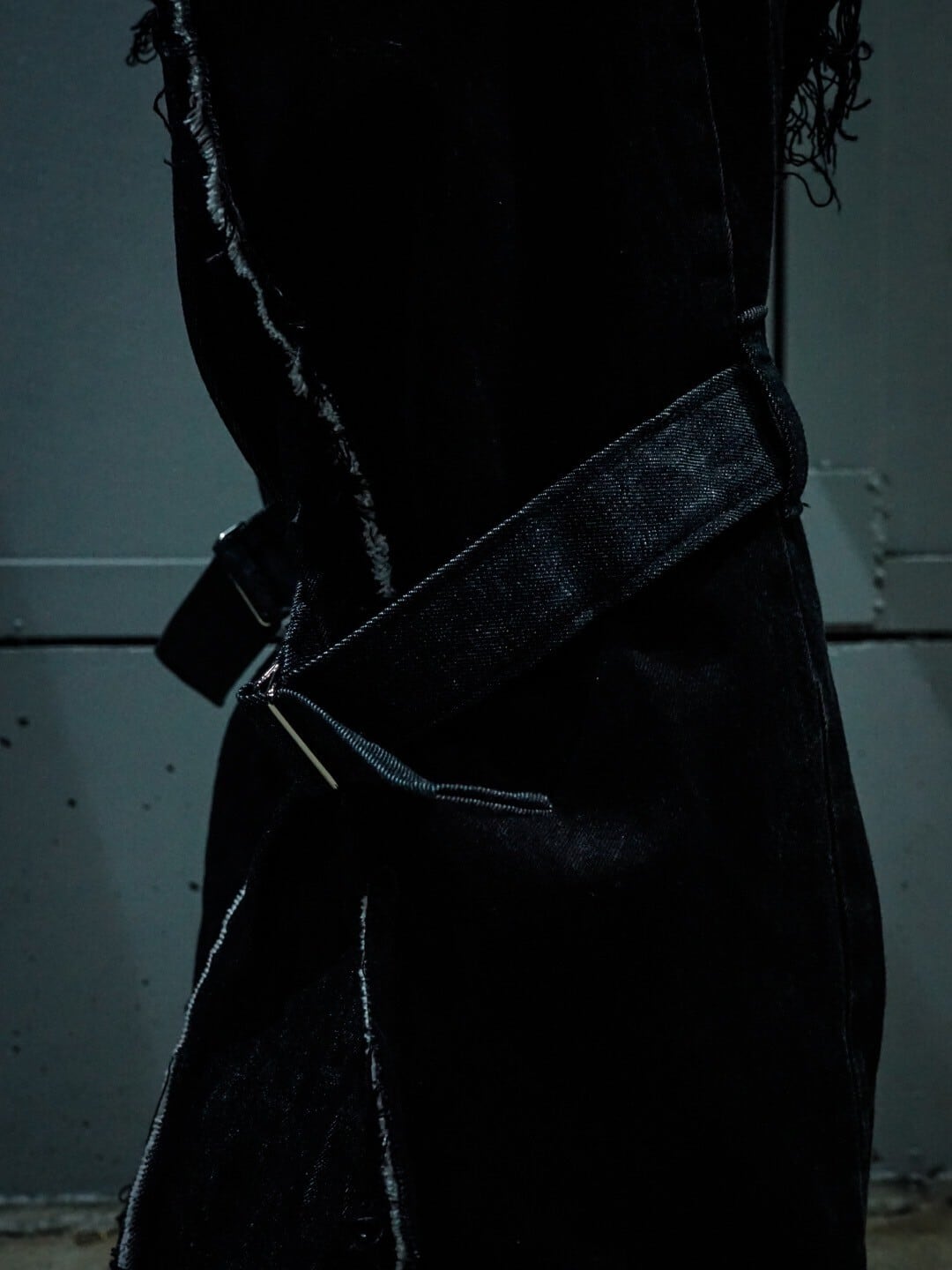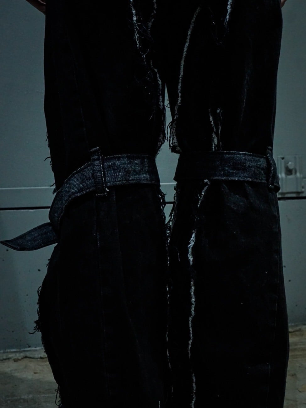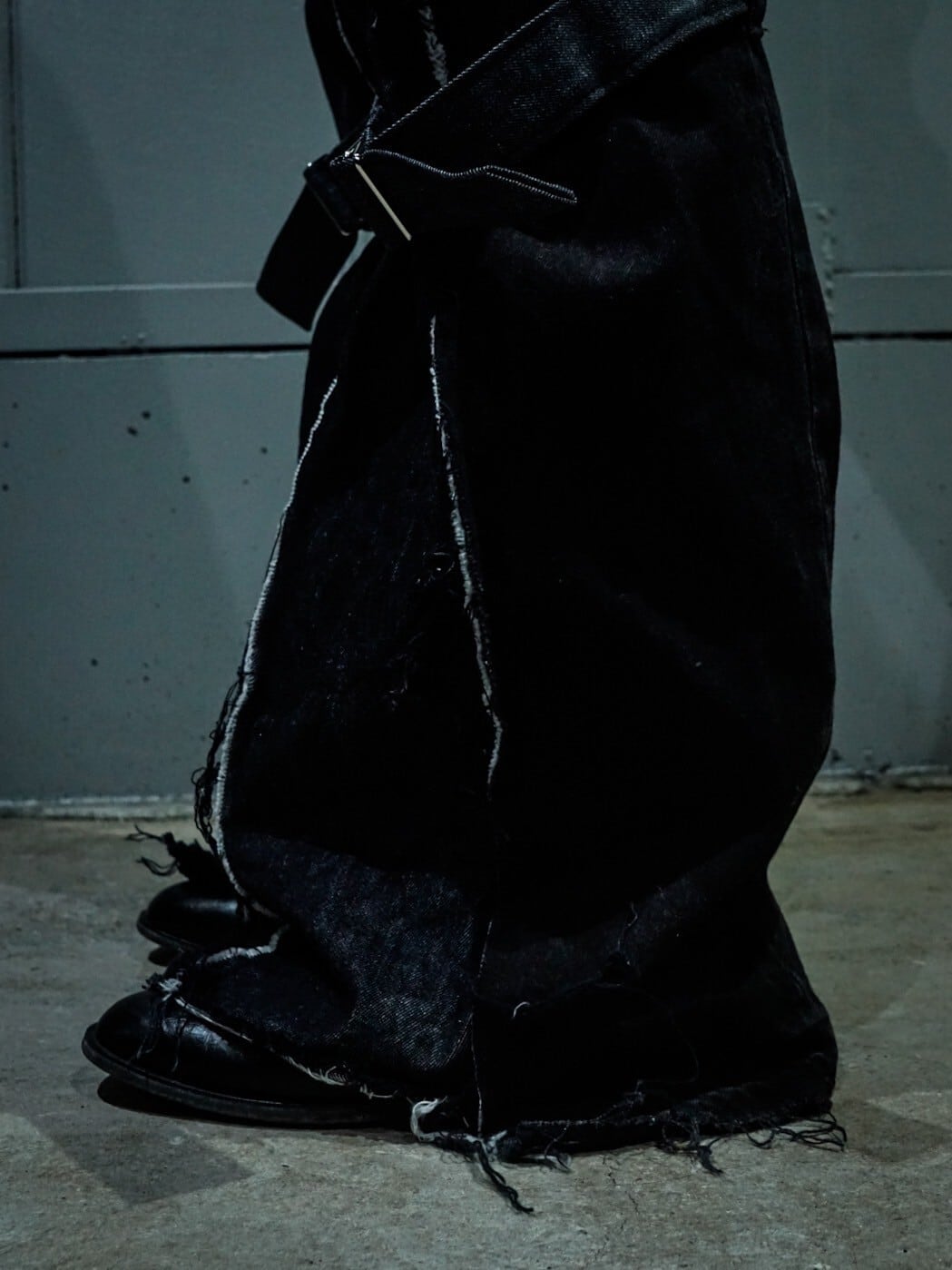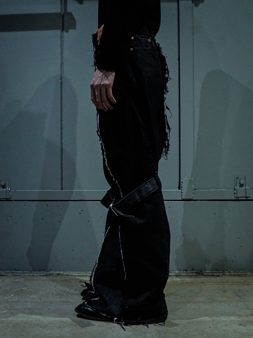 ボンテージベルトを膝部分に施したことで、裾広がりの美しいシルエットをお楽しみいただけるのは勿論、ギュッと絞ることでさらにフレアシルエットに緩急を付けることが可能。デザインとしても非常にイケてます、、、