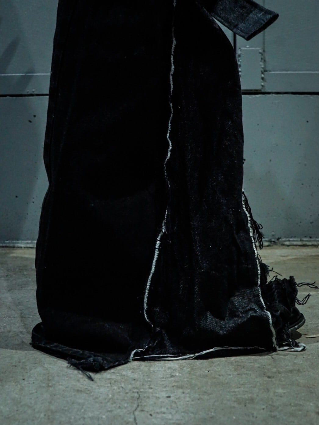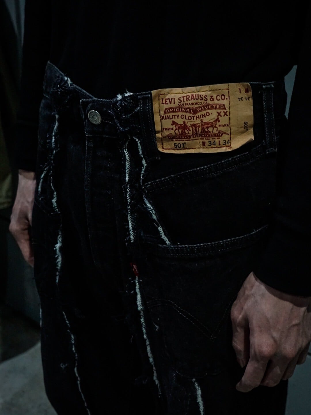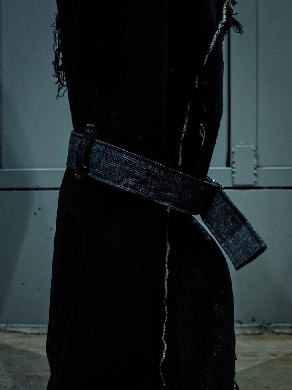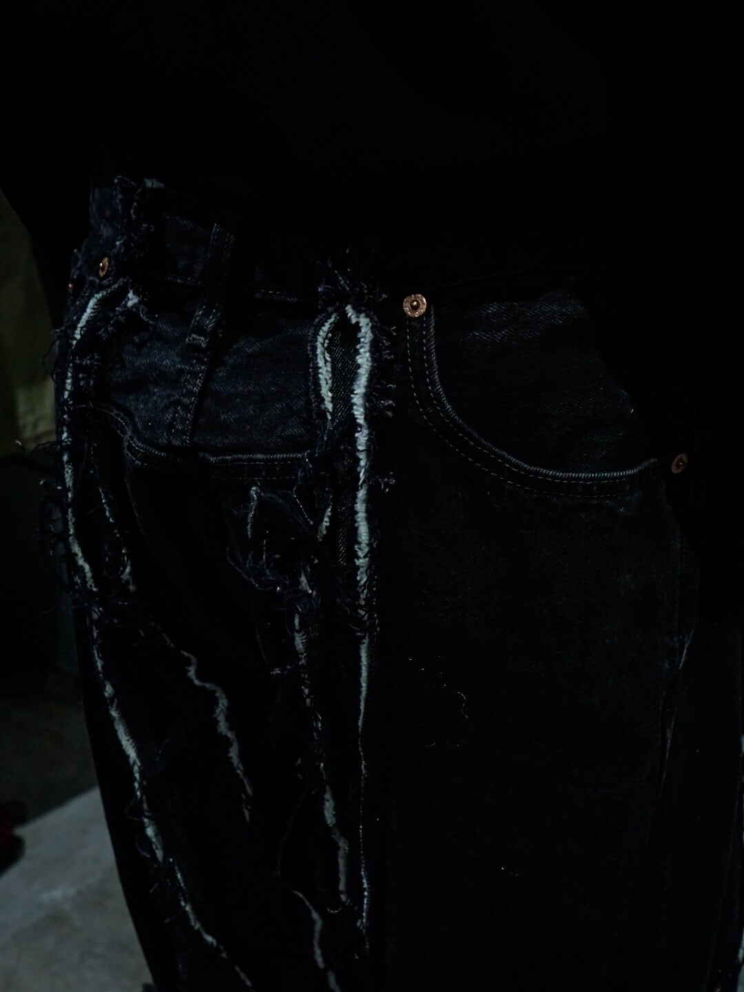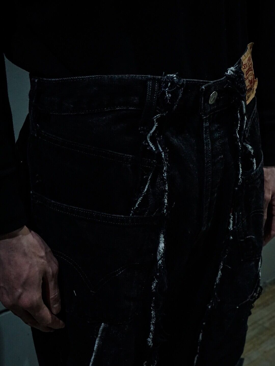 古着業界でも稀少性が高くなったブラックデニムをベースに、レディースのジャケットに用いられるパネルパターンを用いてさらにレイブシルエットへと改造した方1本。