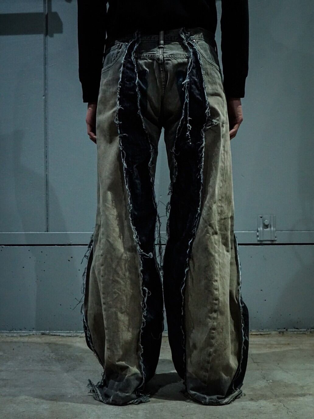 フェード感が非常に良いデニムのボディをベースに、レディースのジャケットに用いられるパネルパターンを施しレイブノリのバギーシルエットへと改造したスペシャルな1着。