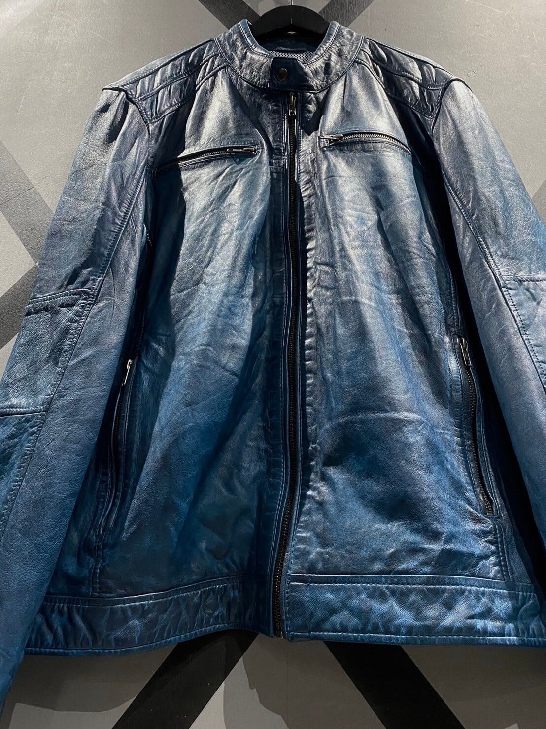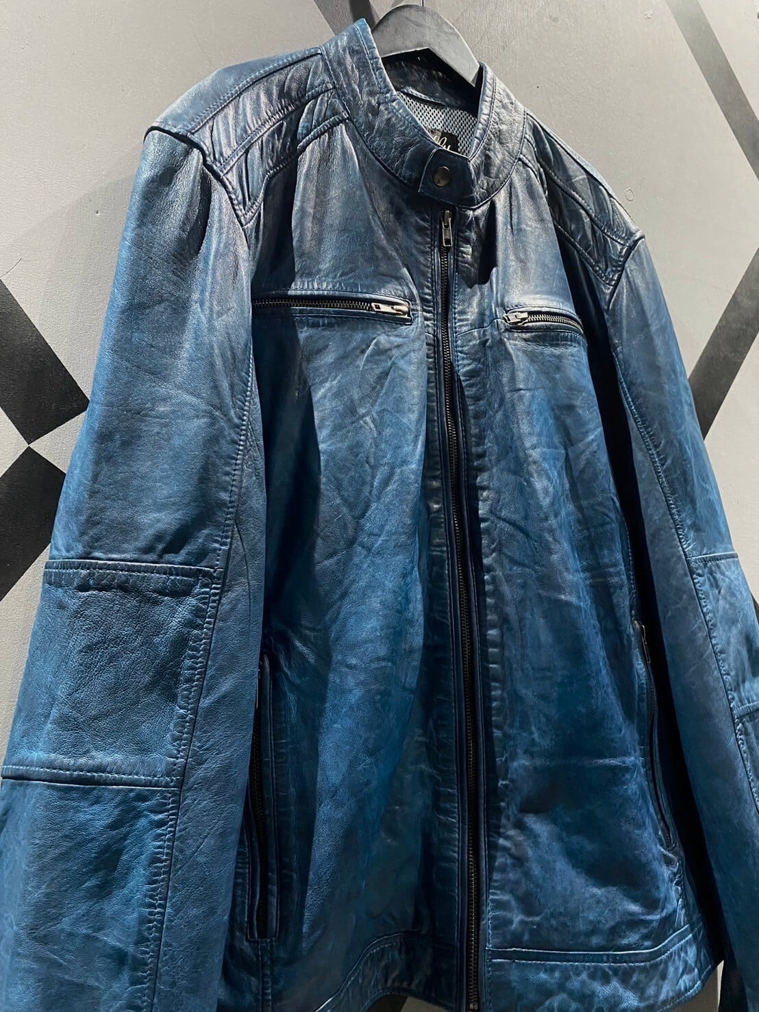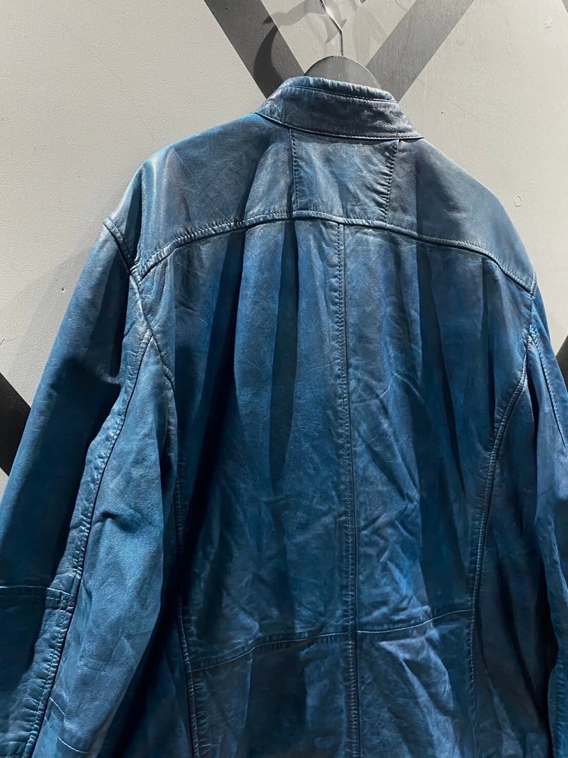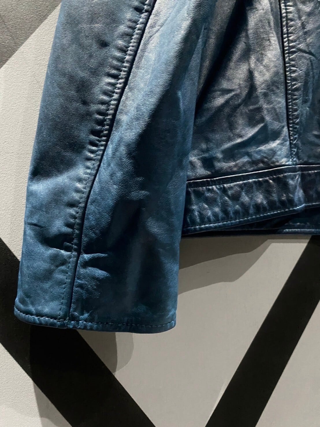 稀少なブルーのカラーレザーを用いて、シングルのライダース型に落とし込んだスペシャルなレザージャケット。