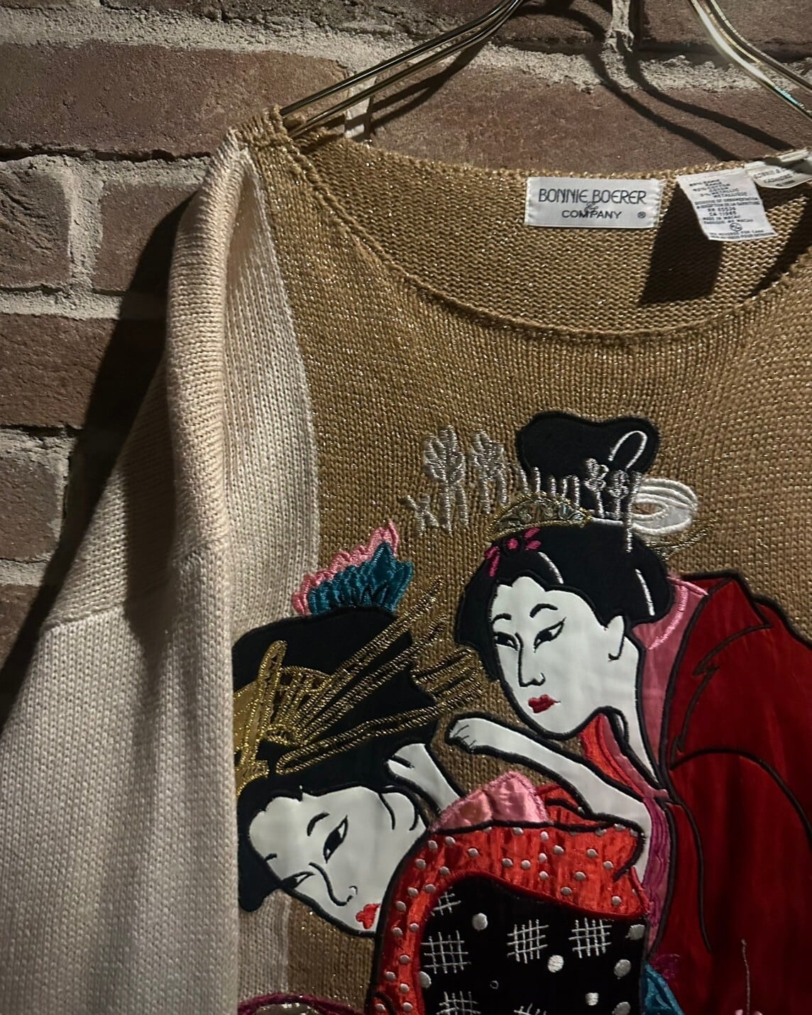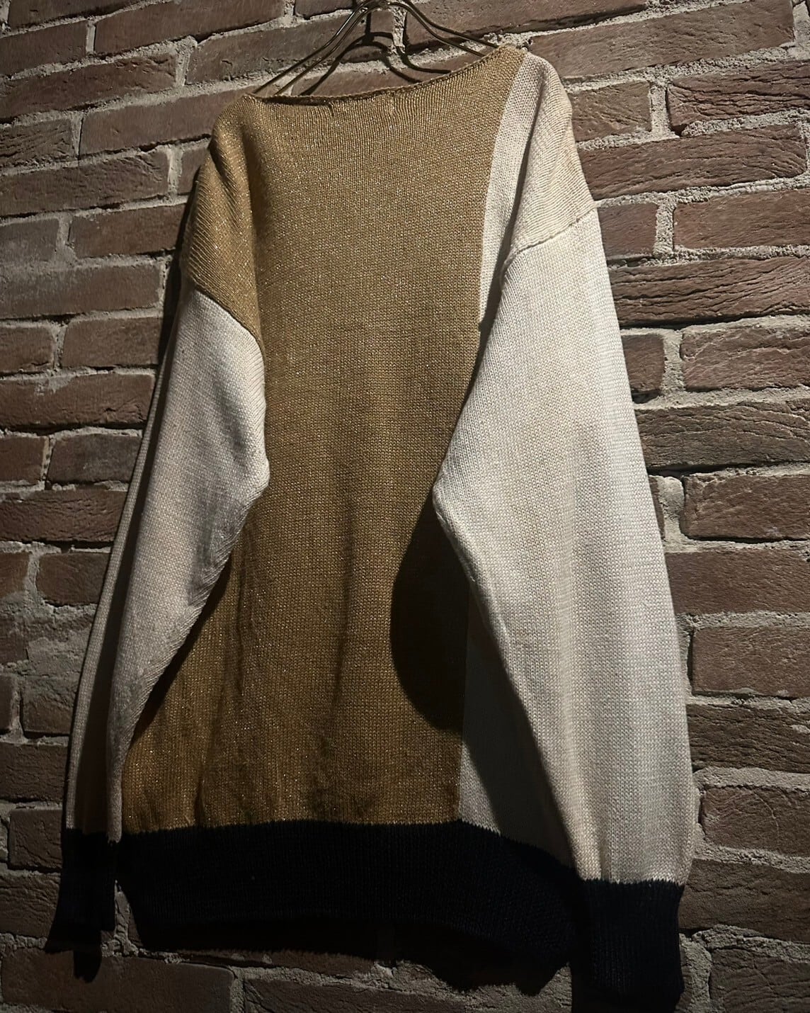 ベージュ、オフホワイト、黒のカラーリングで切り替えたボディに、ツルッと滑らかで上品な光沢を放つサテン生地を用いて"和"なデザインを落とし込んだニット。
