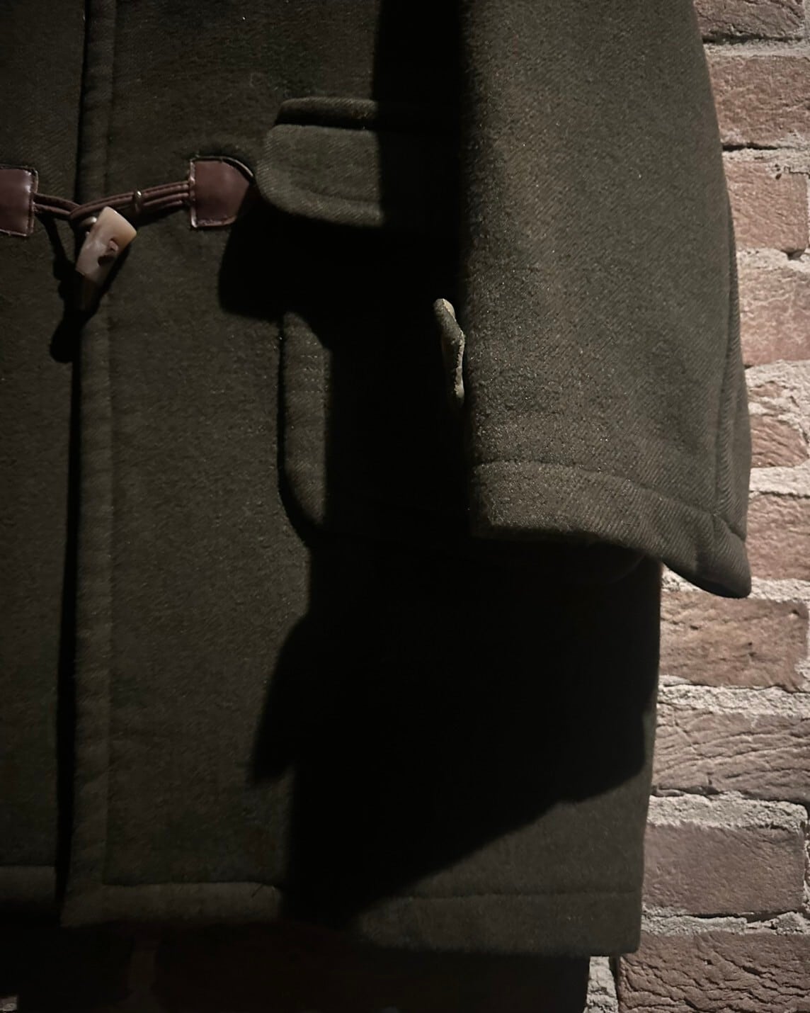 深みのあるモスグリーンで、落ち着きのある雰囲気に仕上げられたダッフルコート。