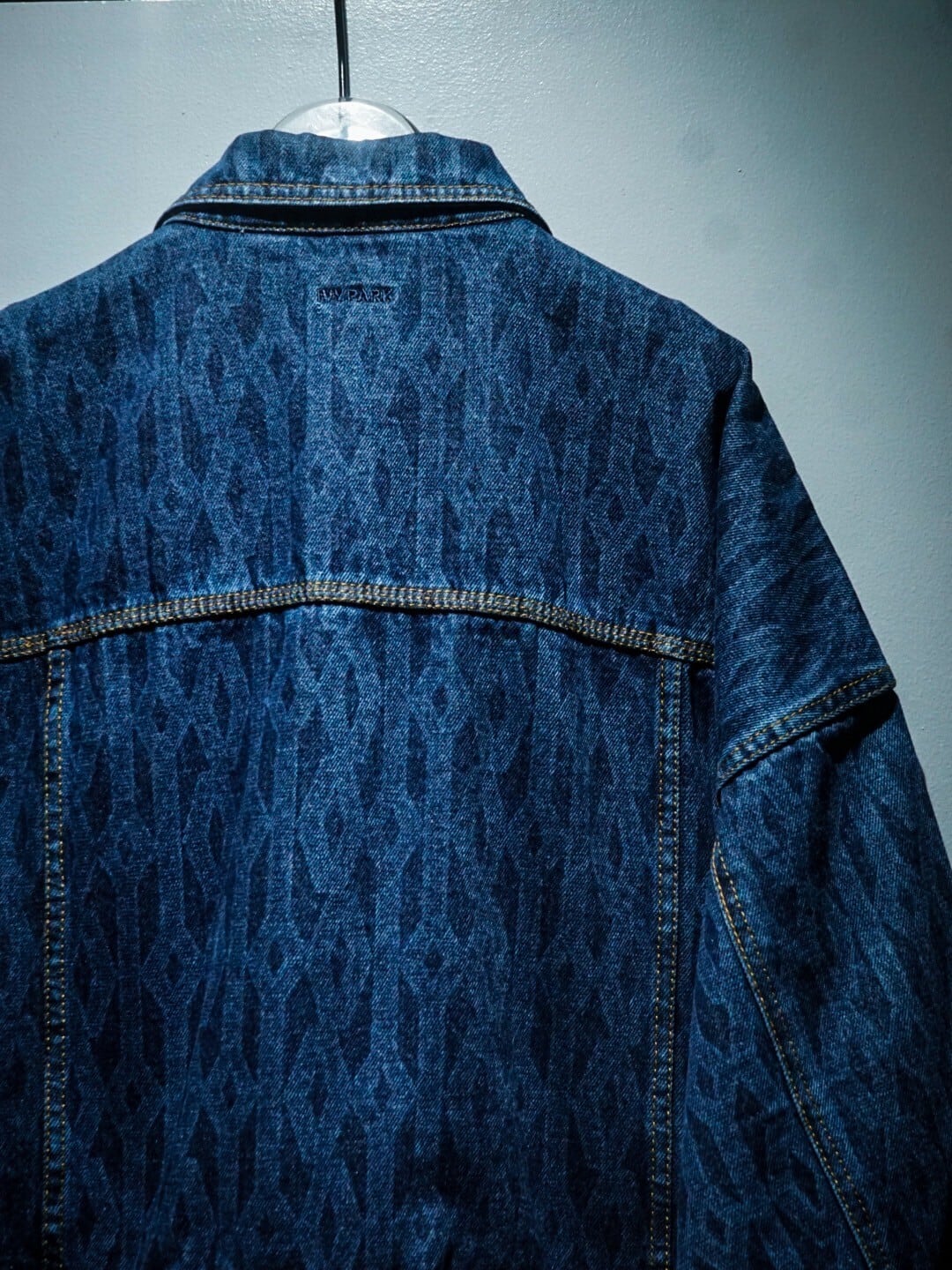 モノグラム調の柄をボディ全体に載せ、2つのデニムジャケットを繋ぎ合わせたような、ドッキング風デザインで仕上げられたデニムジャケット。
