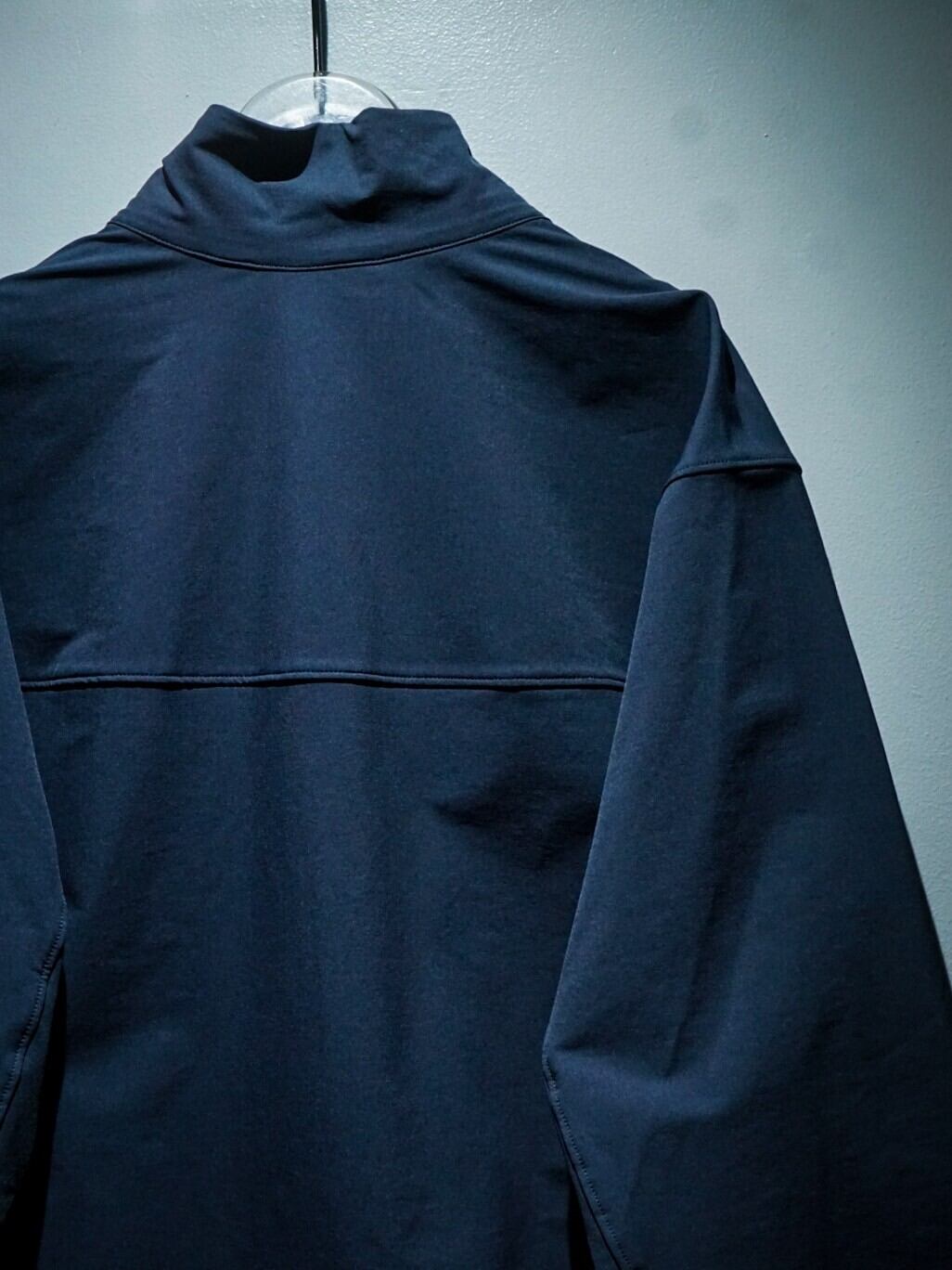 無機質なボディの質感に、高く設計されたハイネックの首周り、そしてソリッドな切り替えの入りも相まって、ミニマルな出立ながらも洗練されたテクニカルな表情を見せる1着。