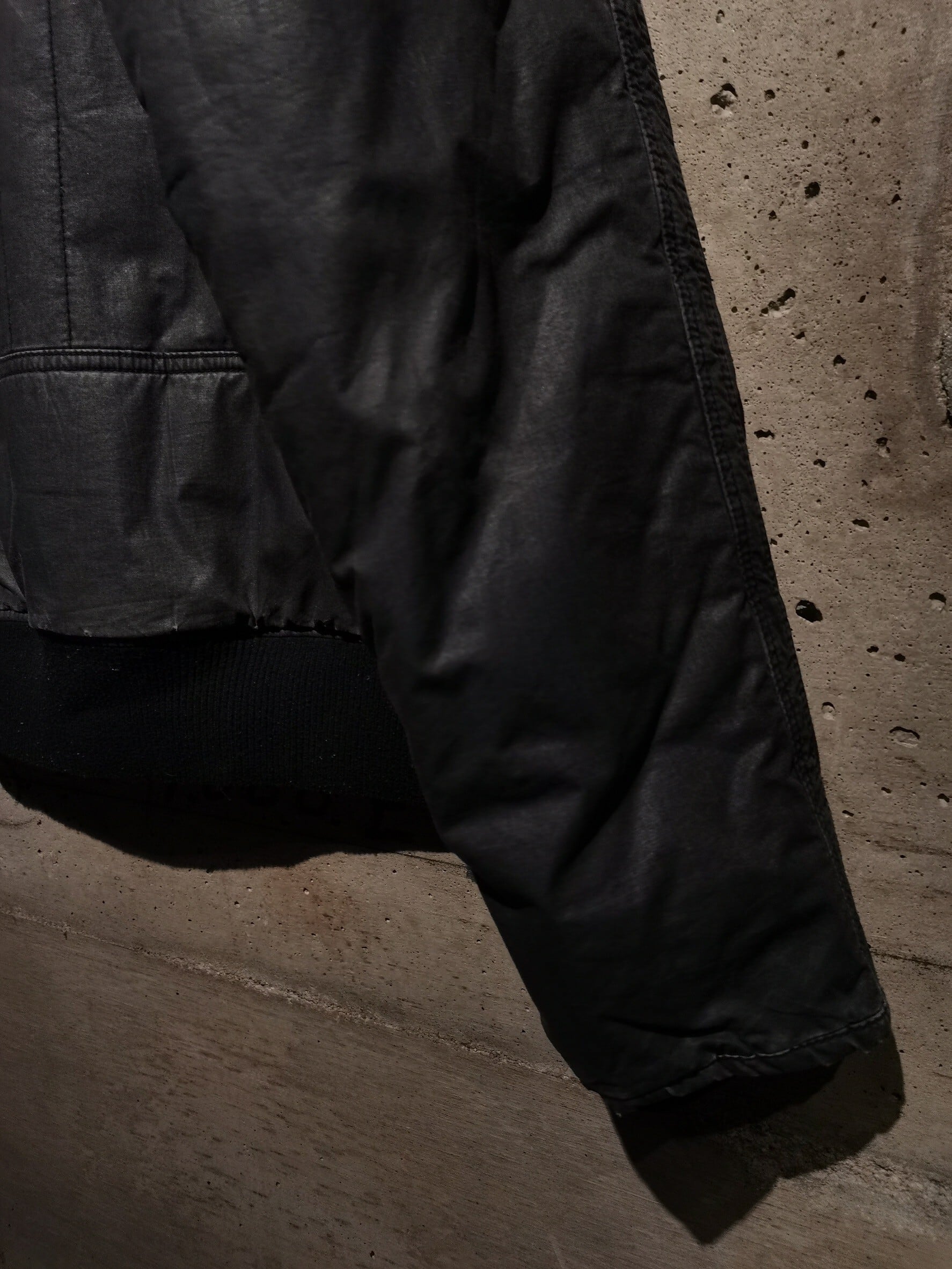 深みのある表情を見せる墨黒のボディに、右胸にシルバーの糸を用いたロゴ刺繍を刻み込んだパデッドジャケット。