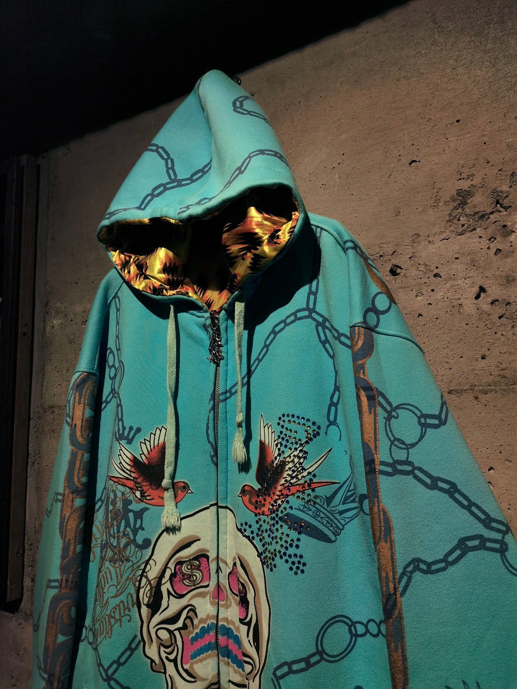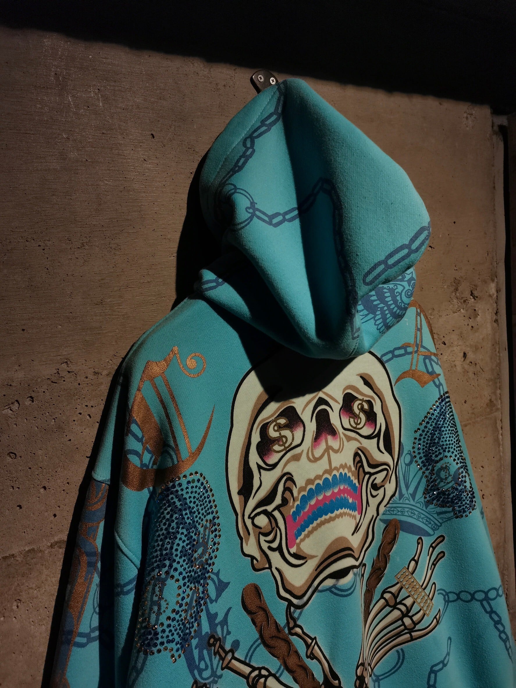 鮮やかなライトブルーのボディに、チェーンやスカルのプリントをあしらった、抜群の存在感を見せるジップフーディー。