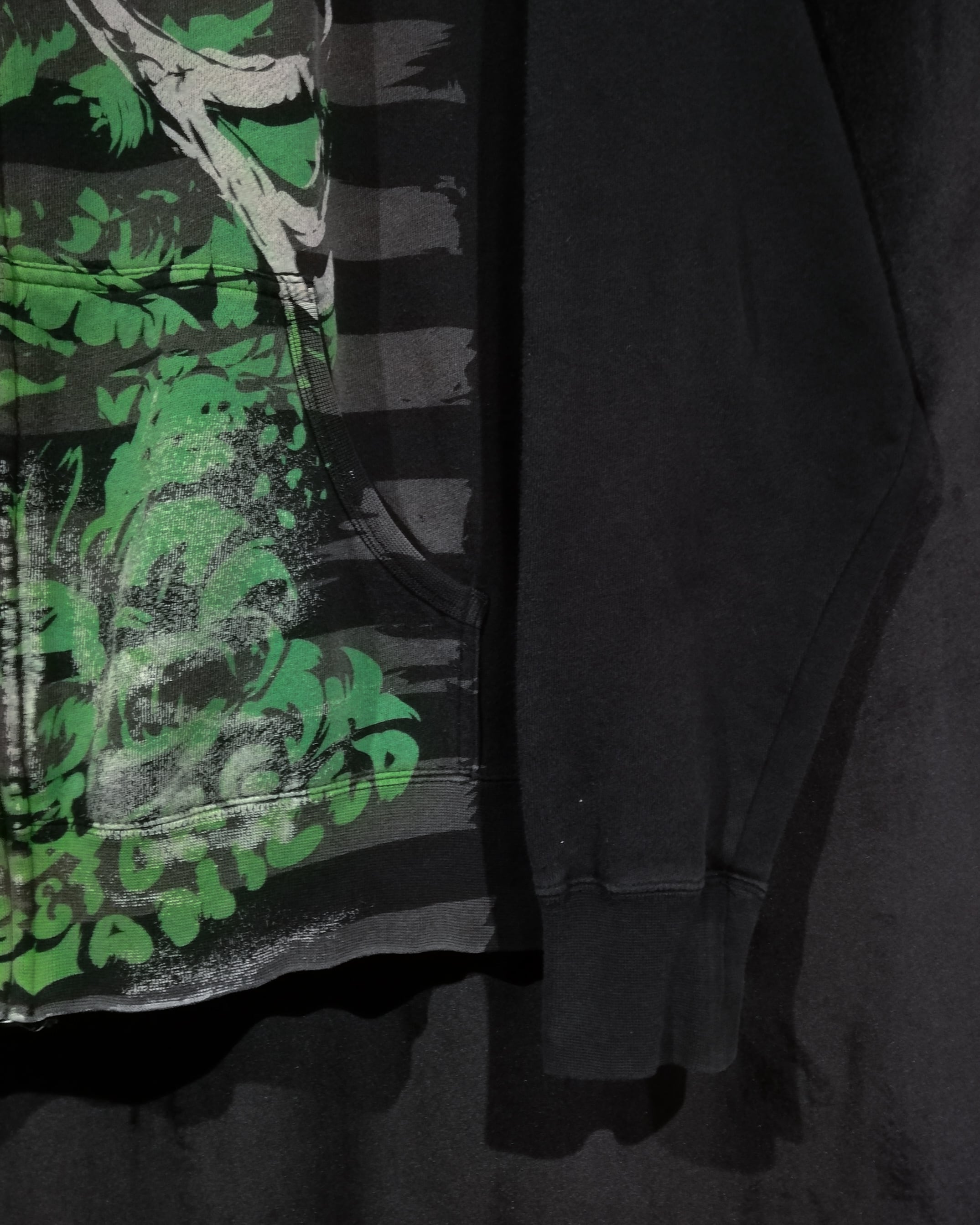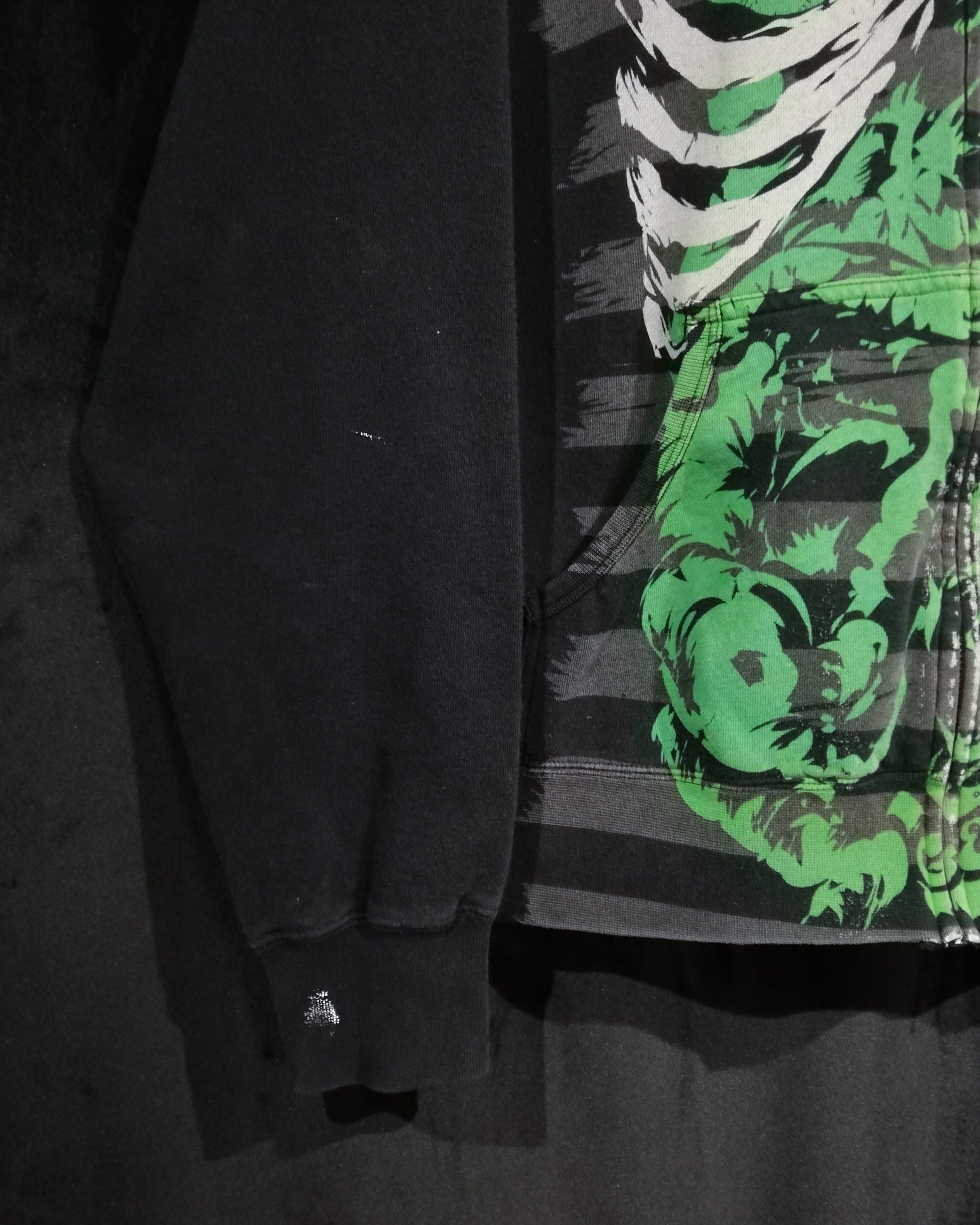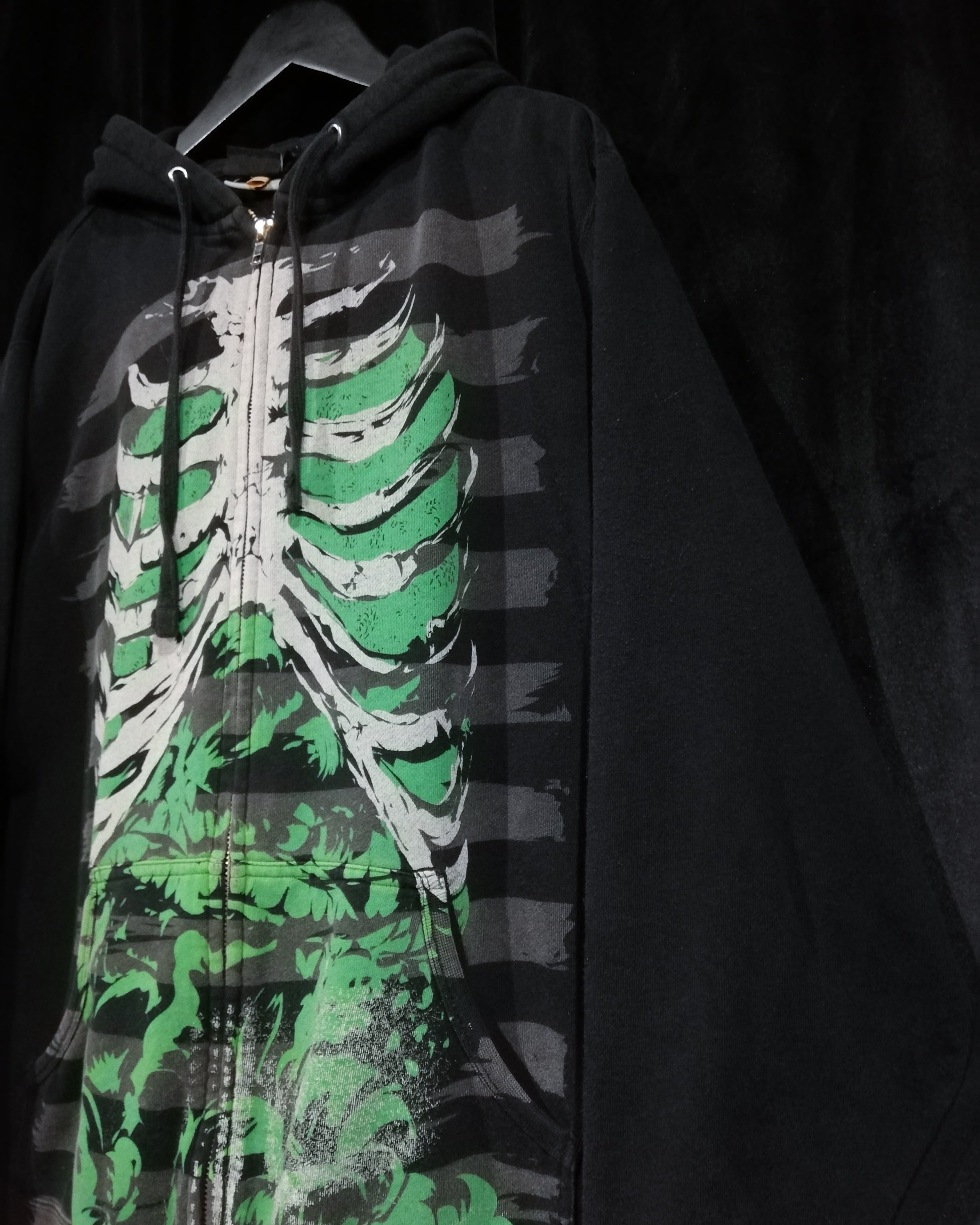 ブラックのボディに、フロントにスケルトンのデザインを載せたジップアップフーディ。