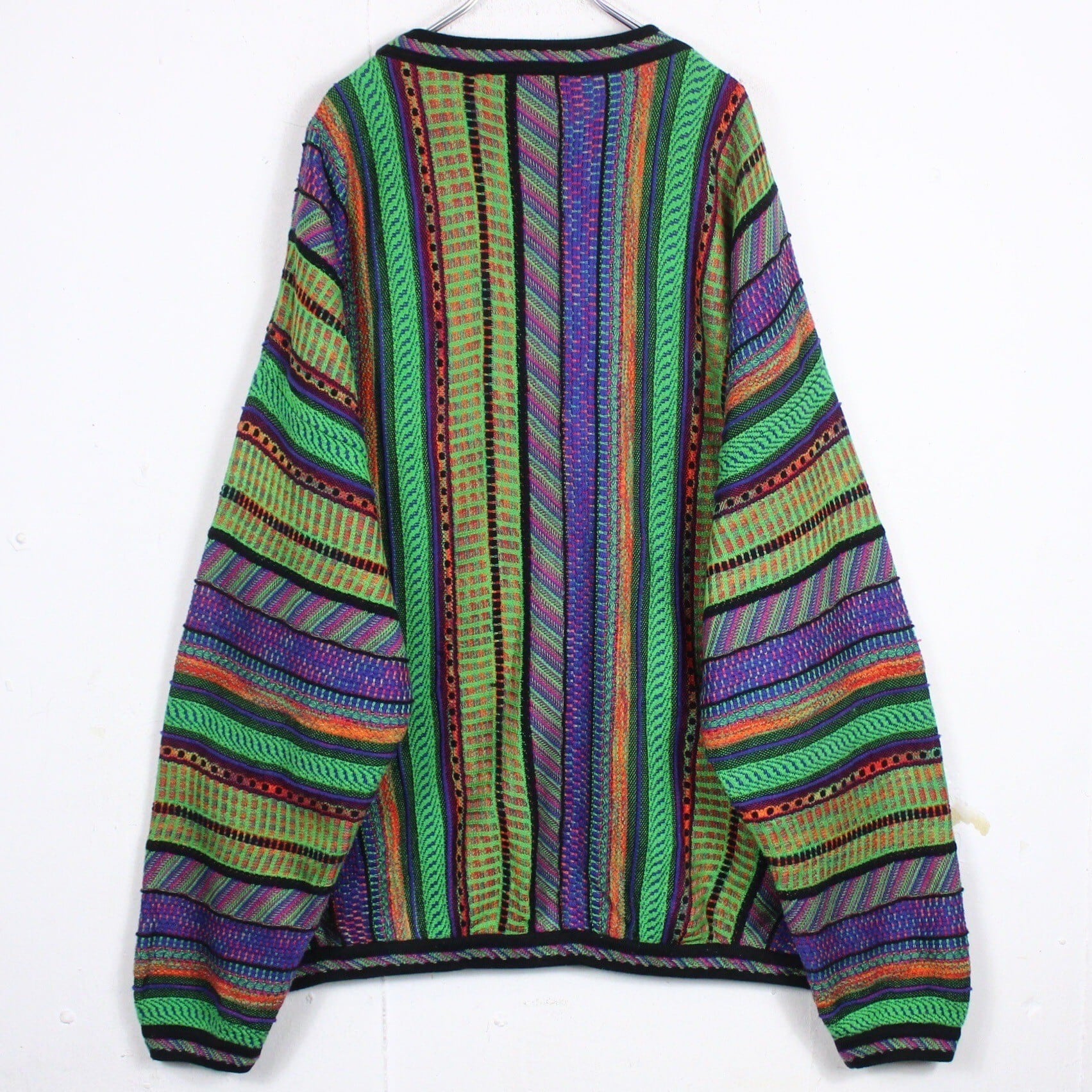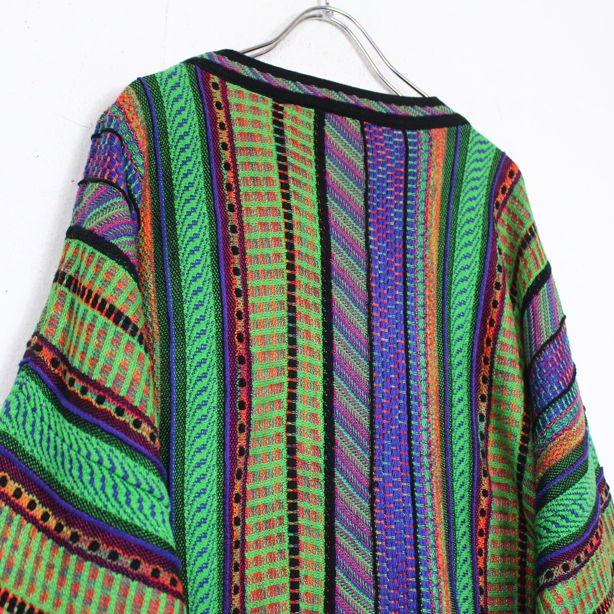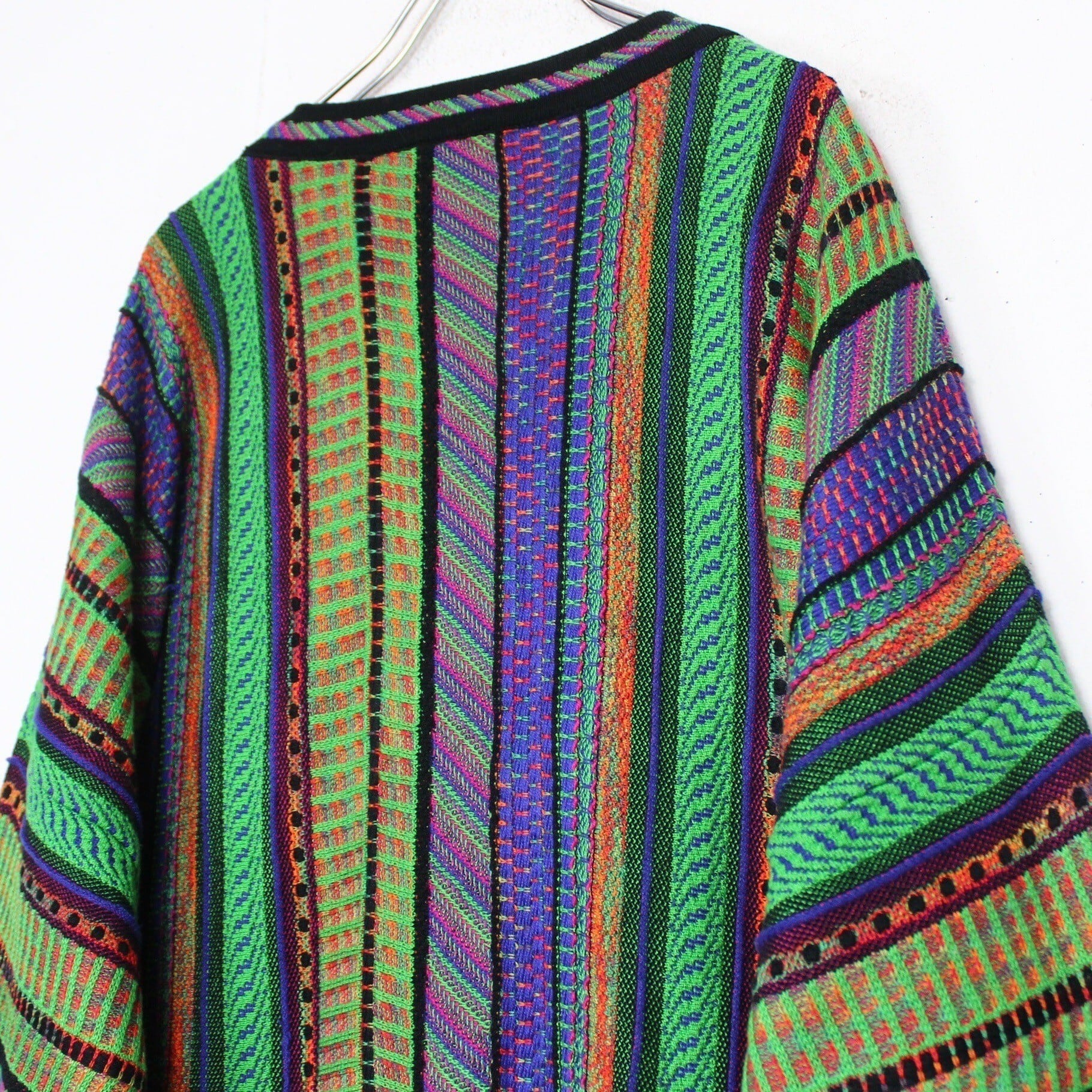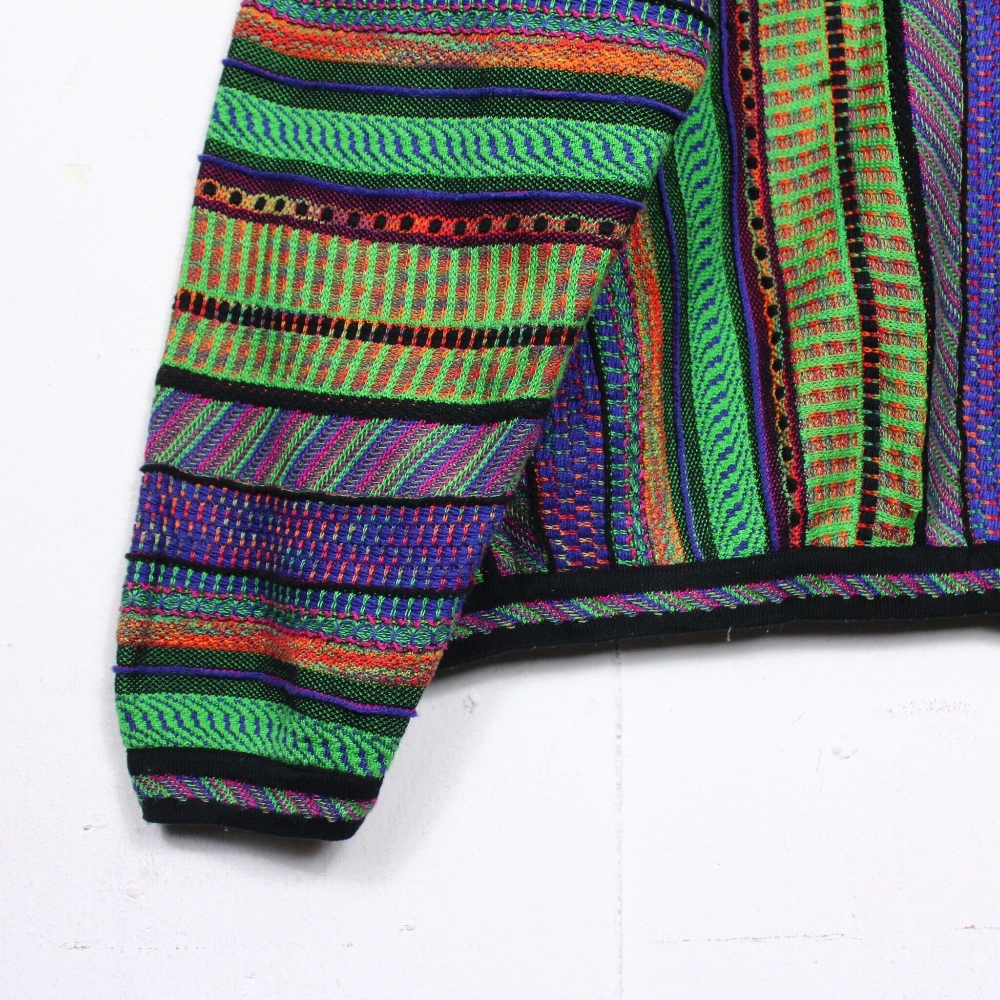 鮮やかなカラーリングを用いた、複雑な多色使いによって仕上げられた、サイケデリックな雰囲気を漂わせるプルオーバーニット。