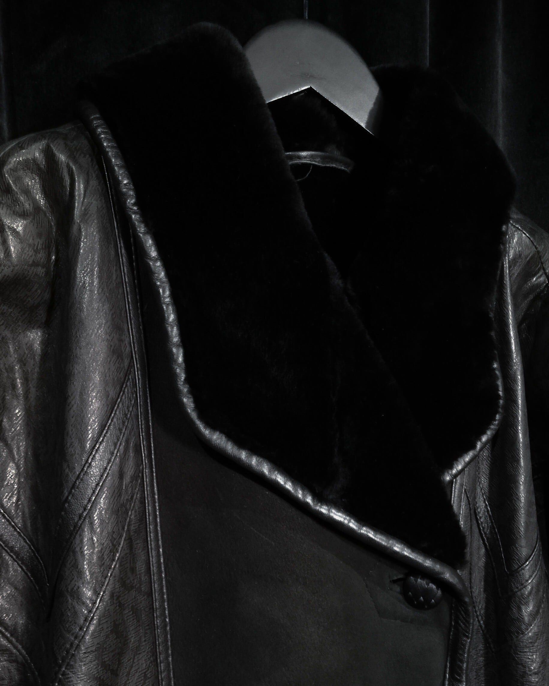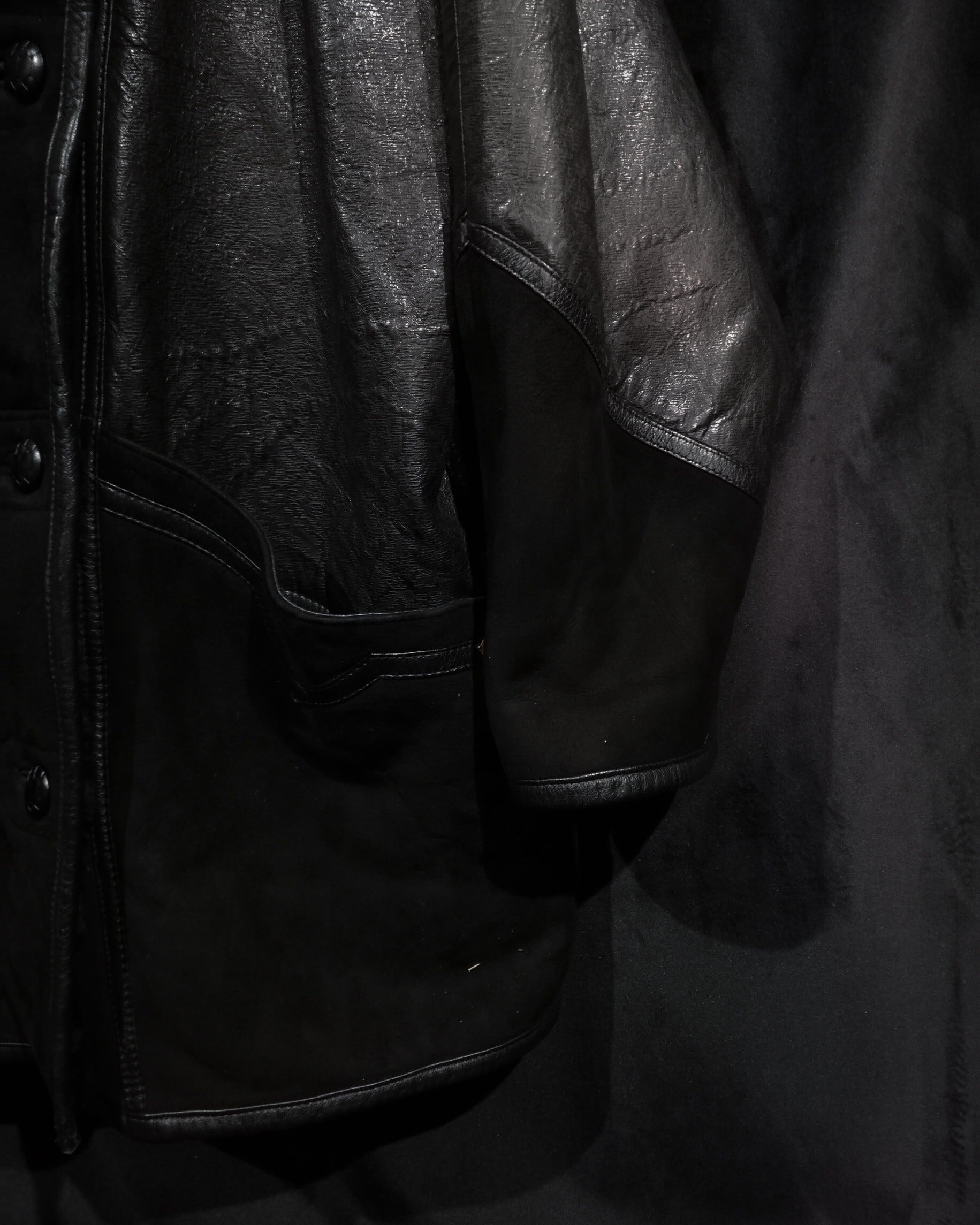 ハリを持ちながらも柔らかく、しなやかな質感に仕上げられた極上のブラックレザーをベースに、もっちりとしたフェイクムートン、毛足の長いもっふもふのフェイクファーで切り替えを施したミドル丈のコート。