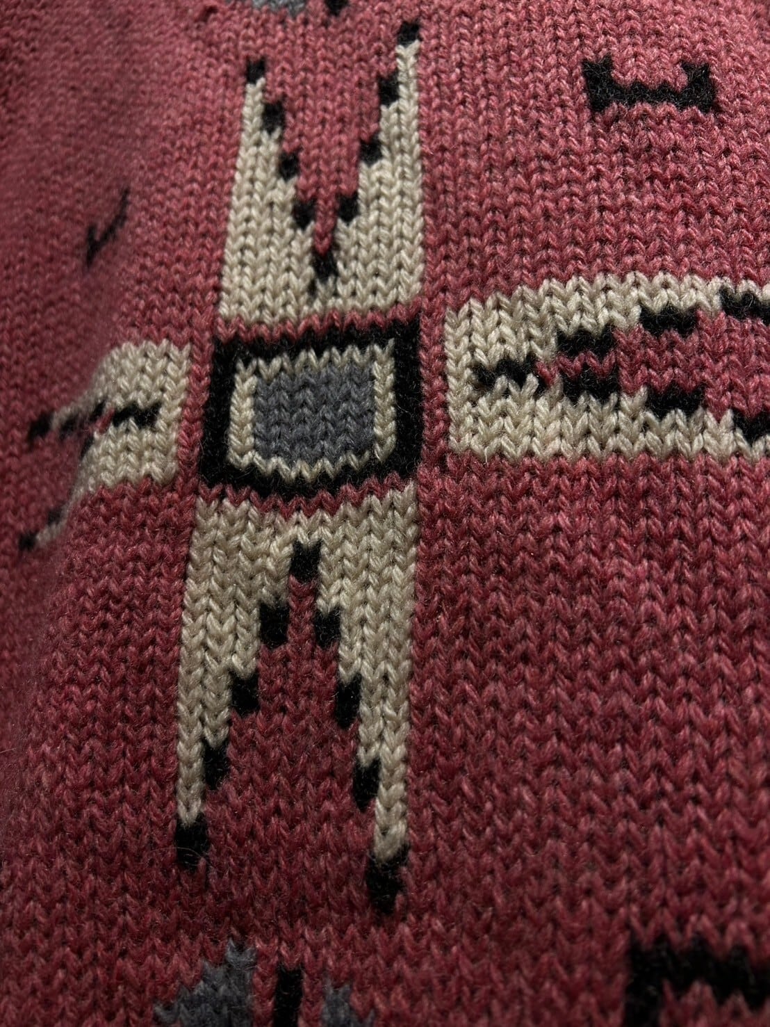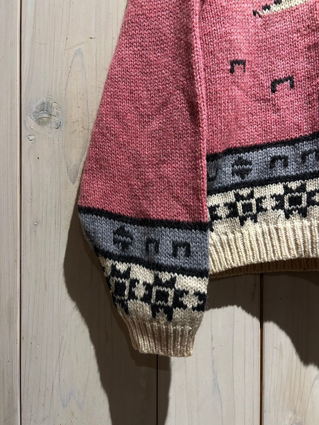 柔らかなピンクをベースに、アイスグレー、ホワイトを切り替え、ネイティブ柄を載せたニット。