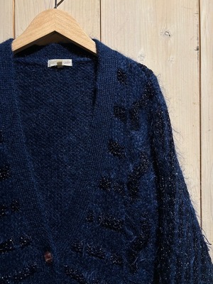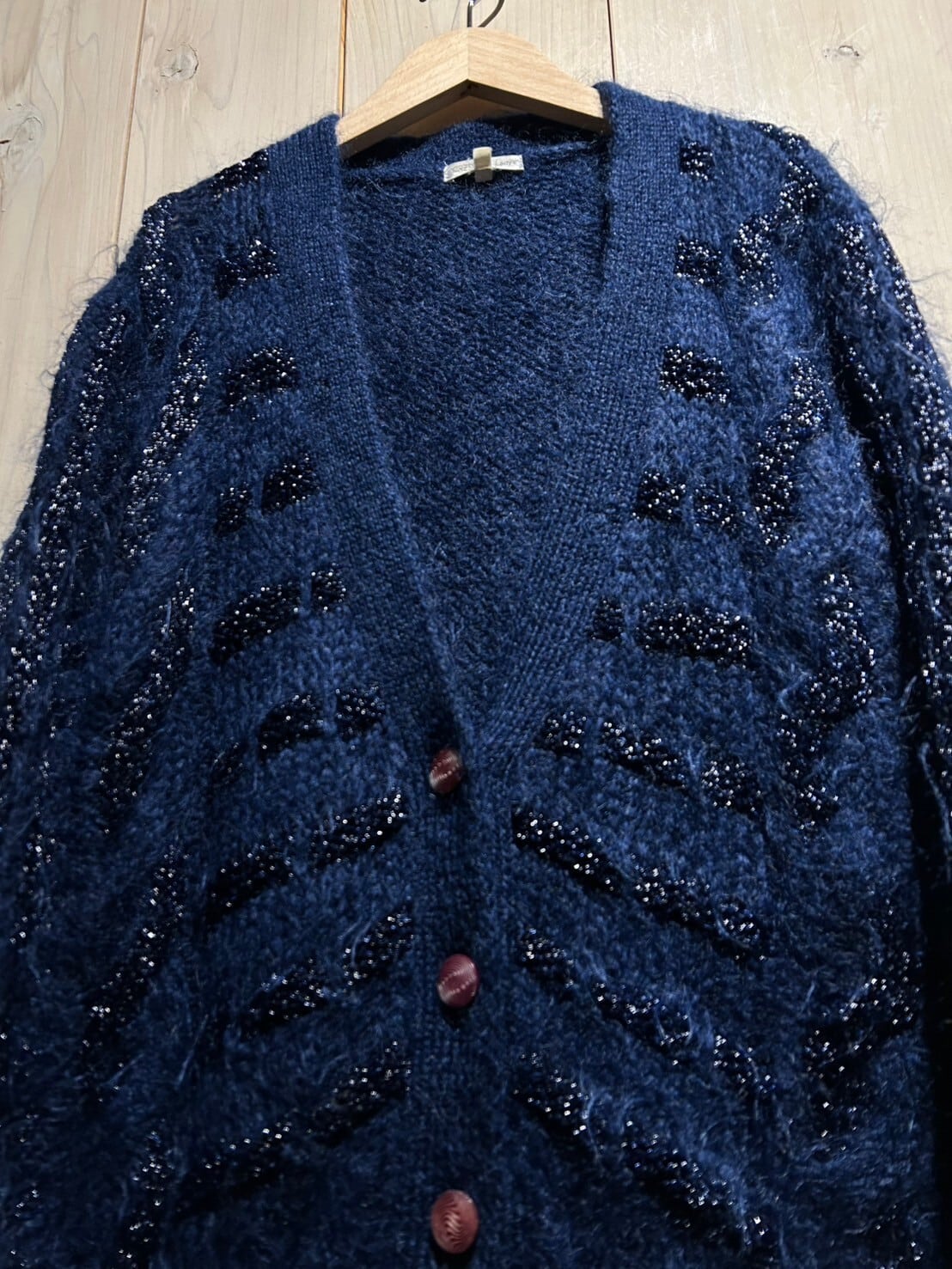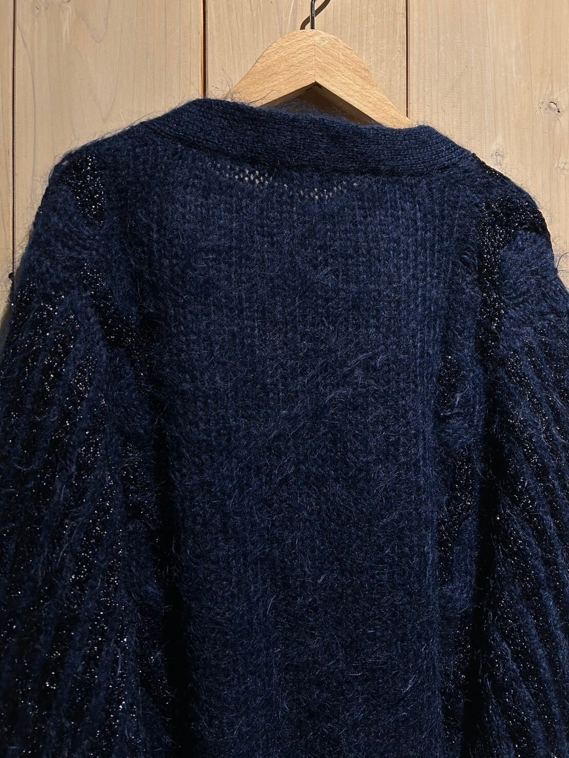モヘア素材のアイテムでは珍しいネイビーをベースに、ブラックのラメを編み込んだ糸でボーダー状のデザインを配したニットカーディガン。ラメによってベースとのコントラストが生まれ、それによって黒のボーダーが浮き出る見た目になり、立体感を併せ持った超イケたデザインに。