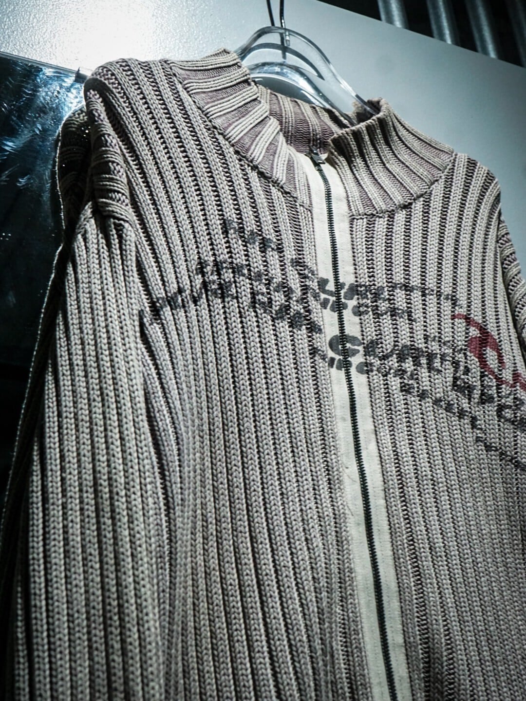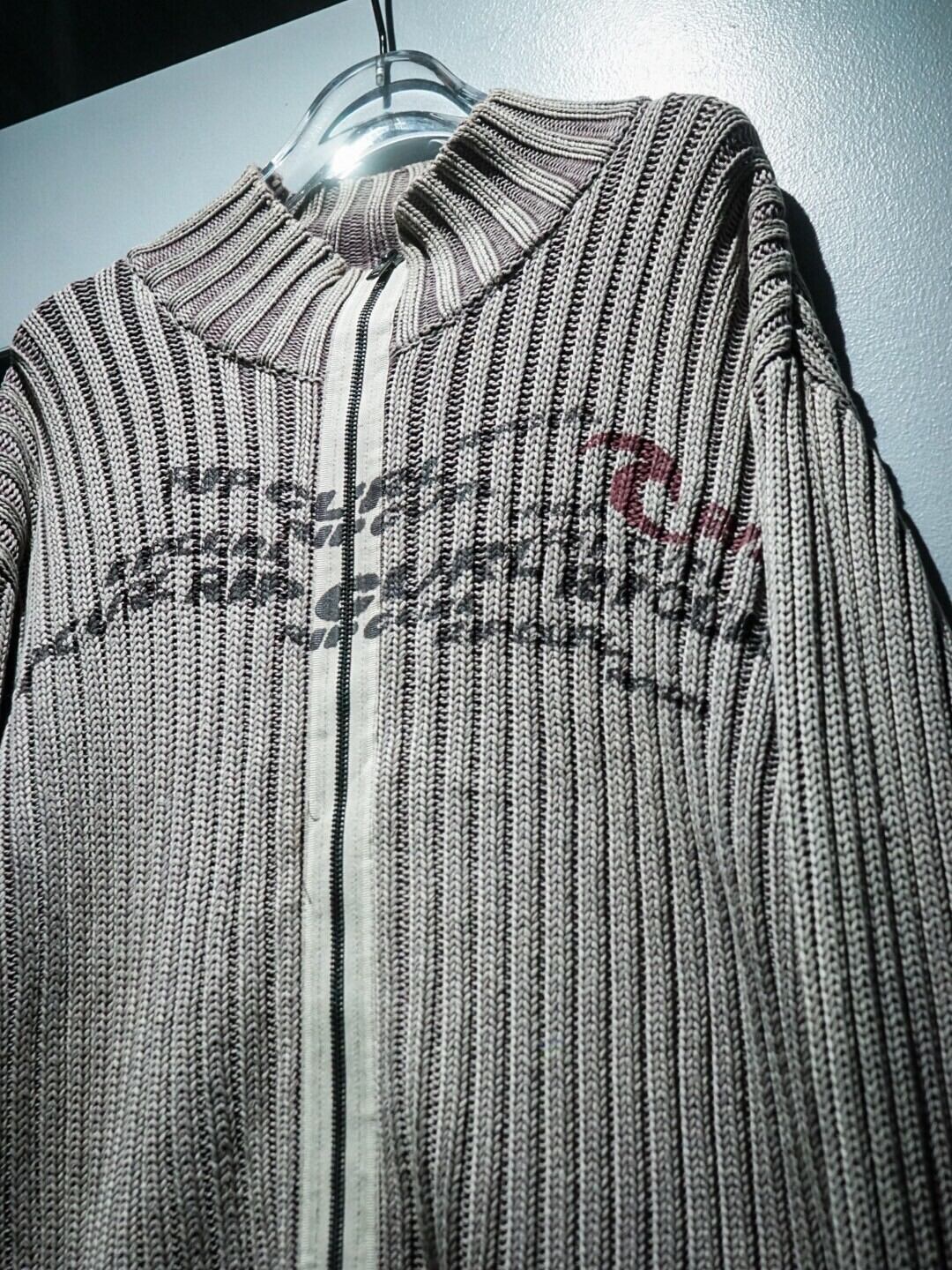 燻んだ薄紫の糸を混紡したベージュのリブニットのボティに、ブランドネームを載せたドライバーズニット。