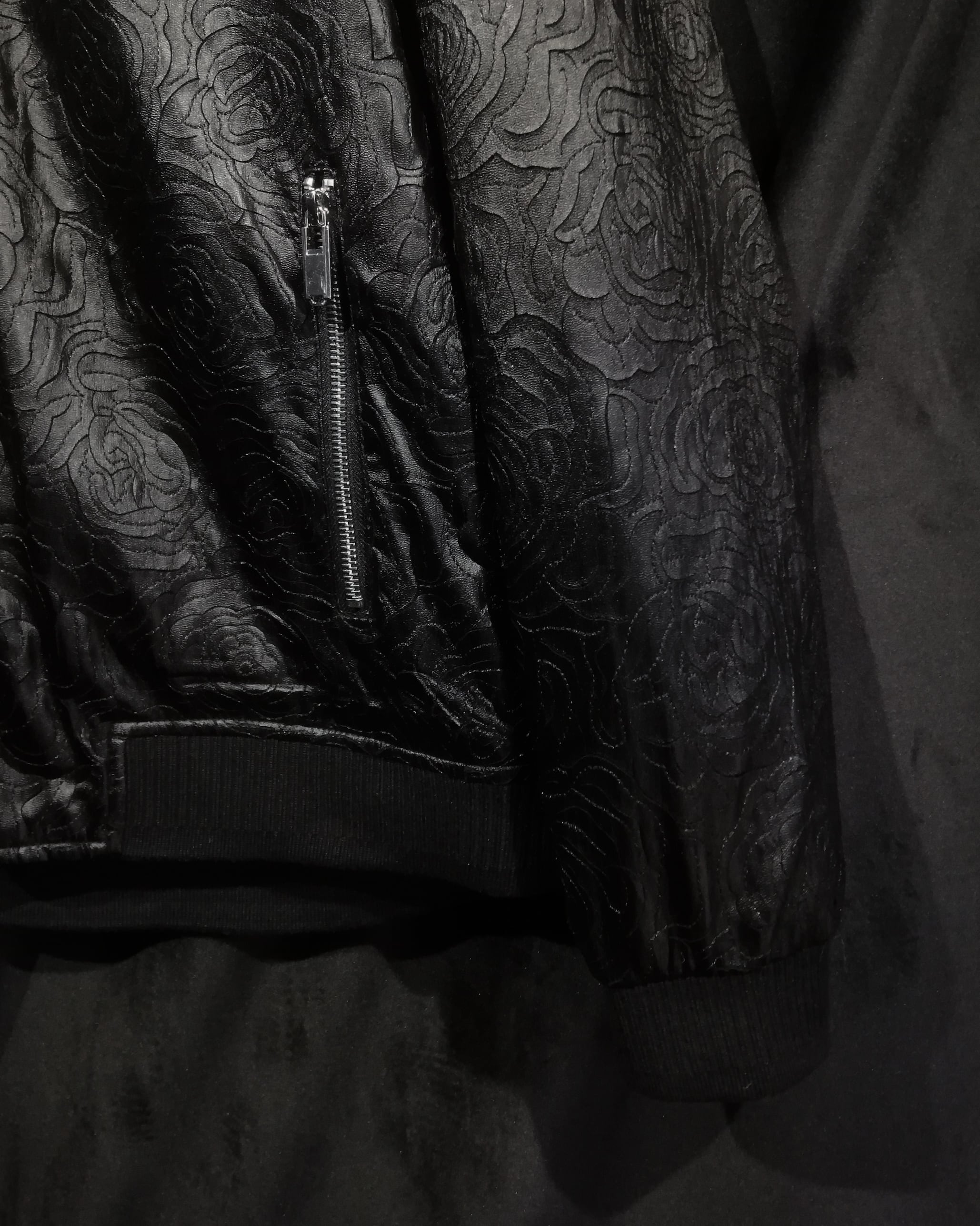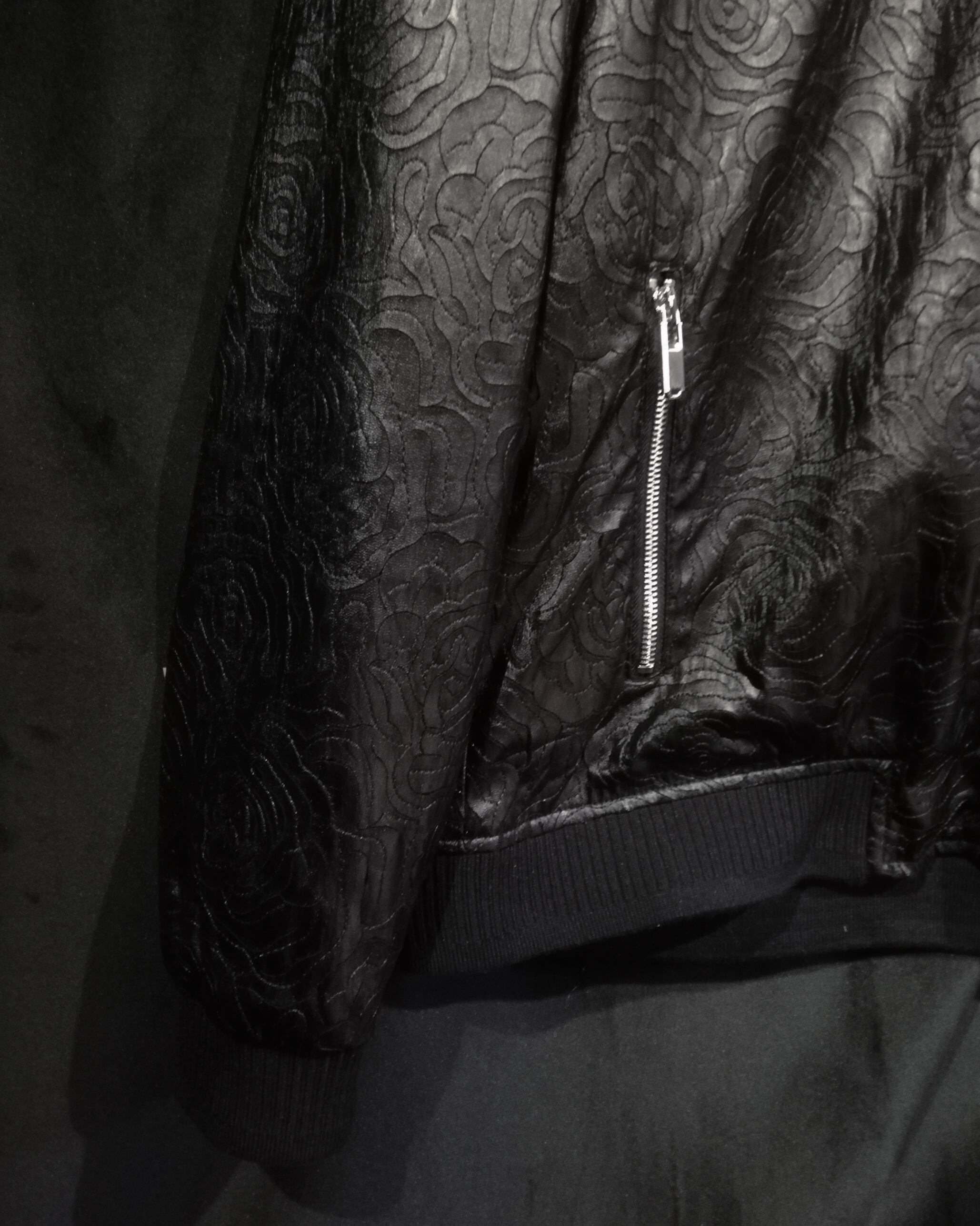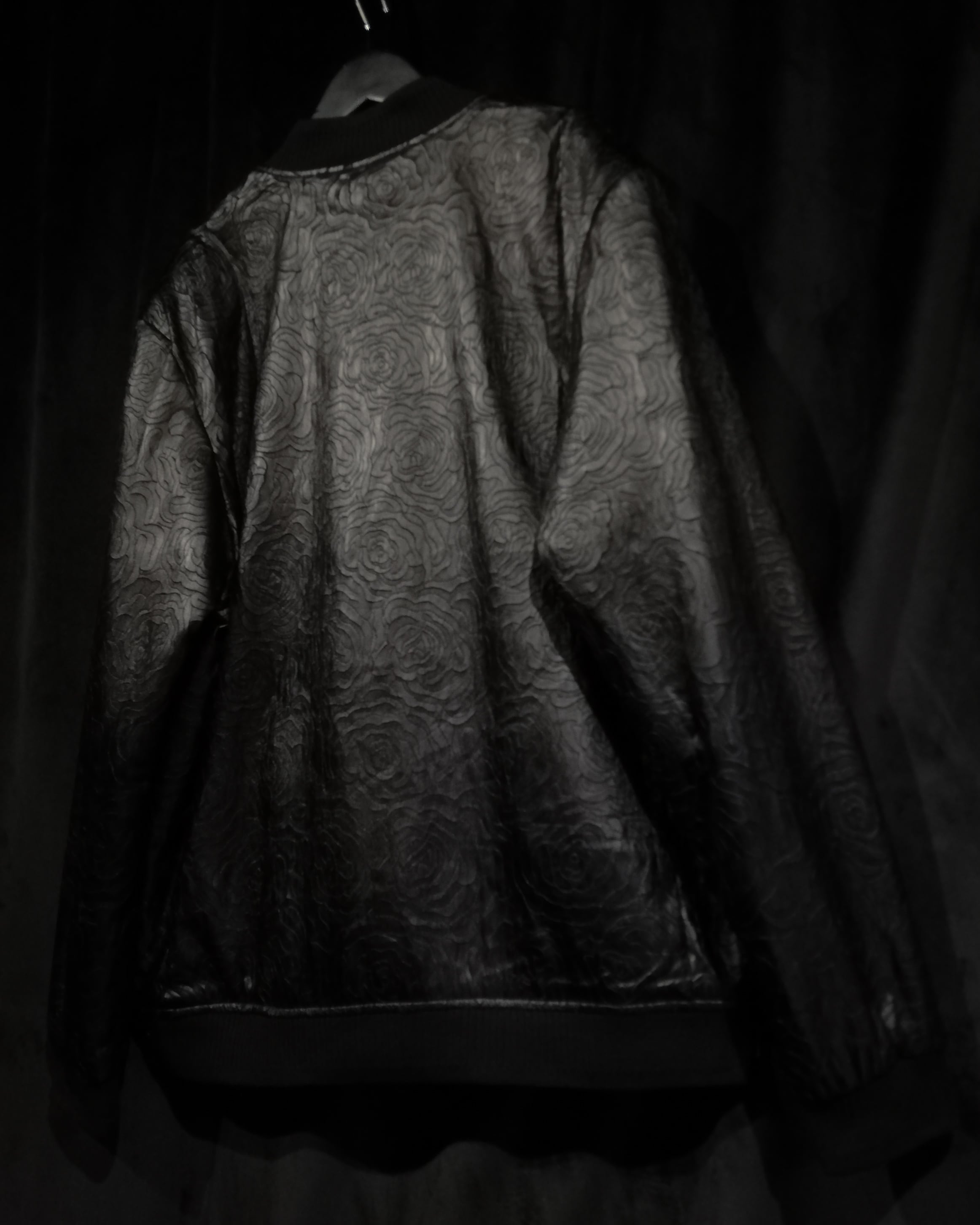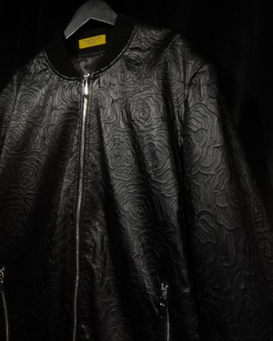 鋭い光沢を放つブラックボディに、美しい花柄の刺繍デザインを全面に載せたブルゾンジャケット。
