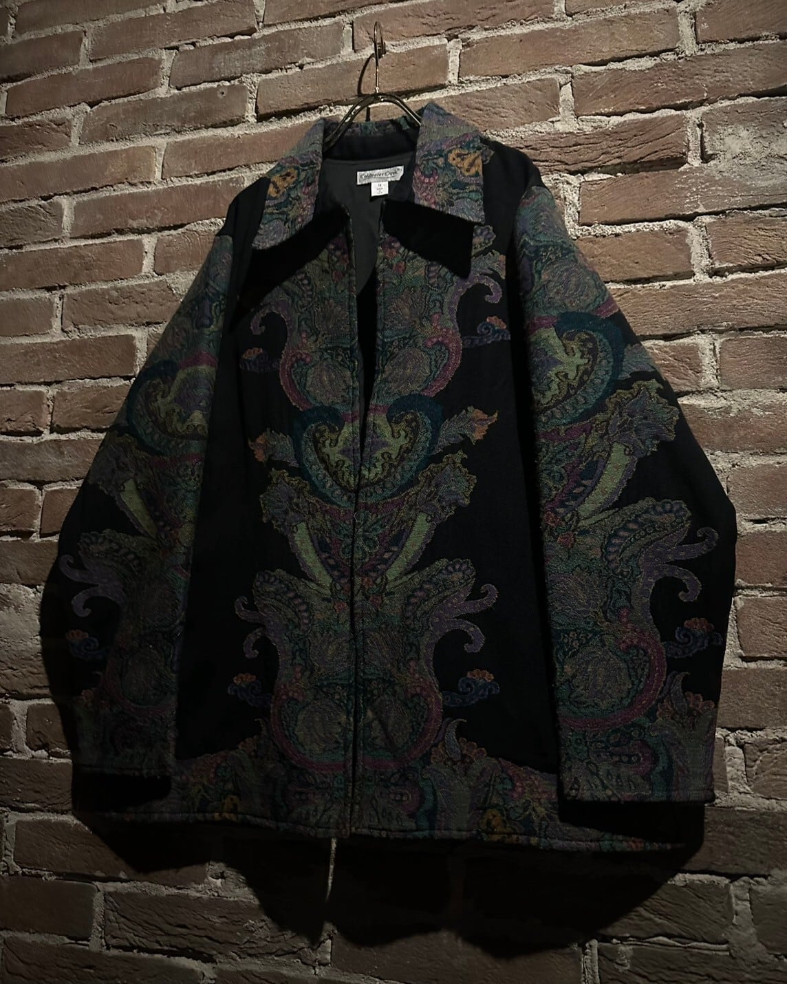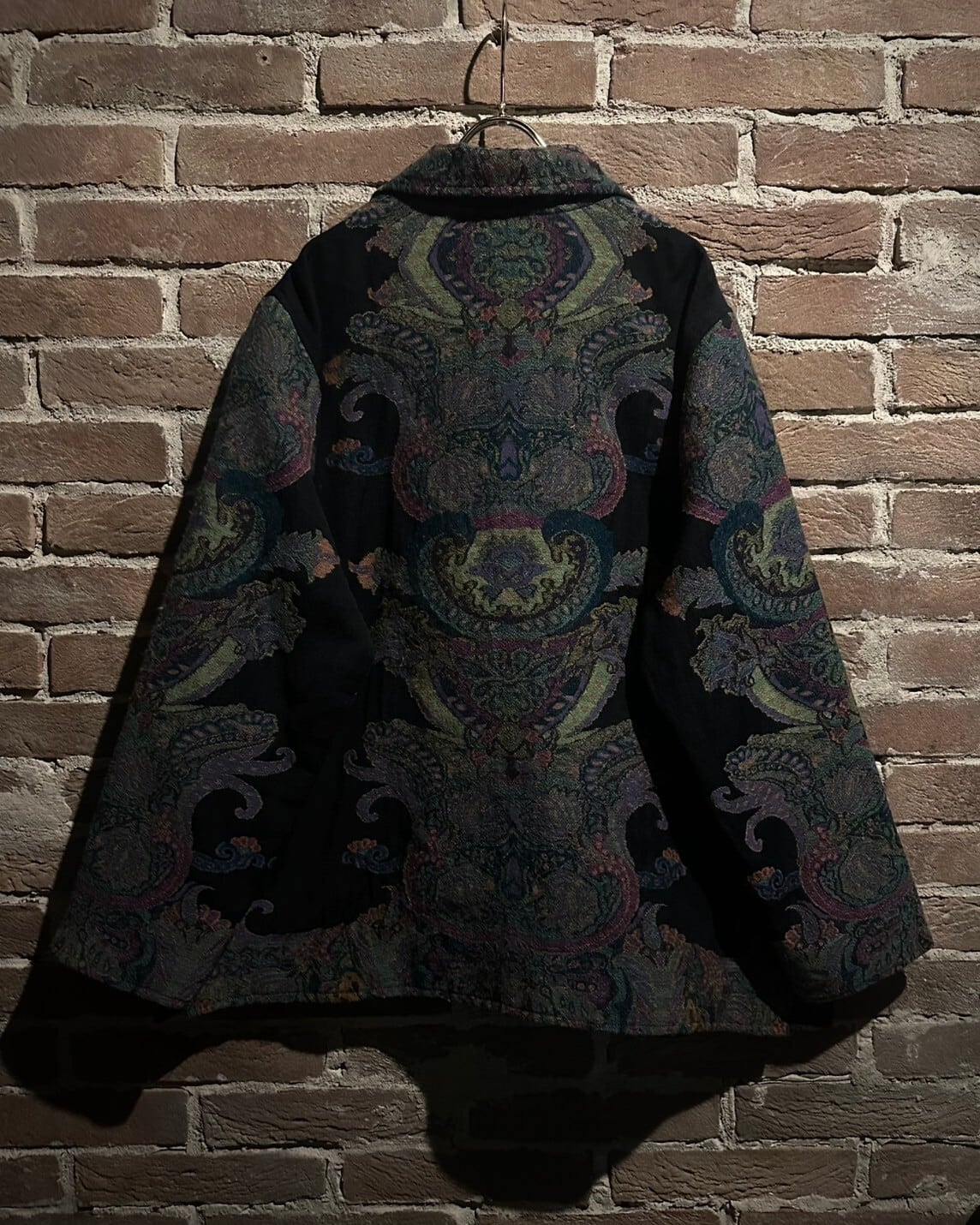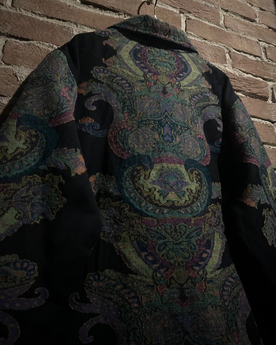 柔らかく薄手のウール素材を用いたボディに、上質な織りでヨーロピアンな柄模様を表現した羽織ジャケット。