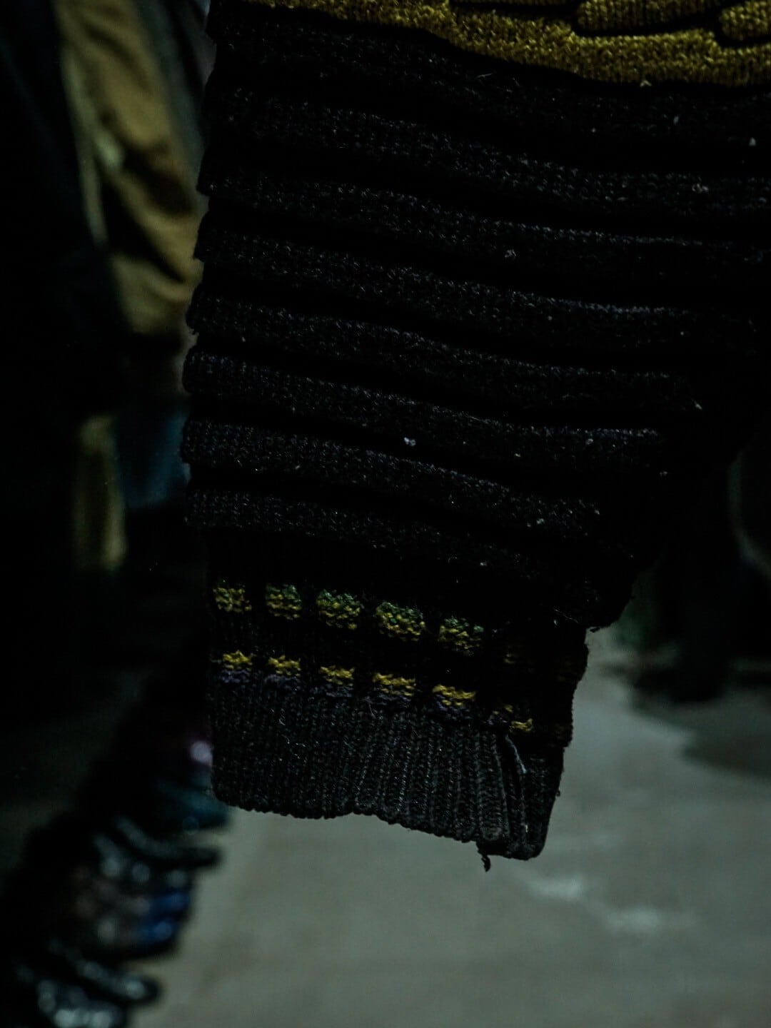 黒をベースとした紫、青、黄を差し込んだ立体感のある上質3Dニットのボディに、フロントと背面肩周りにはパッチワーク風にスムースレザーとスエードレザーを切り替えた、超贅沢な逸品。