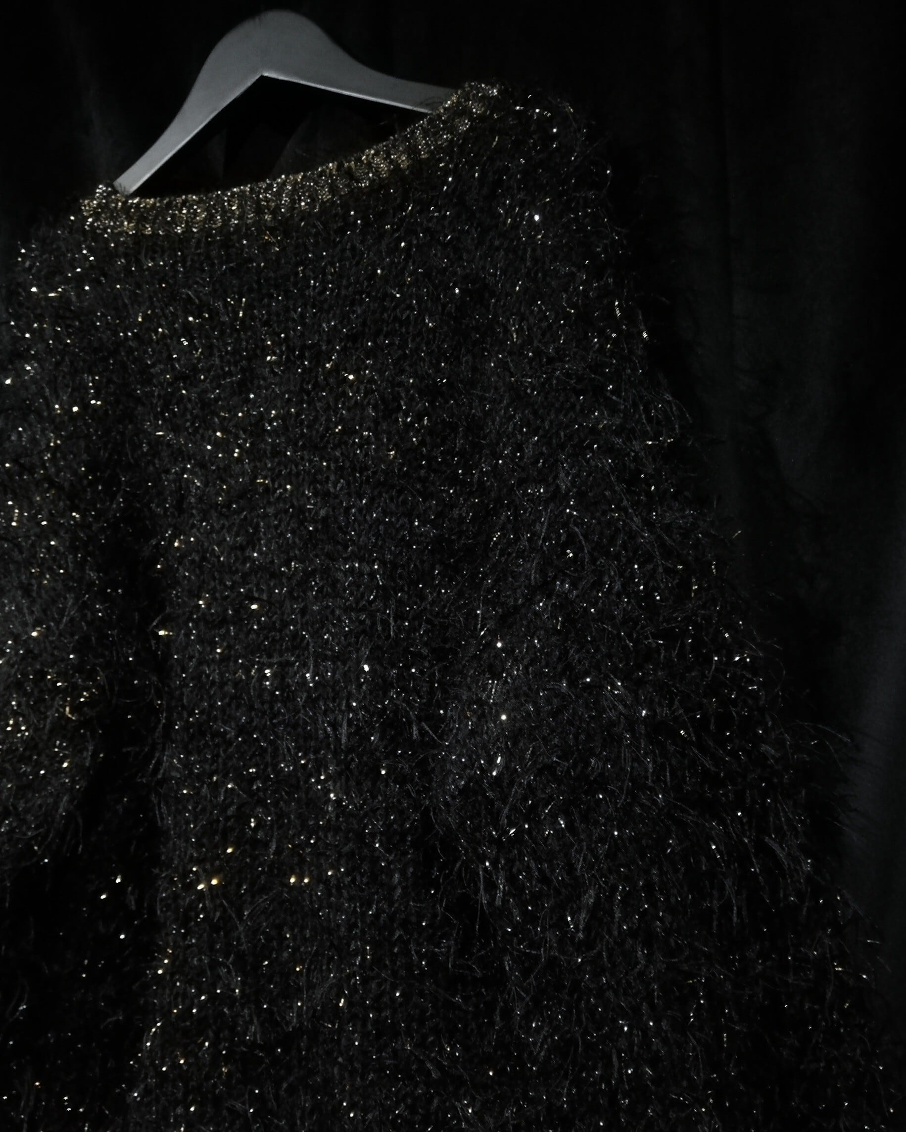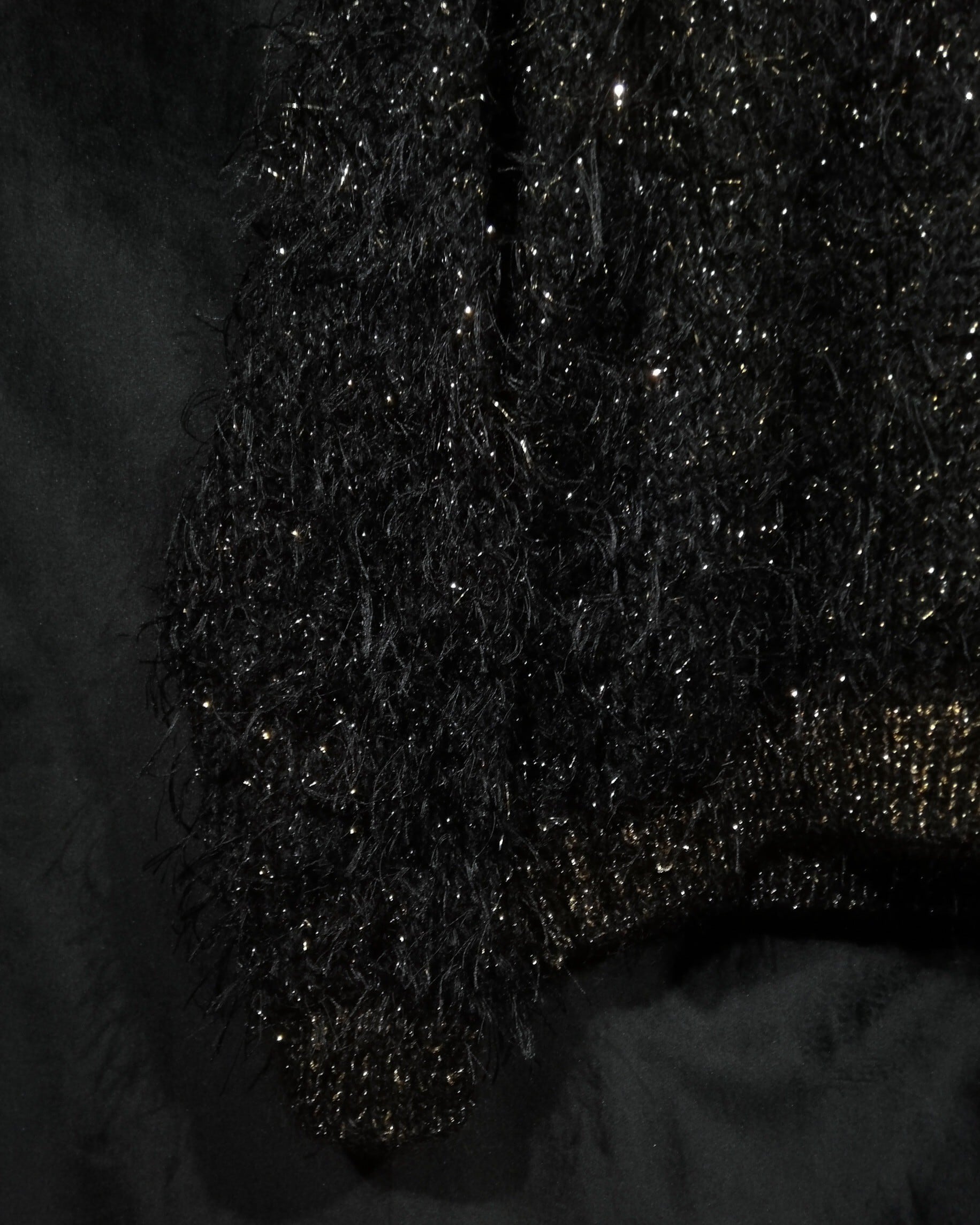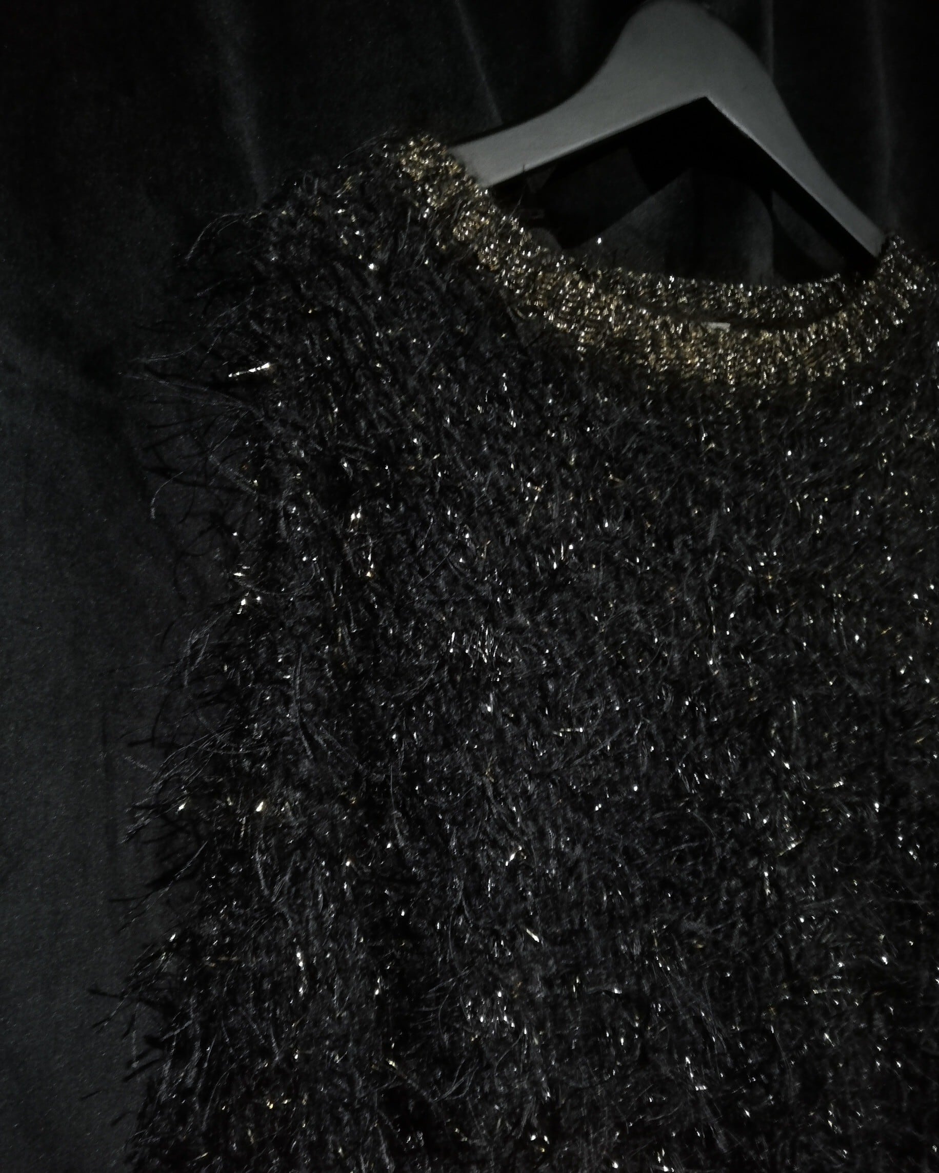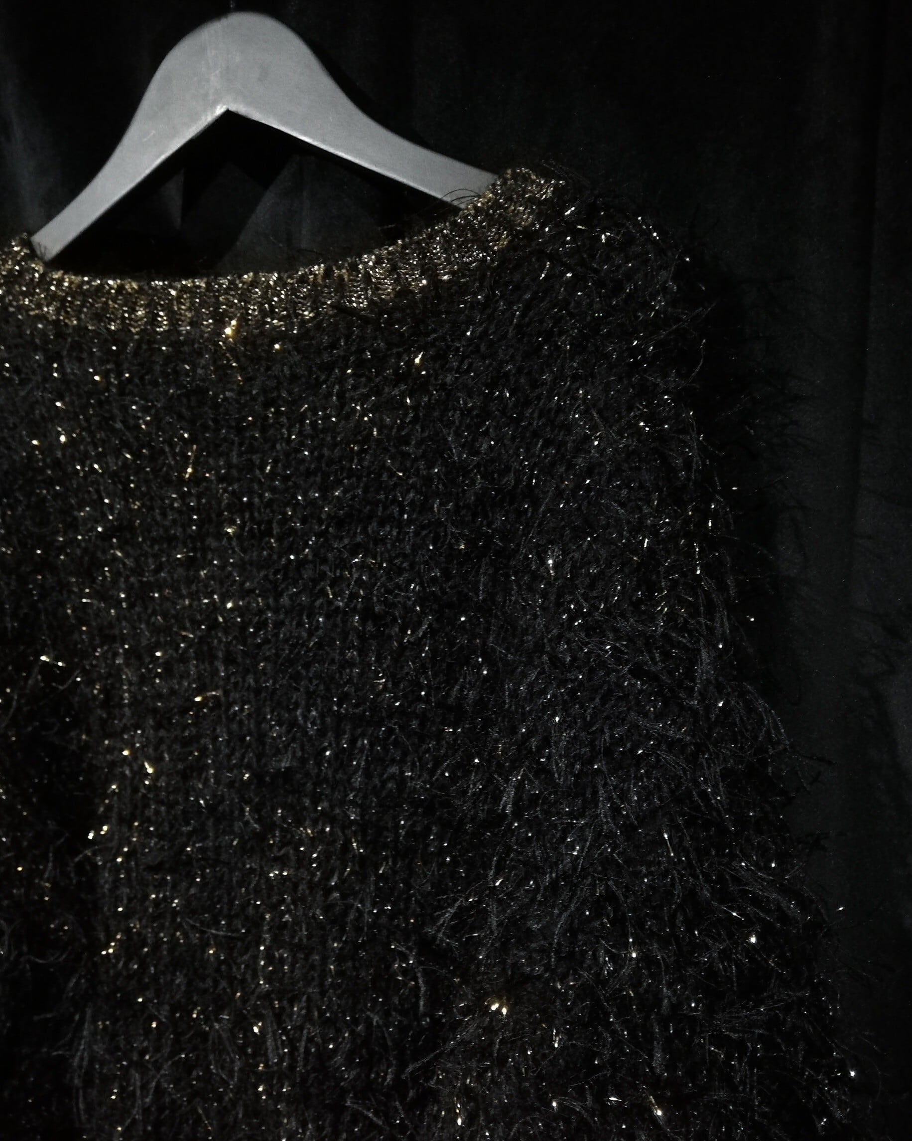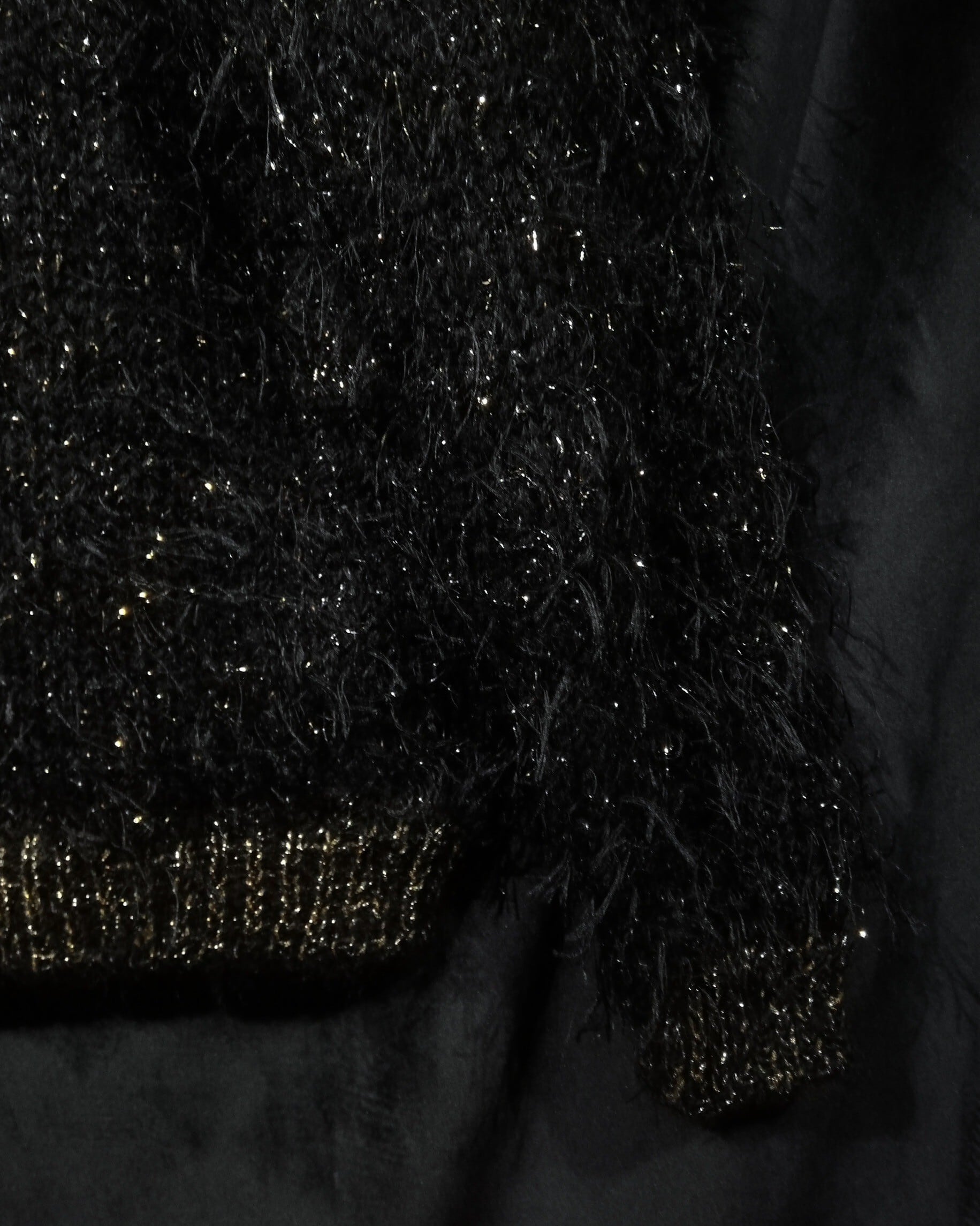毛足の長い黒のシャギー素材をボディ使用したボディに、金糸を織り込んだプルオーバーニット。