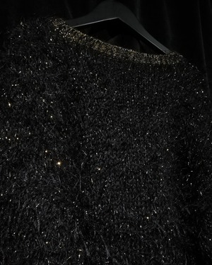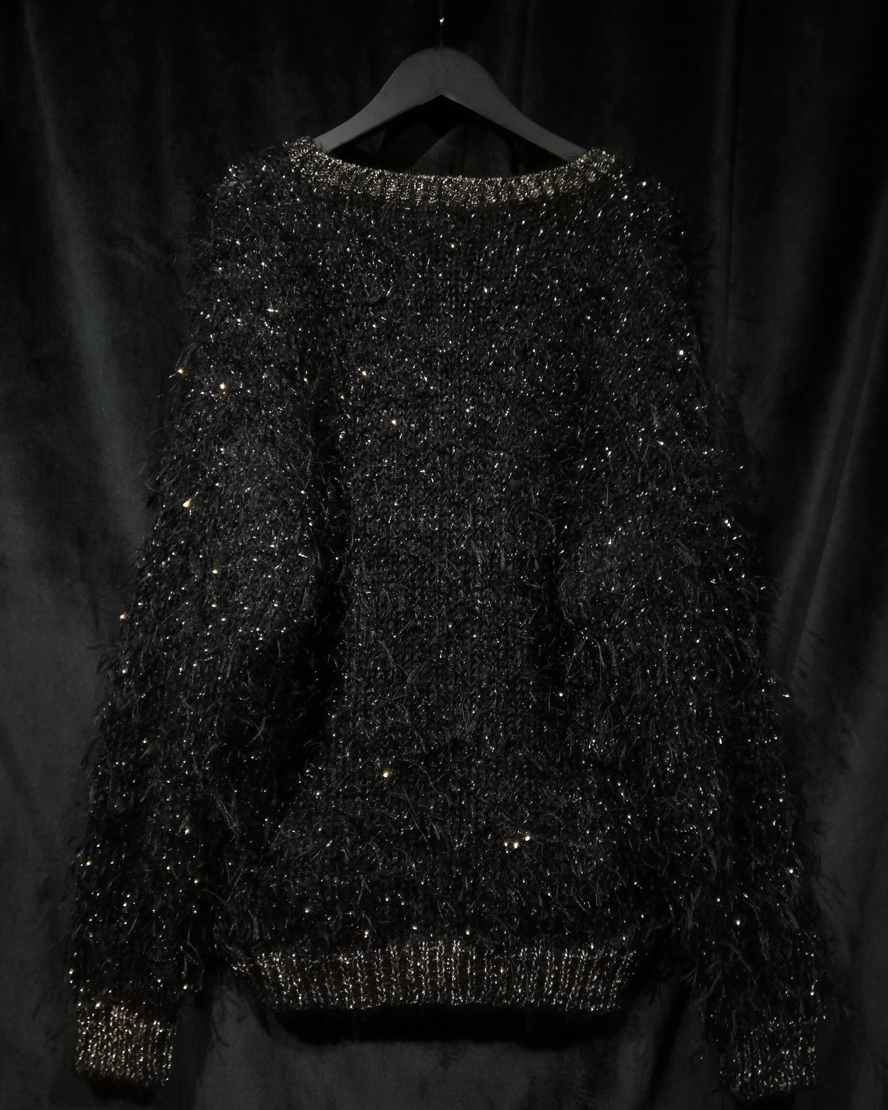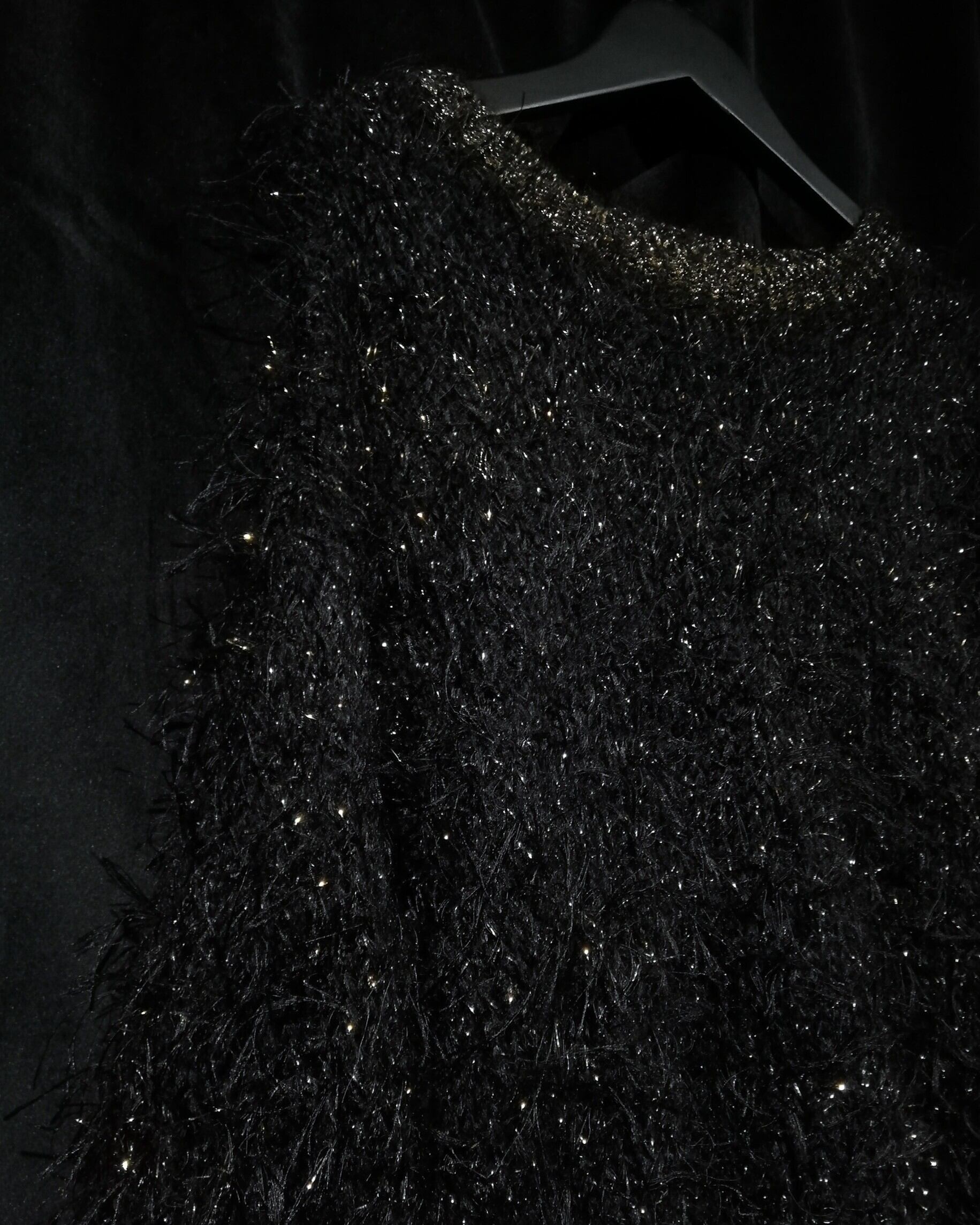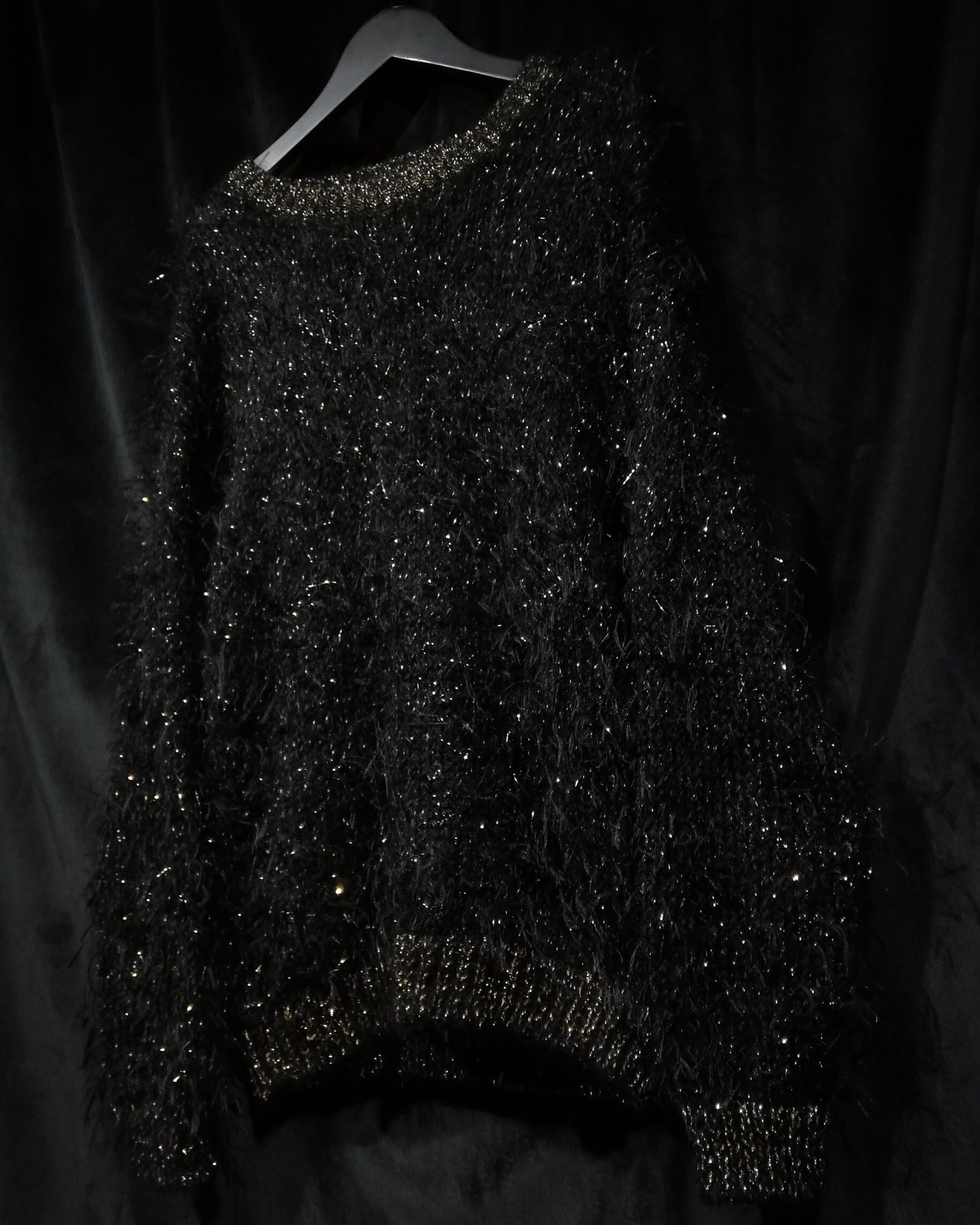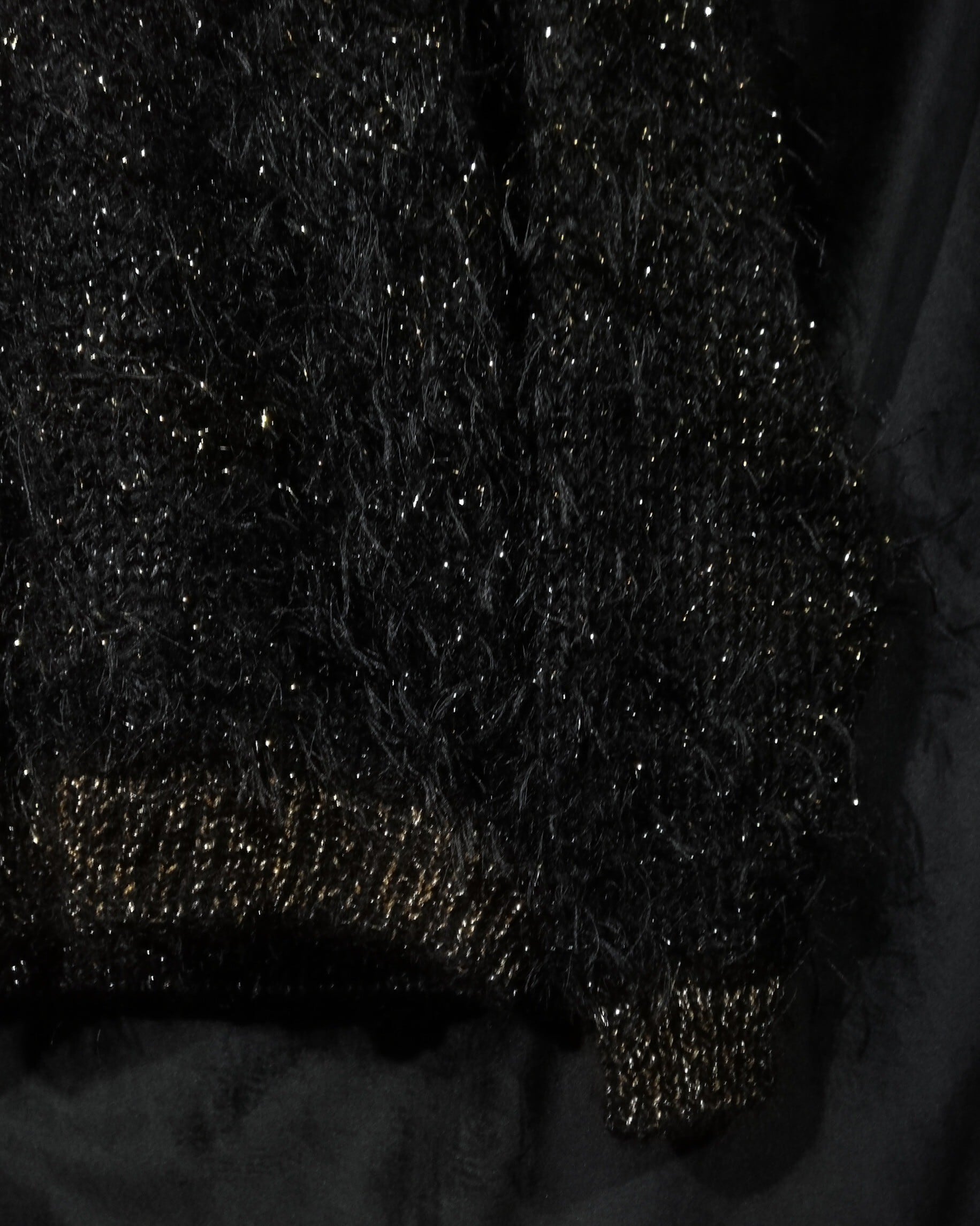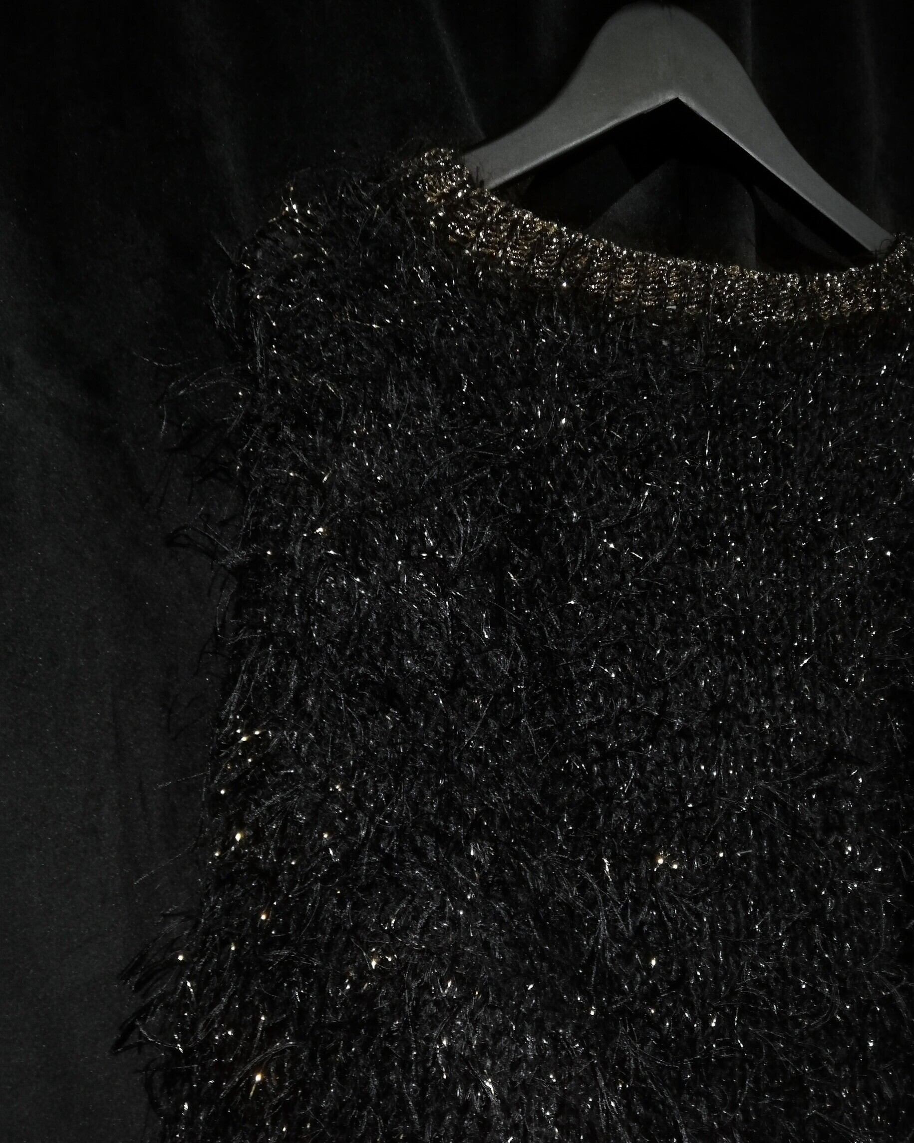 毛足の長い黒のシャギー素材をボディ使用したボディに、金糸を織り込んだプルオーバーニット。