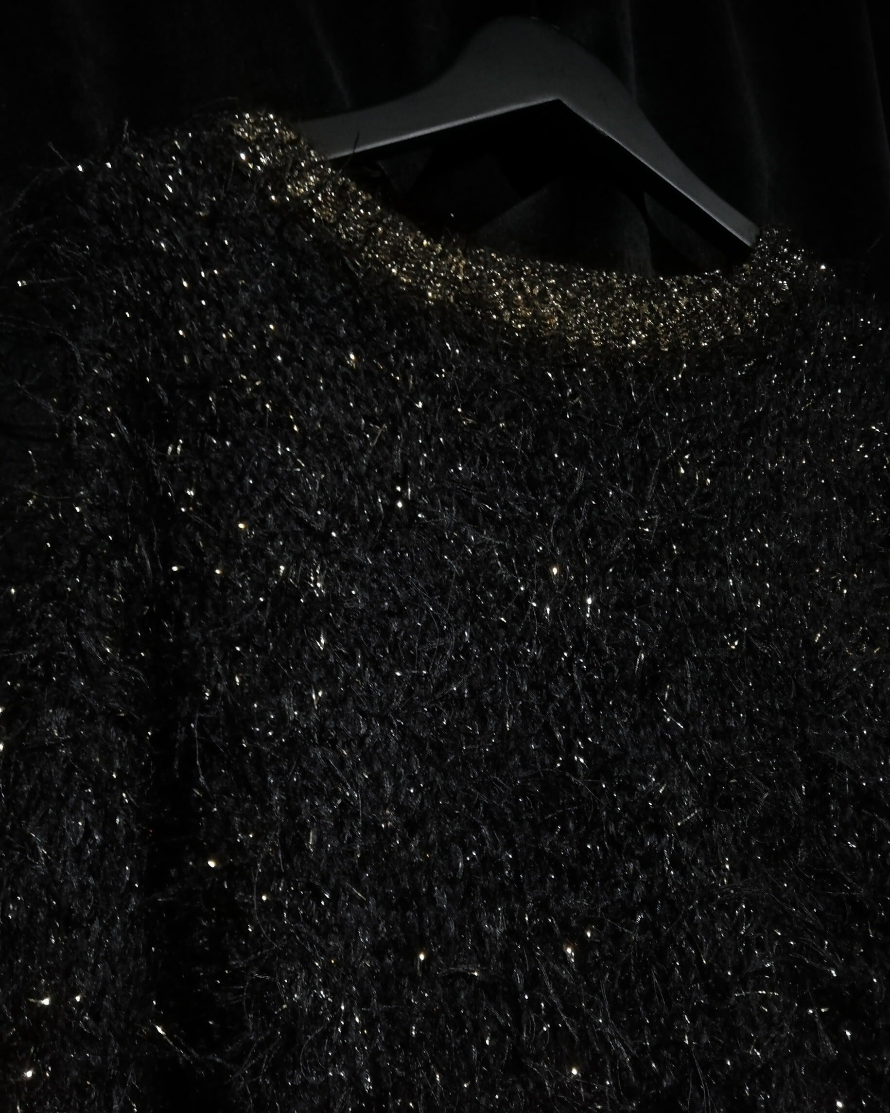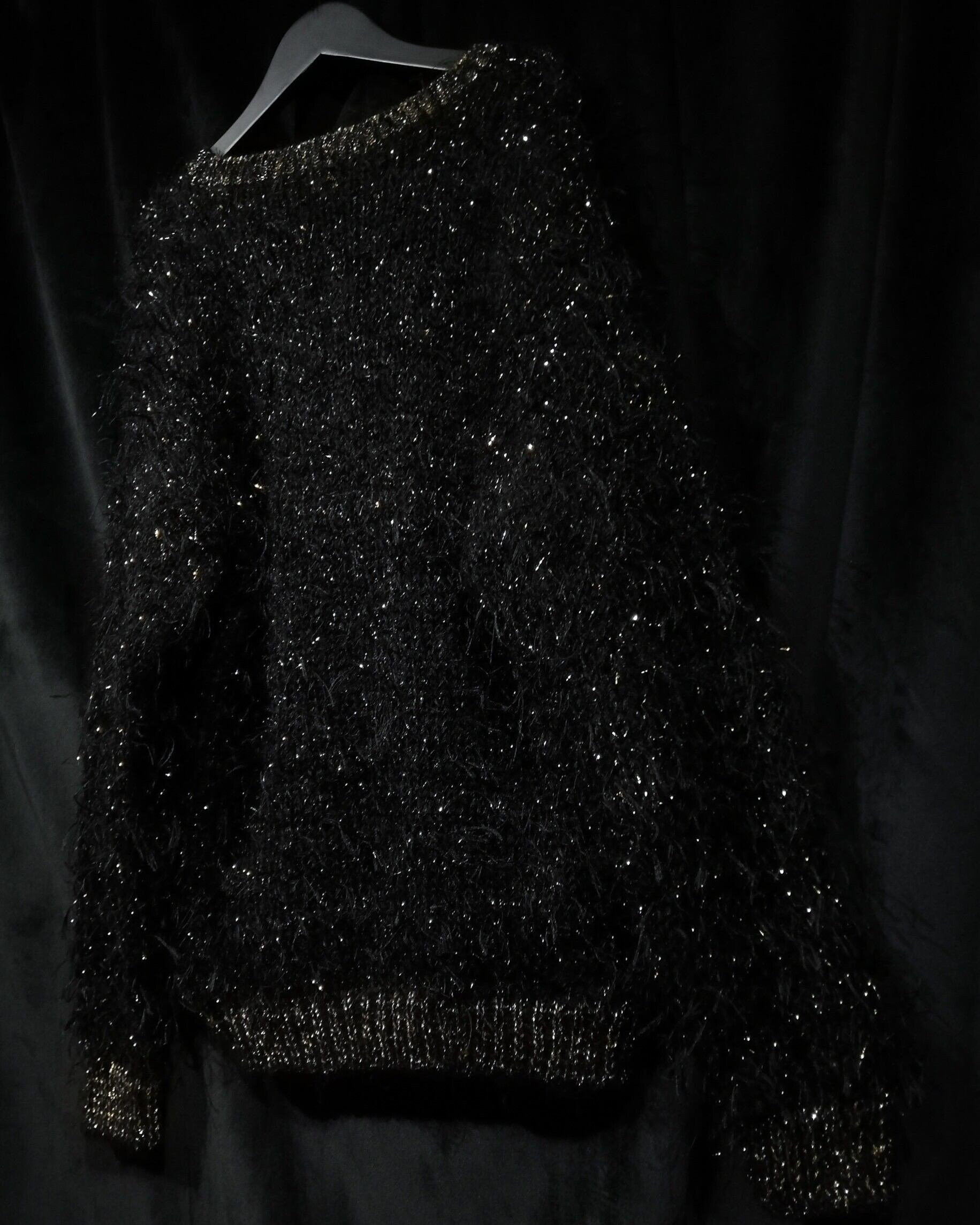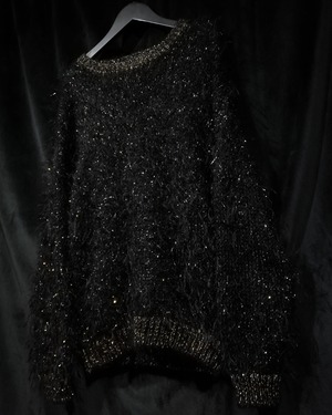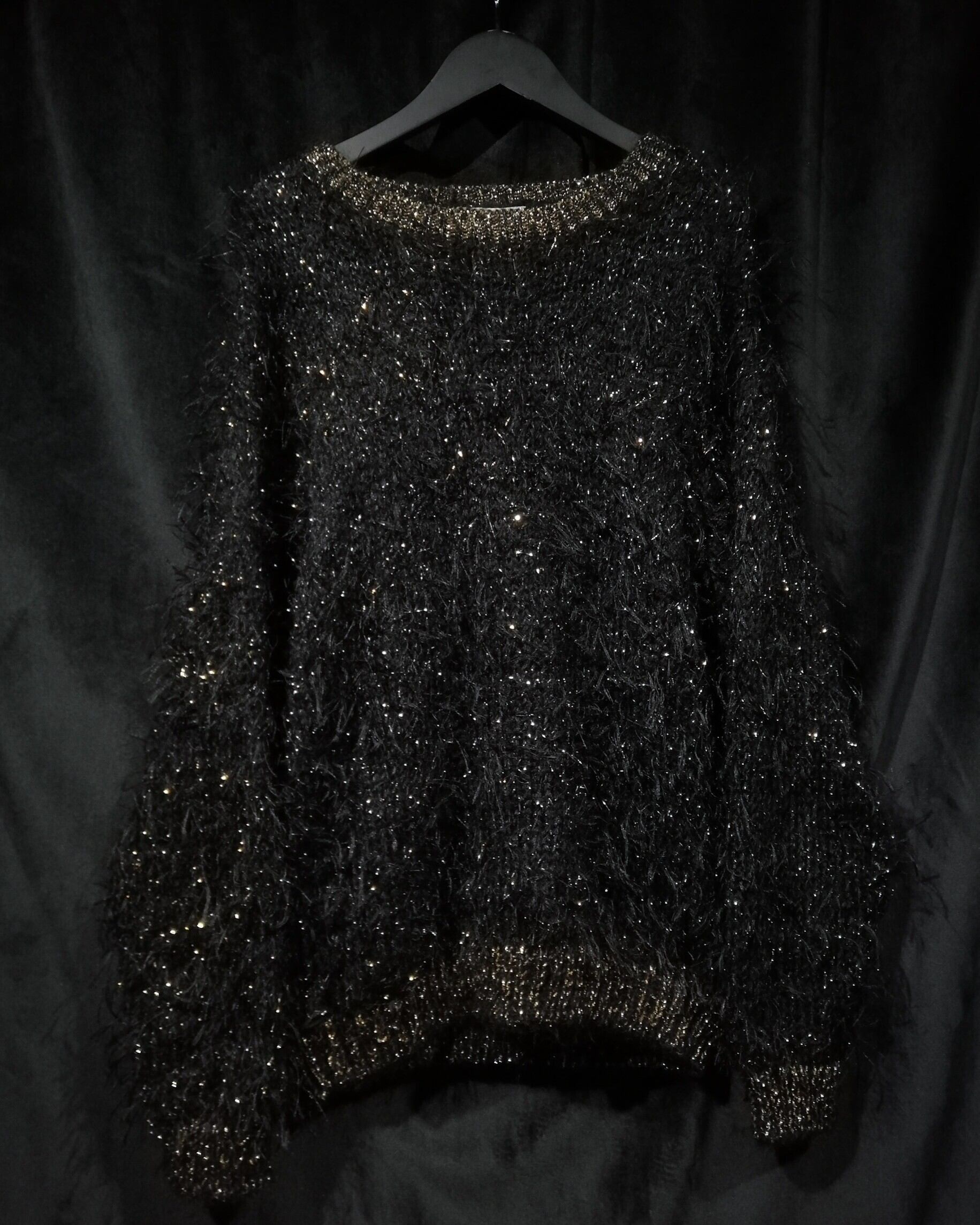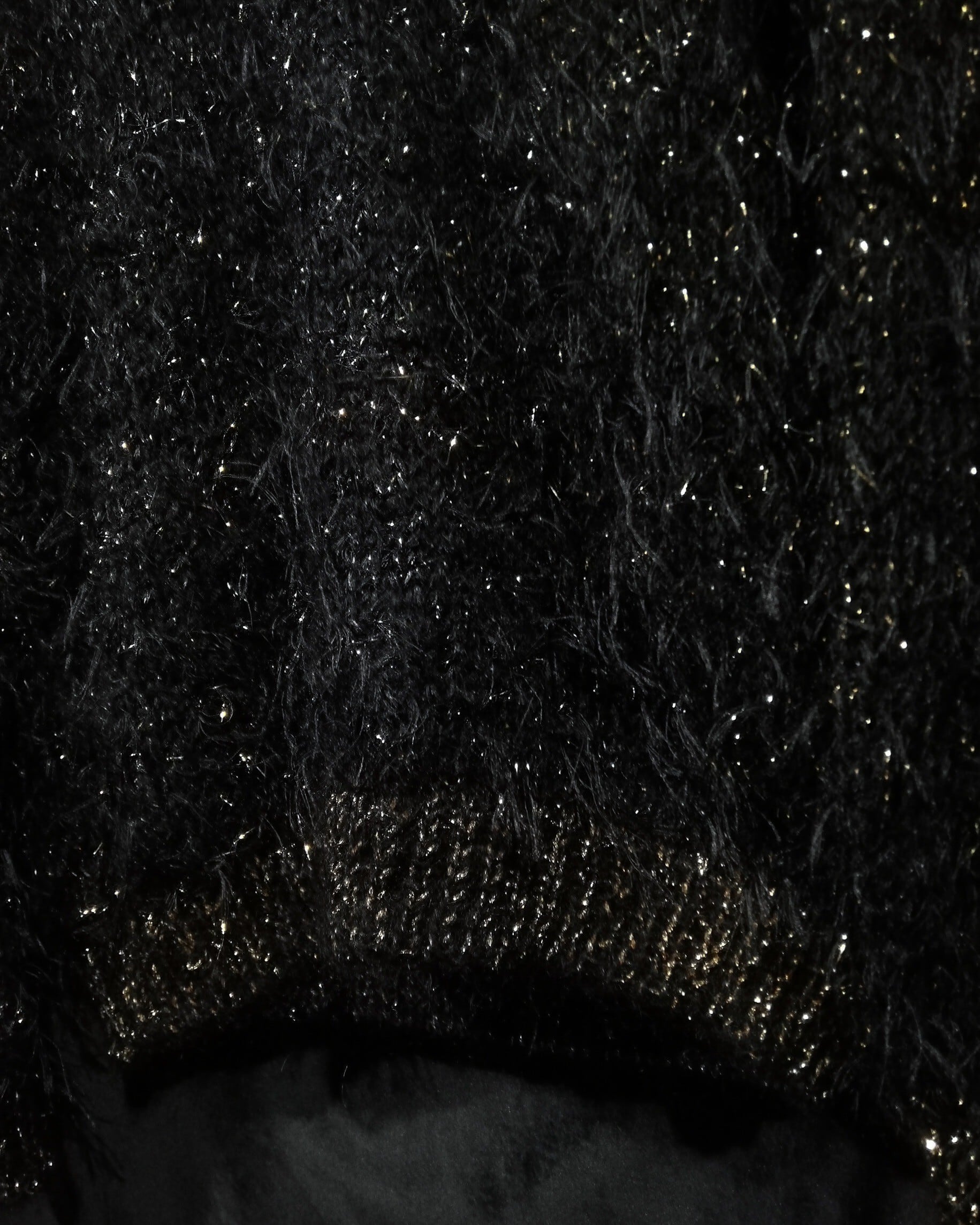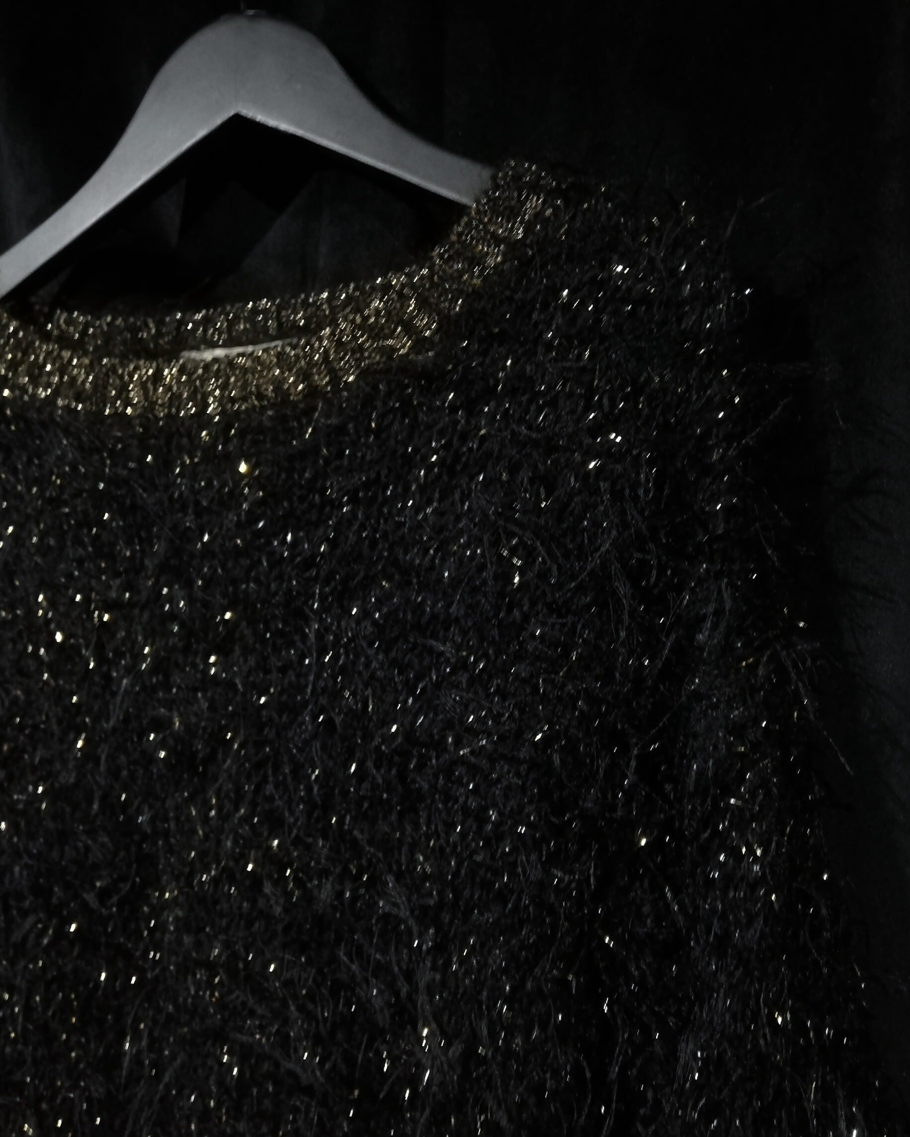 毛足の長い黒のシャギー素材をボディ使用したボディに、金糸を織り込んだプルオーバーニット。