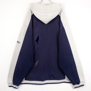 フェードの効いたネイビーをベースにホワイトの生地を切り替えたフーディー。ネイビーと茄子紺のグラデーションが古着ならではの雰囲気を醸し出しています。