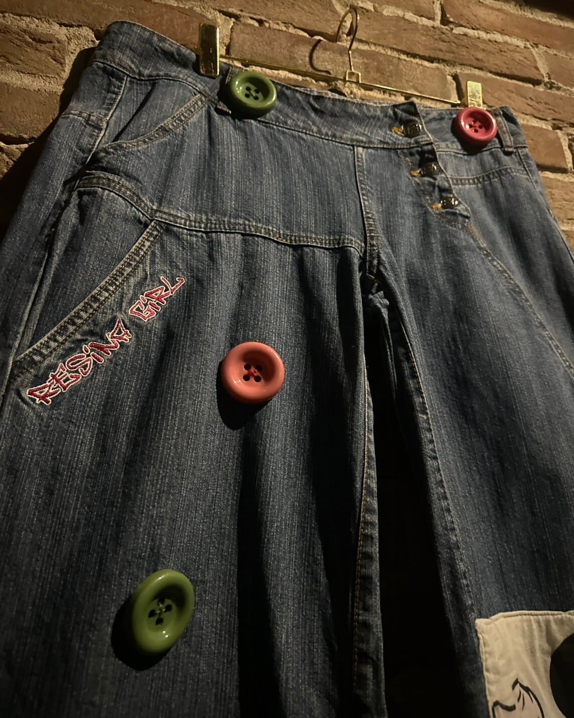 ウエストやフロントに施された大きめのボタンがデザインのアクセントになりつつ、前所有者の趣味嗜好が載せられた絶妙なデザインバランスが◎