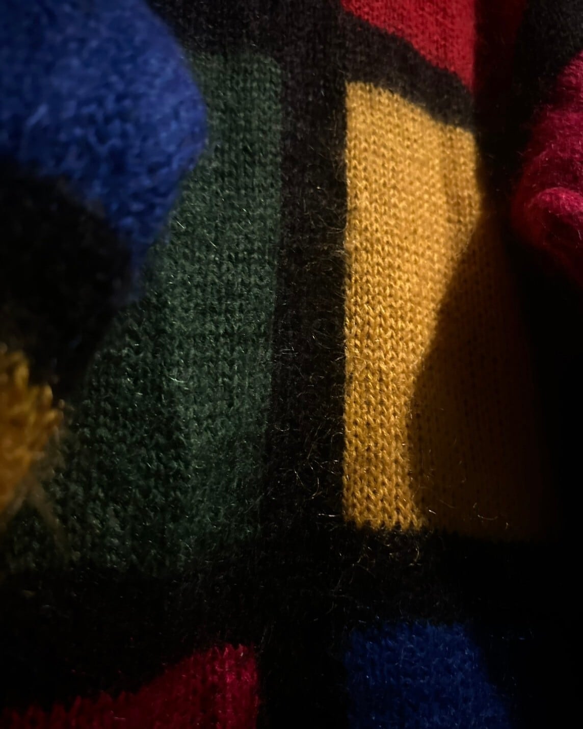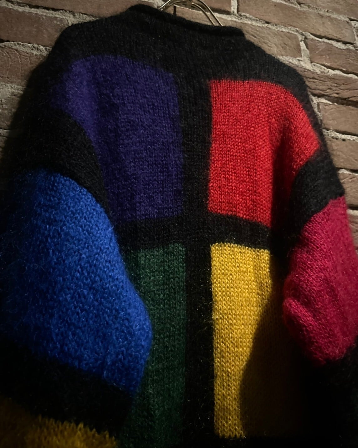 フワッとした毛足が特徴的なモヘアをMixさせ、モンドリアン的なカラーリングの切り替えを施したこちらの1着。