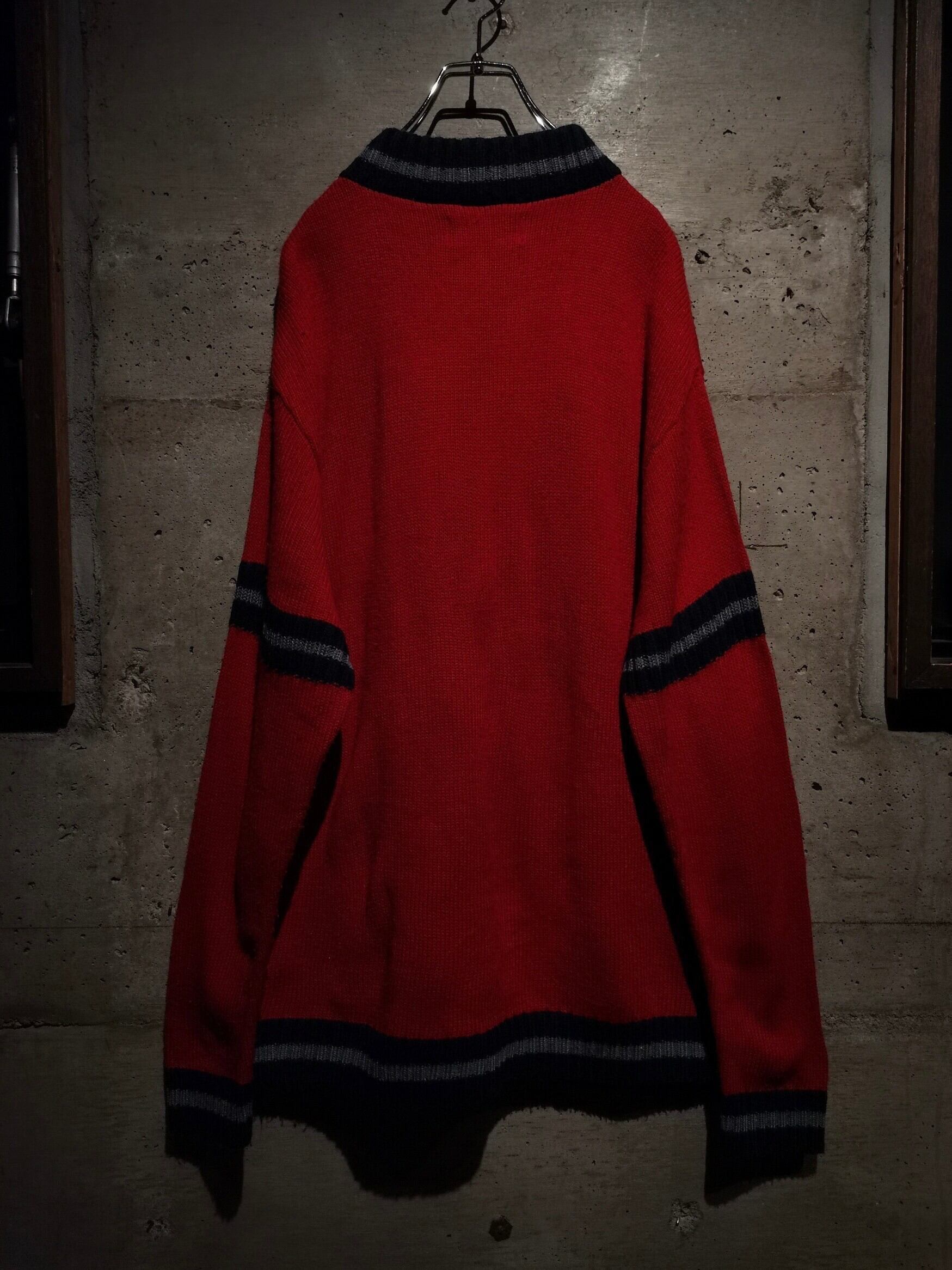 赤をベースに、ネイビー×グレーのラインを切り替え、フロントにブランドロゴの刺繍を刻み込んだVネックニット。