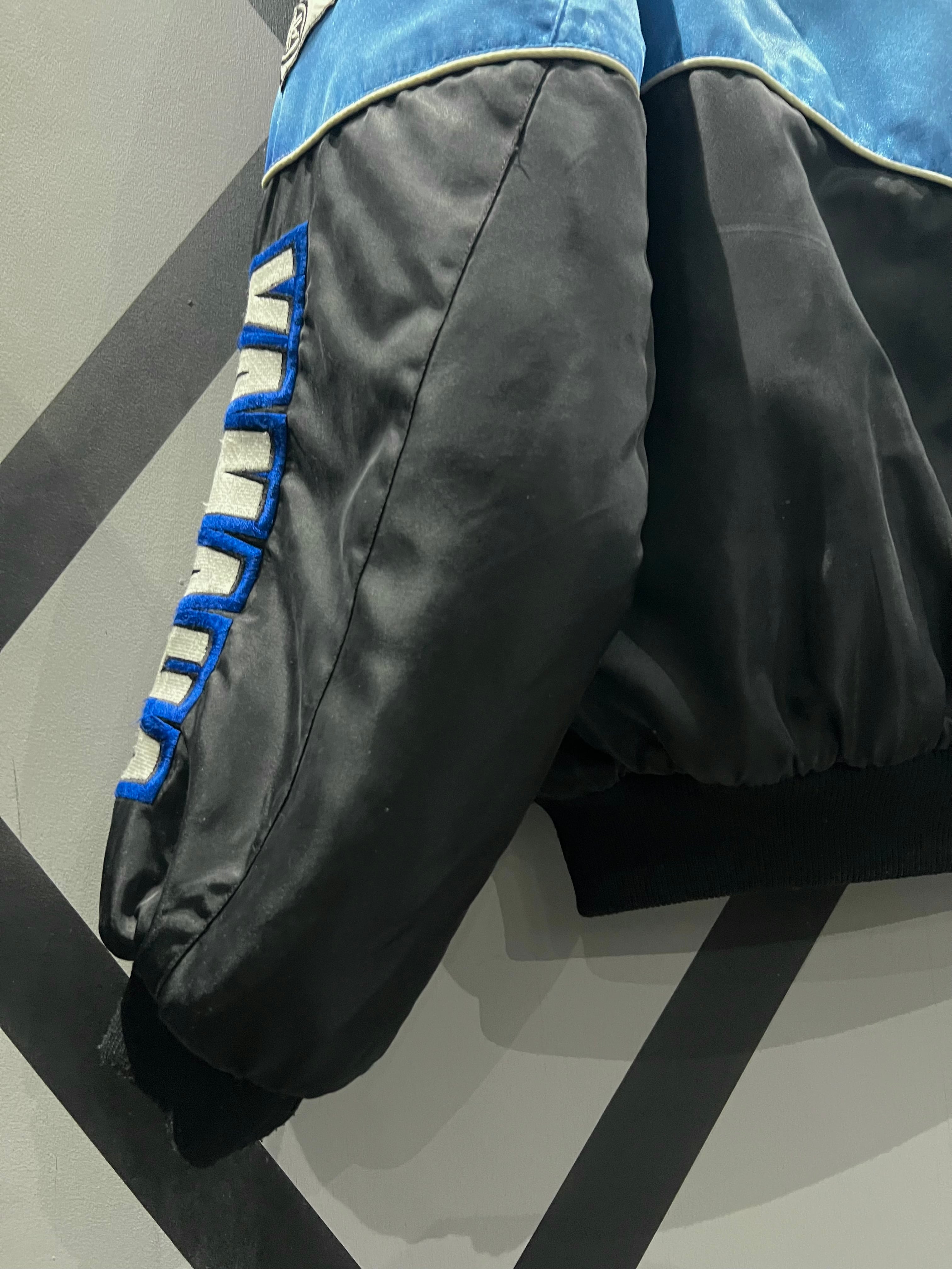 マッドなブラックにソリッドな光沢を放つ軽量ながらもタフなナイロンを用いて、青×黒のカラーリングで切り替え、ブラをネームを載せたレーシングジャケット。