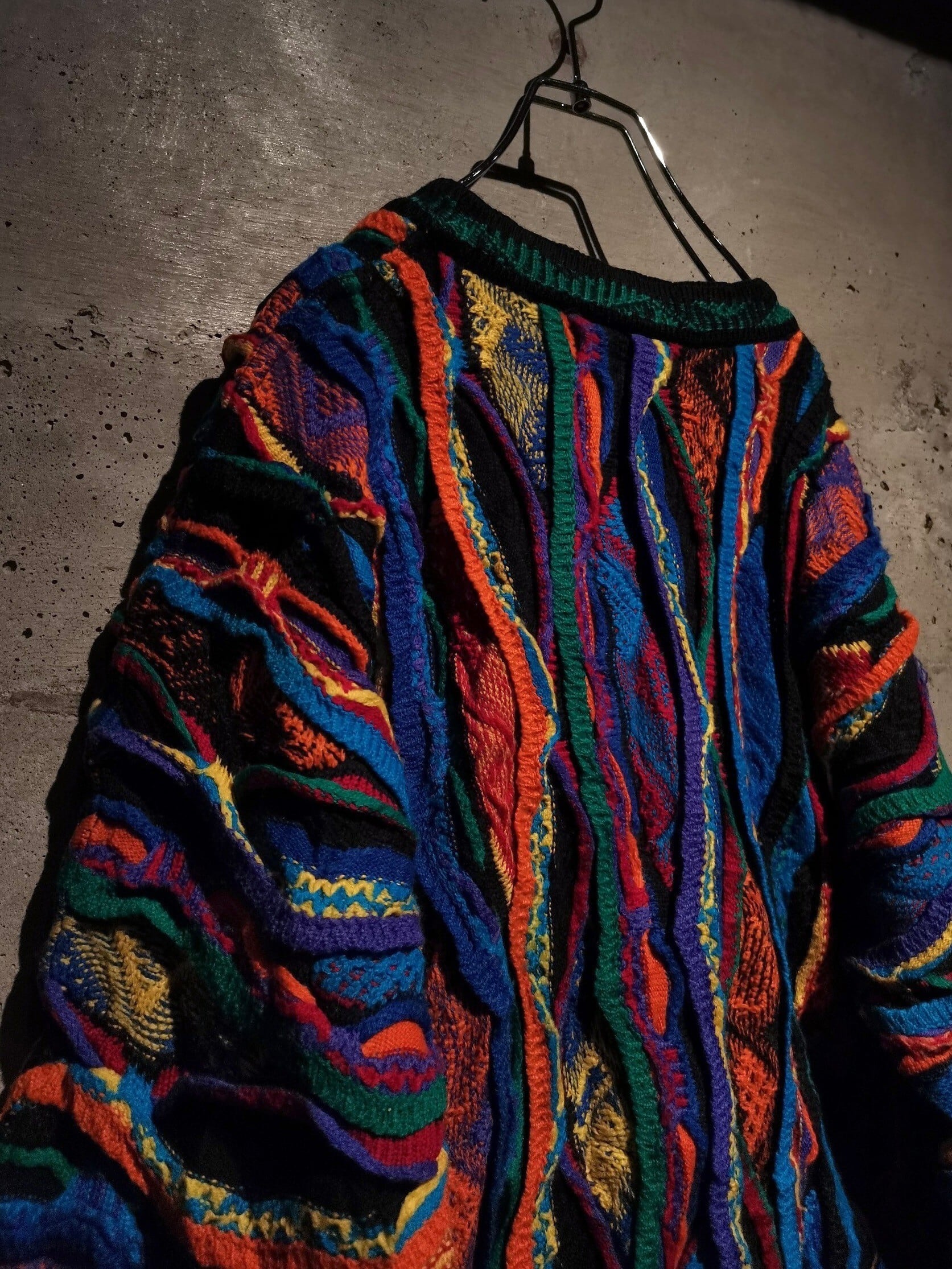 繊細なニッティングと、黒の絶妙な配色によって纏りのある素晴らしいデザインバランスに。数ある3Dニットの中でもここまで多色使いかつ、絶妙なカラーバランスに仕上げられたアイテムはやはりさすが"COOGI"の一言に尽きます。