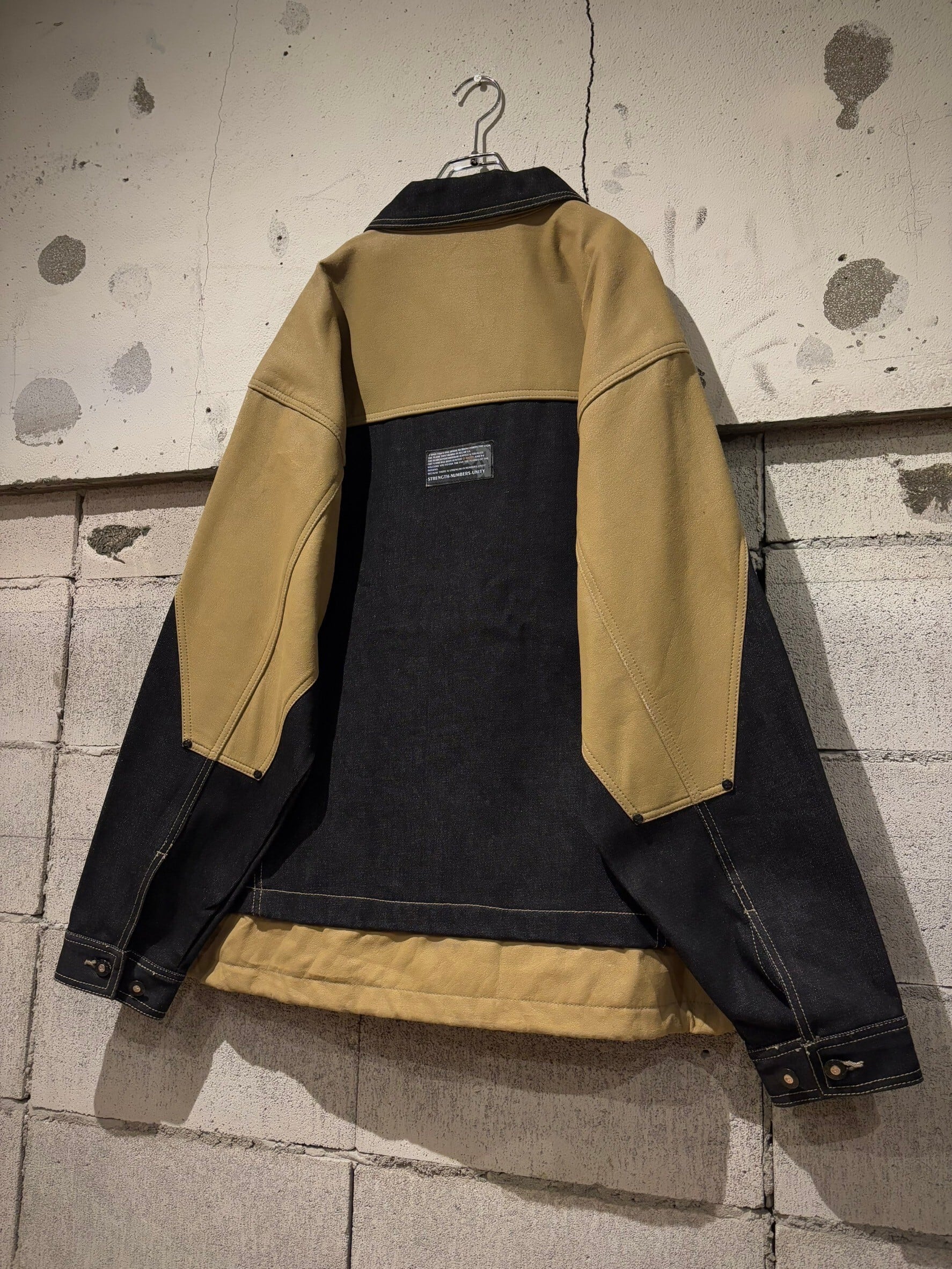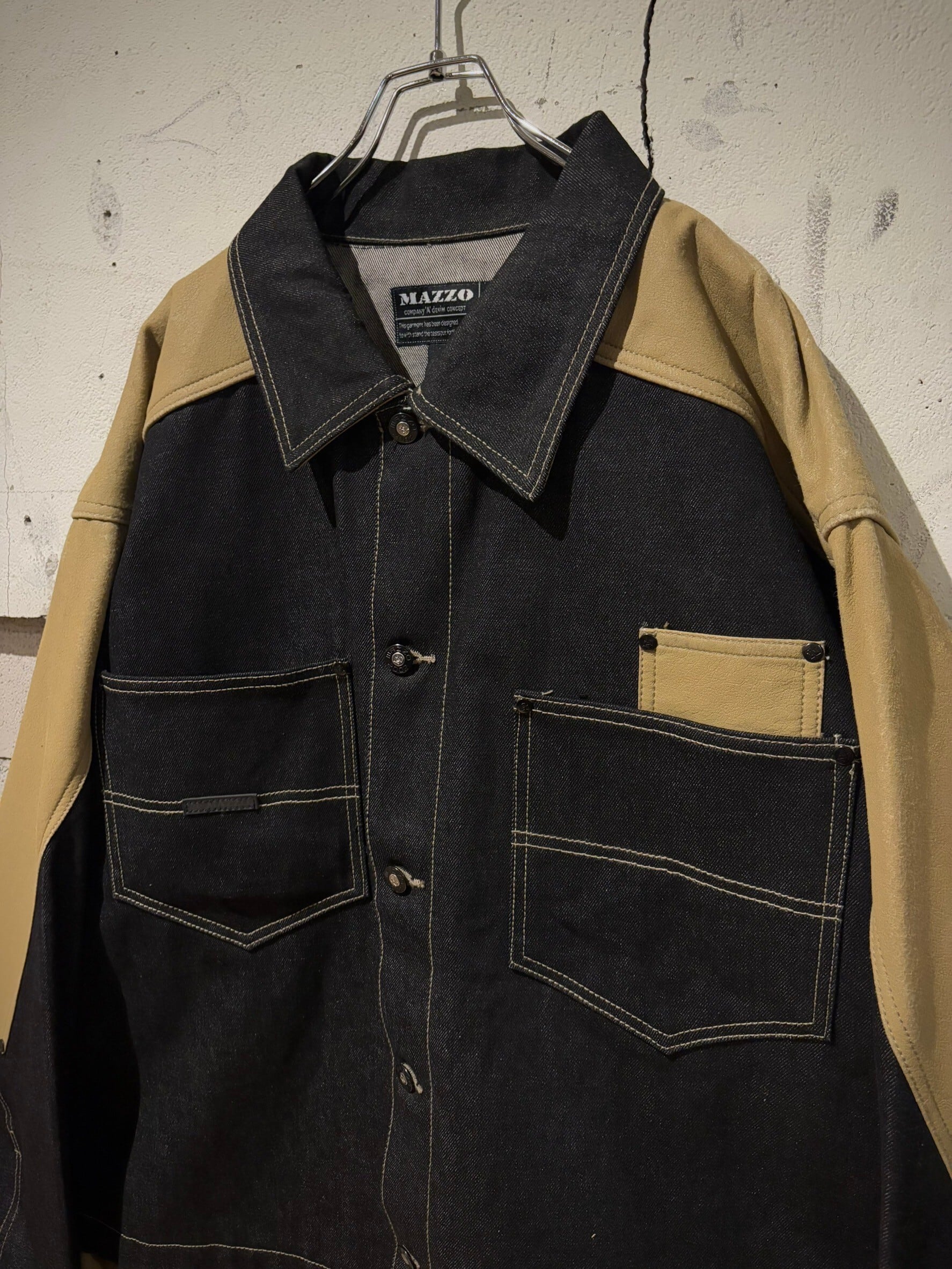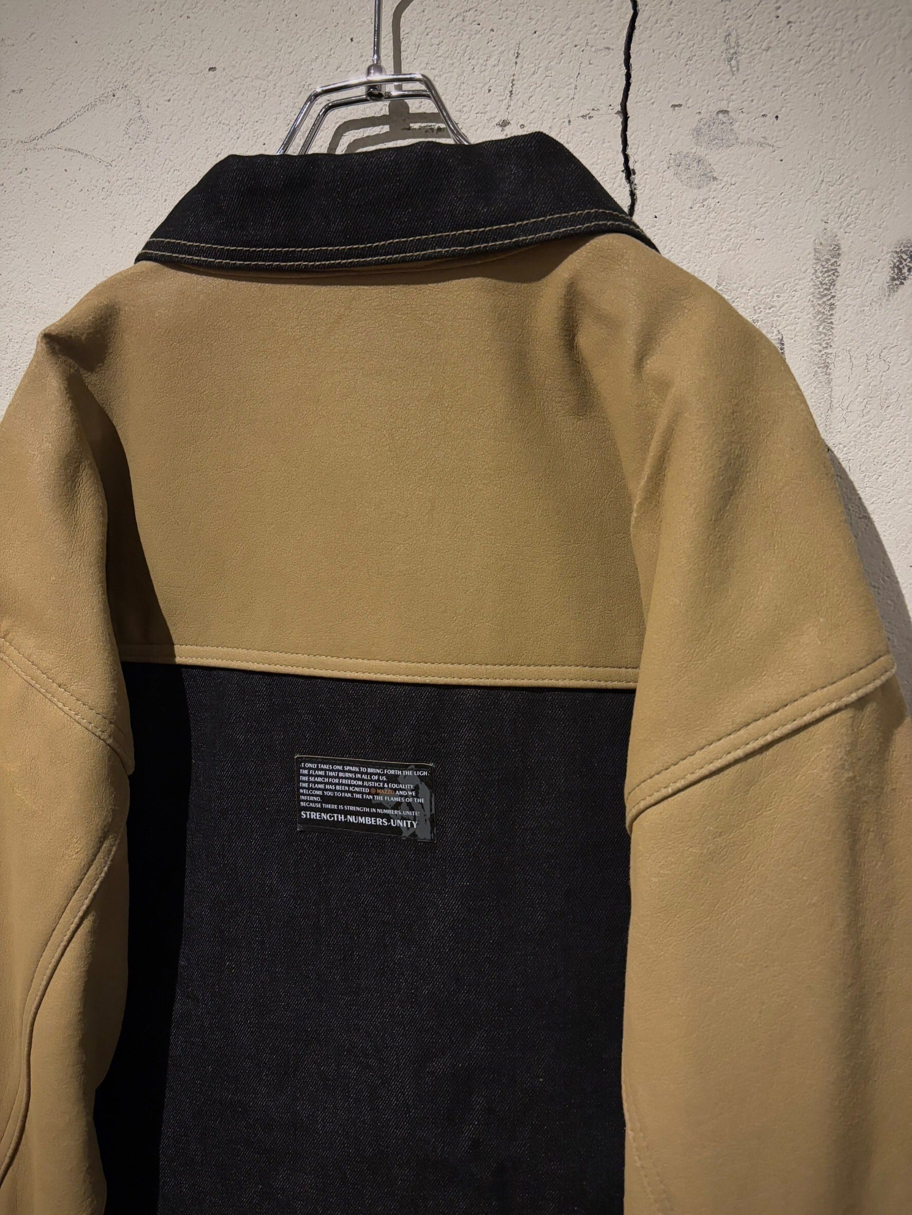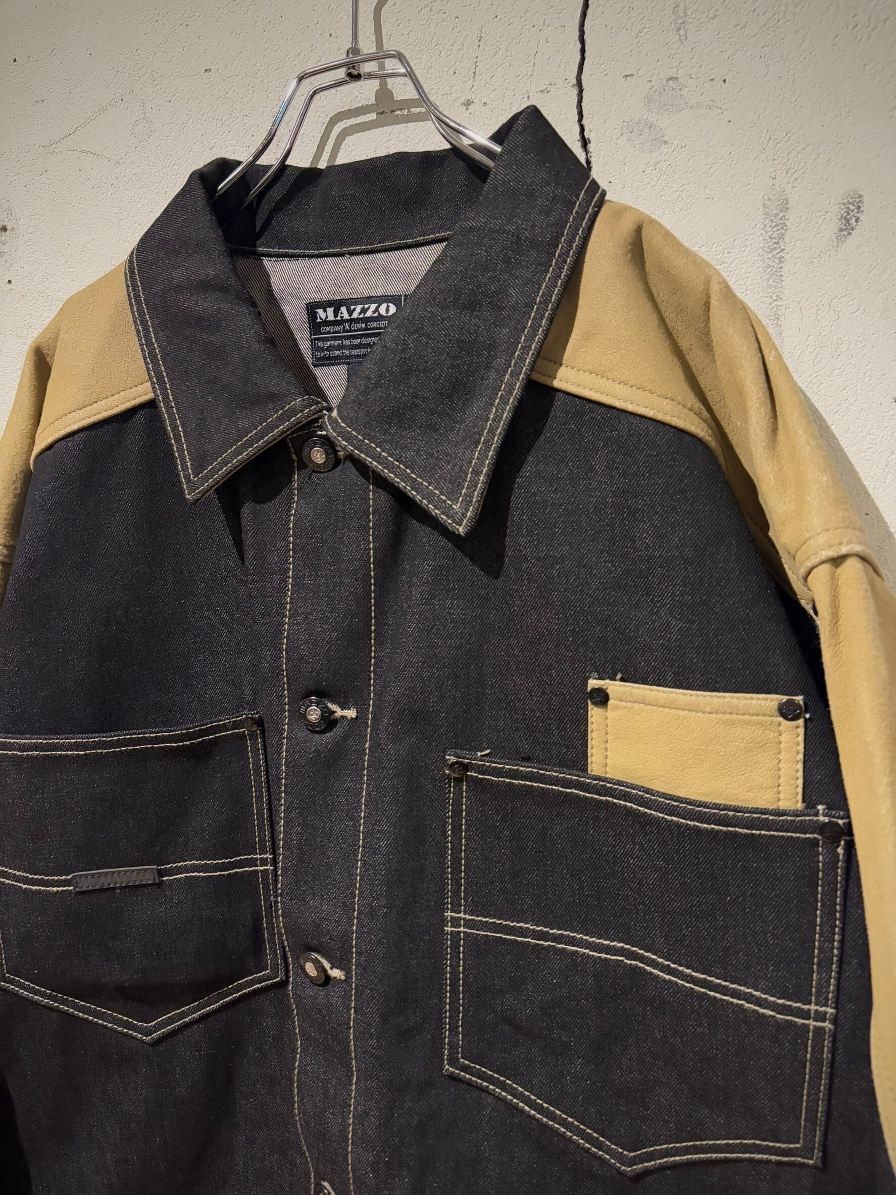 ヴィンテージデニムの中でも稀少価値が高まったブラックデニムを用いたボディに、ベージュの上質なフェイクレザーを切り替えたデニムジャケット。