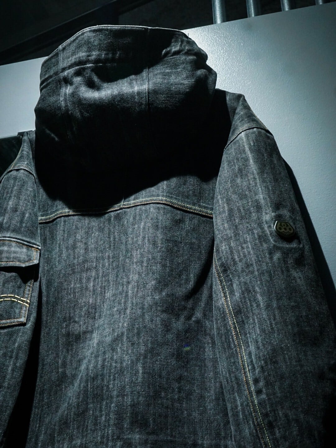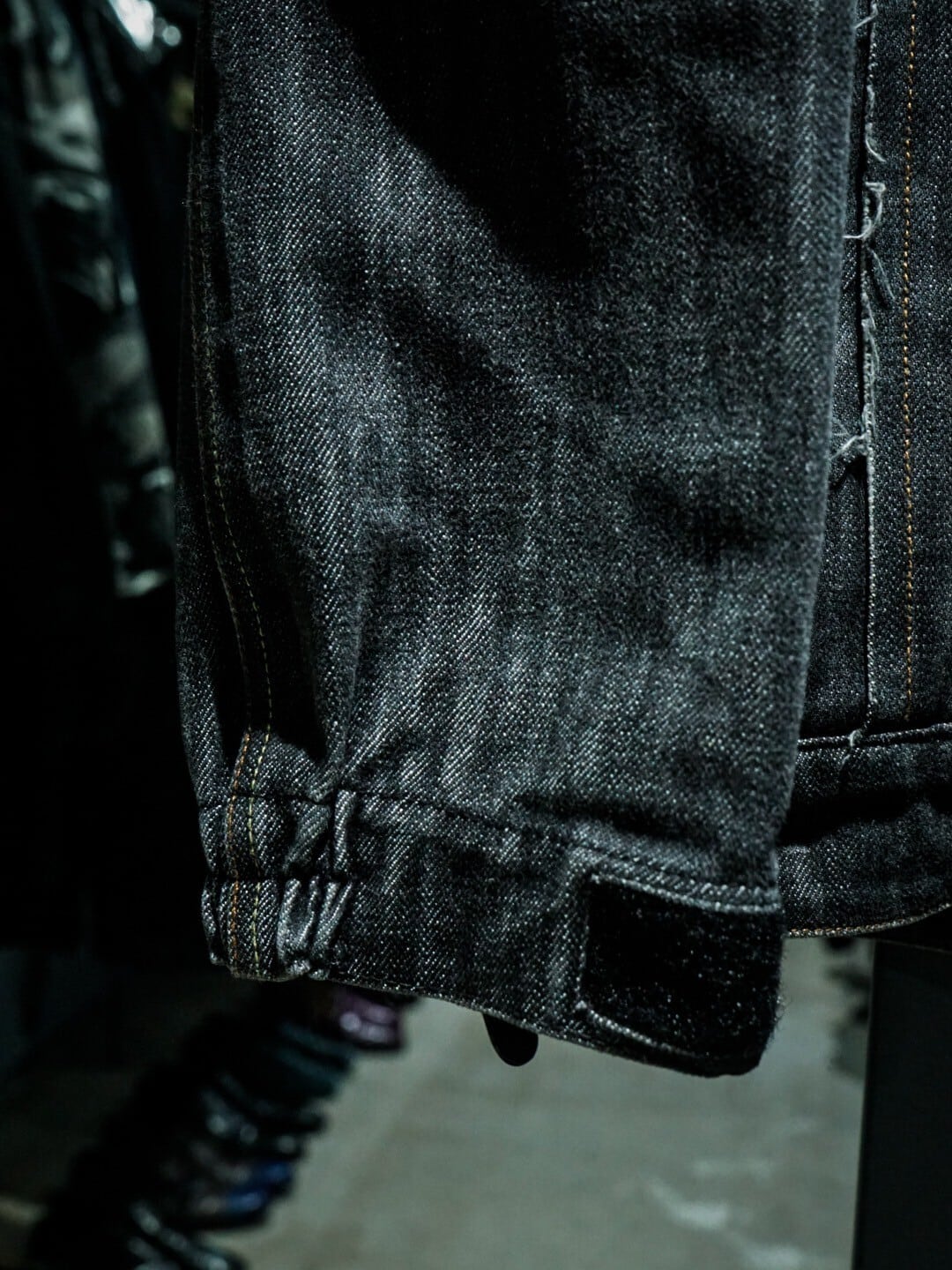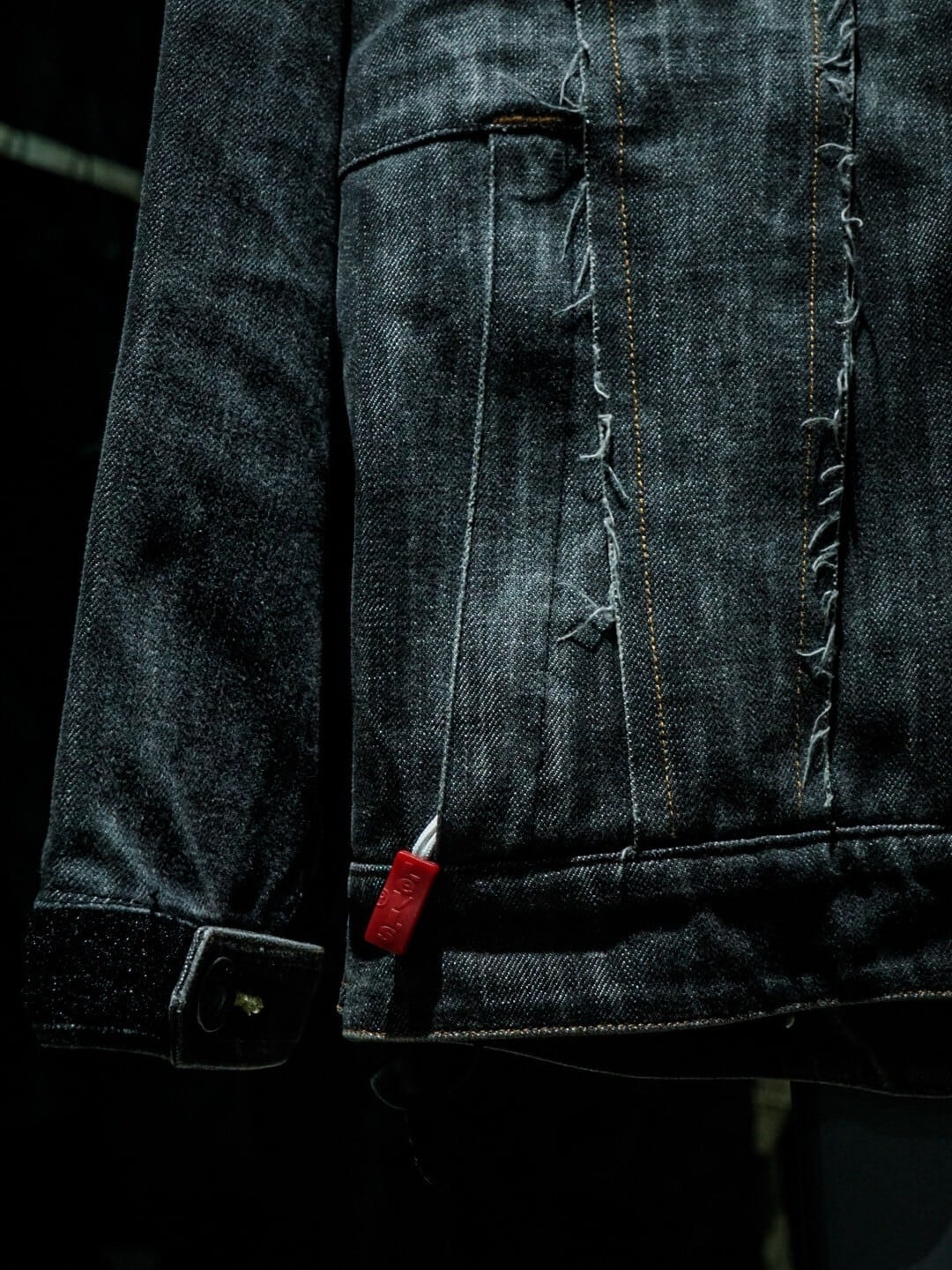 フロントには切りっぱなしでフリンジ状のほつれのデザインや、アームのポケット、黄色のステッチデザインなど、素材だけでなくデザイン性にも優れた仕上がりに。