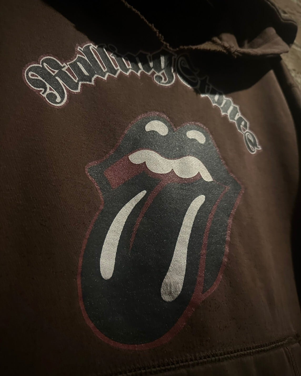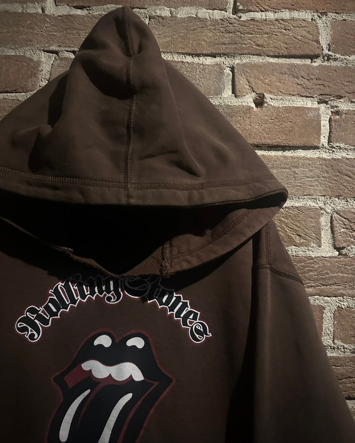 経年変化による美しいフェードが効いたボディに、リップ&タンのプリントをフロントに載せた"ローリングストーンズ"のプルオーバーフーディー。