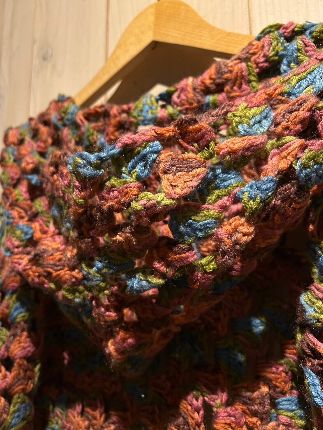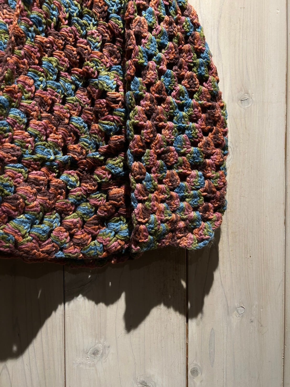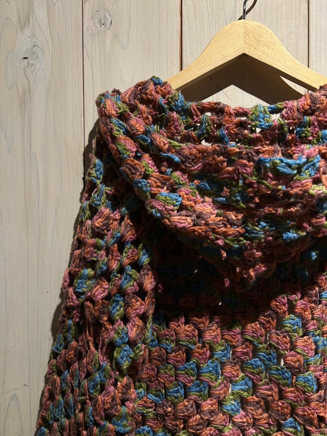 赤、青、緑等の淡いマルチカラーを用いて、ざっくりとしたクロシェ編みによって仕上げられたフード付きのニットガウン。