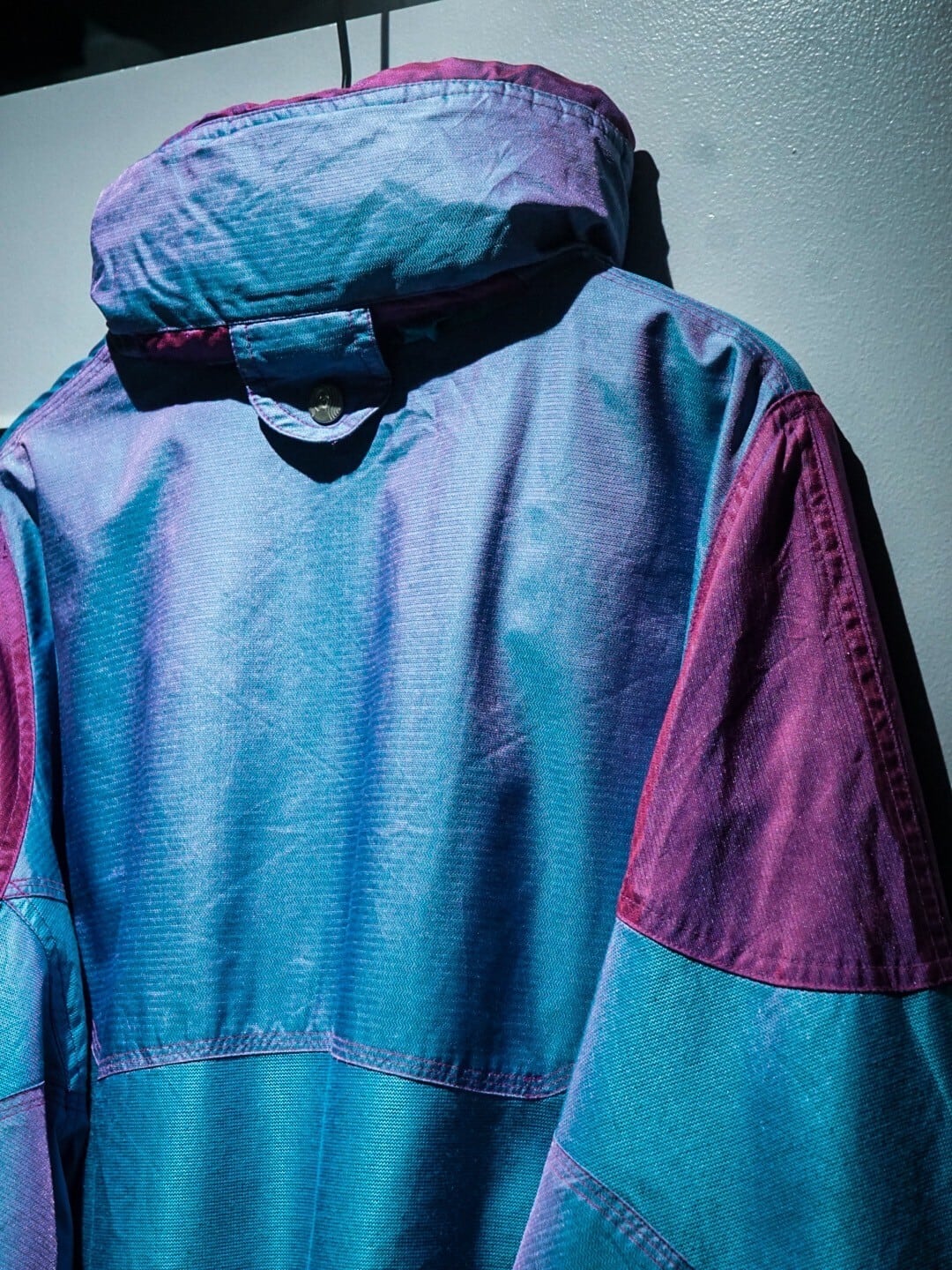 水色、ピンクと、オーロラのように見る角度によって色の移り変わる"玉虫色"のボディーが光り輝く美しさを放つナイロン生地をボディに使用したアノラックジャケット。