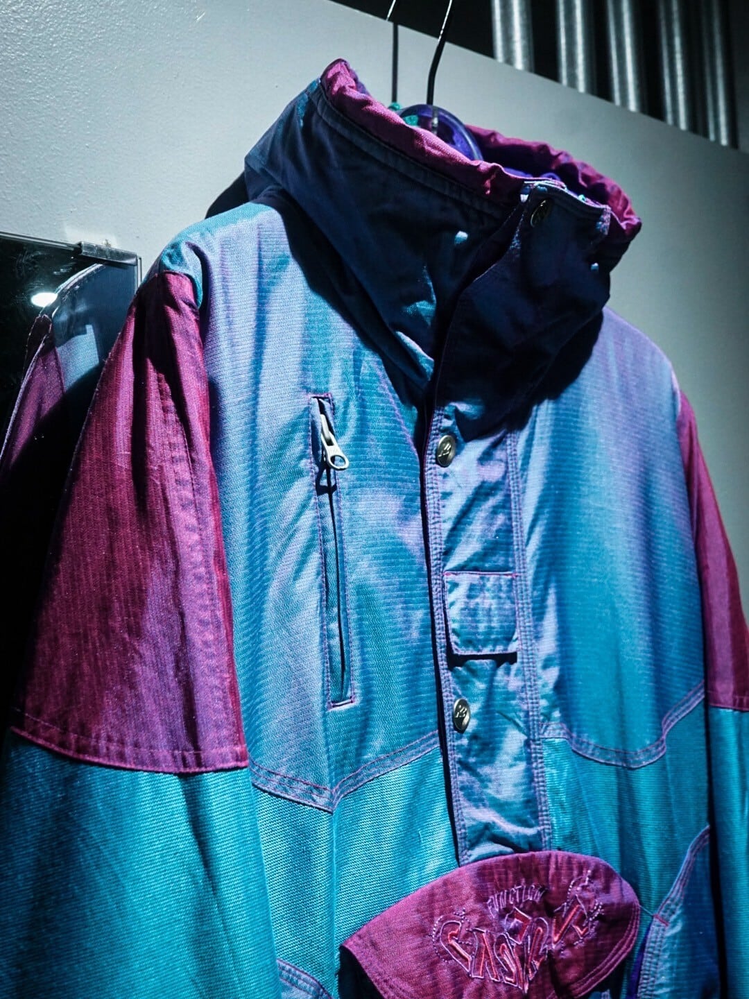 光沢を帯びたアノラック型のボディに、鮮やかな玉虫カラーも相まって、レトロフューチャーな雰囲気を感じさせる、存在感抜群のスペシャルな1着。