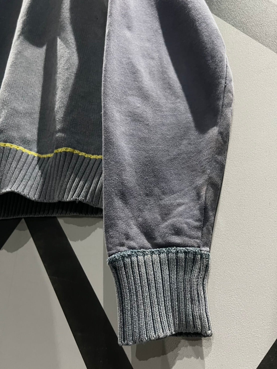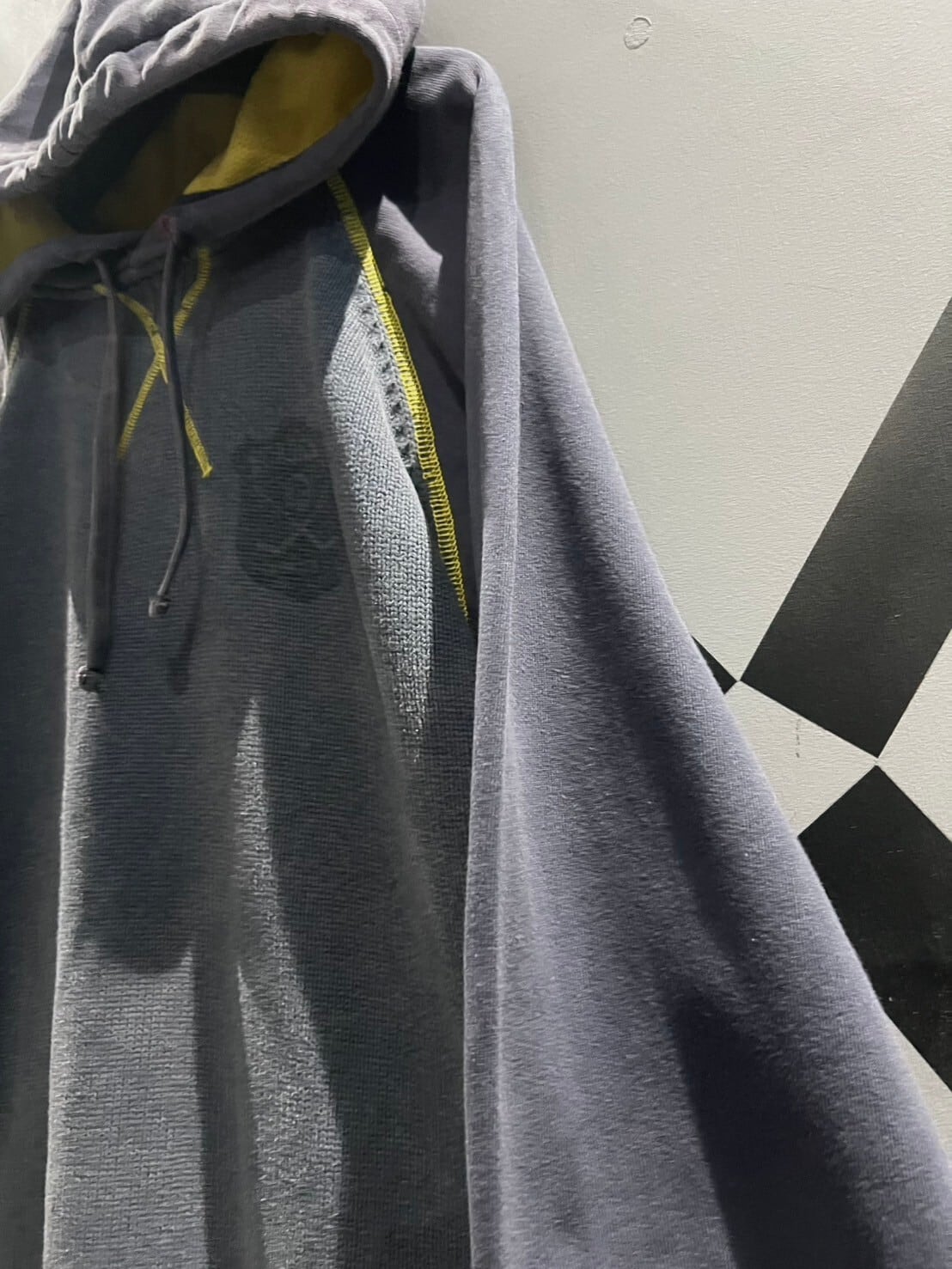 フード裏の鮮やかな黄色のメッシュ生地に、ボディの随所に走らされたロックミシンのステッチがアクセントになりつつ、ボディのフェードカラーとも相性抜群です。