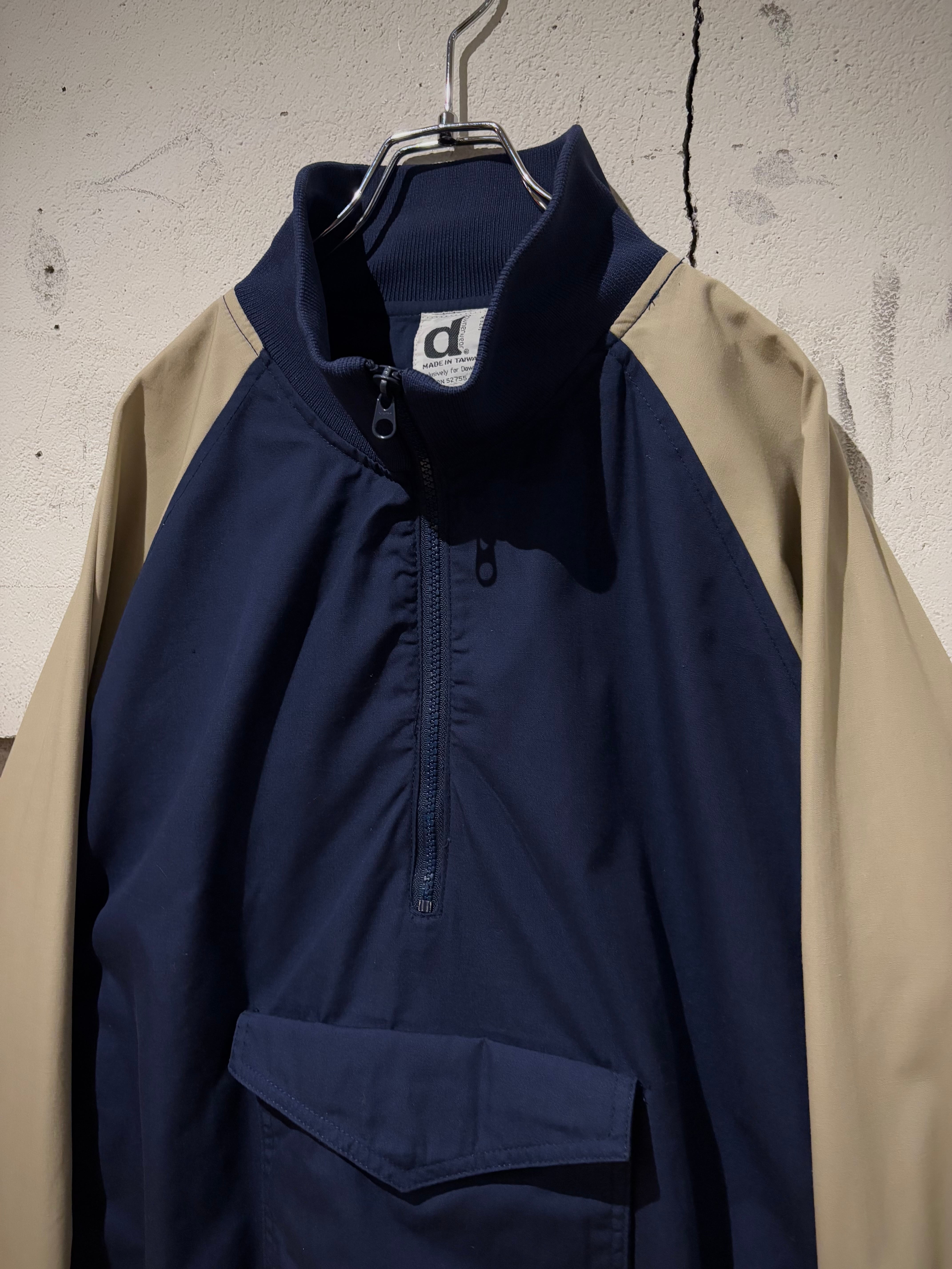 コットン×ポリのハリのある素材を用いて、ネイビー×ベージュでボディを切り替えたアノラックプルオーバー。