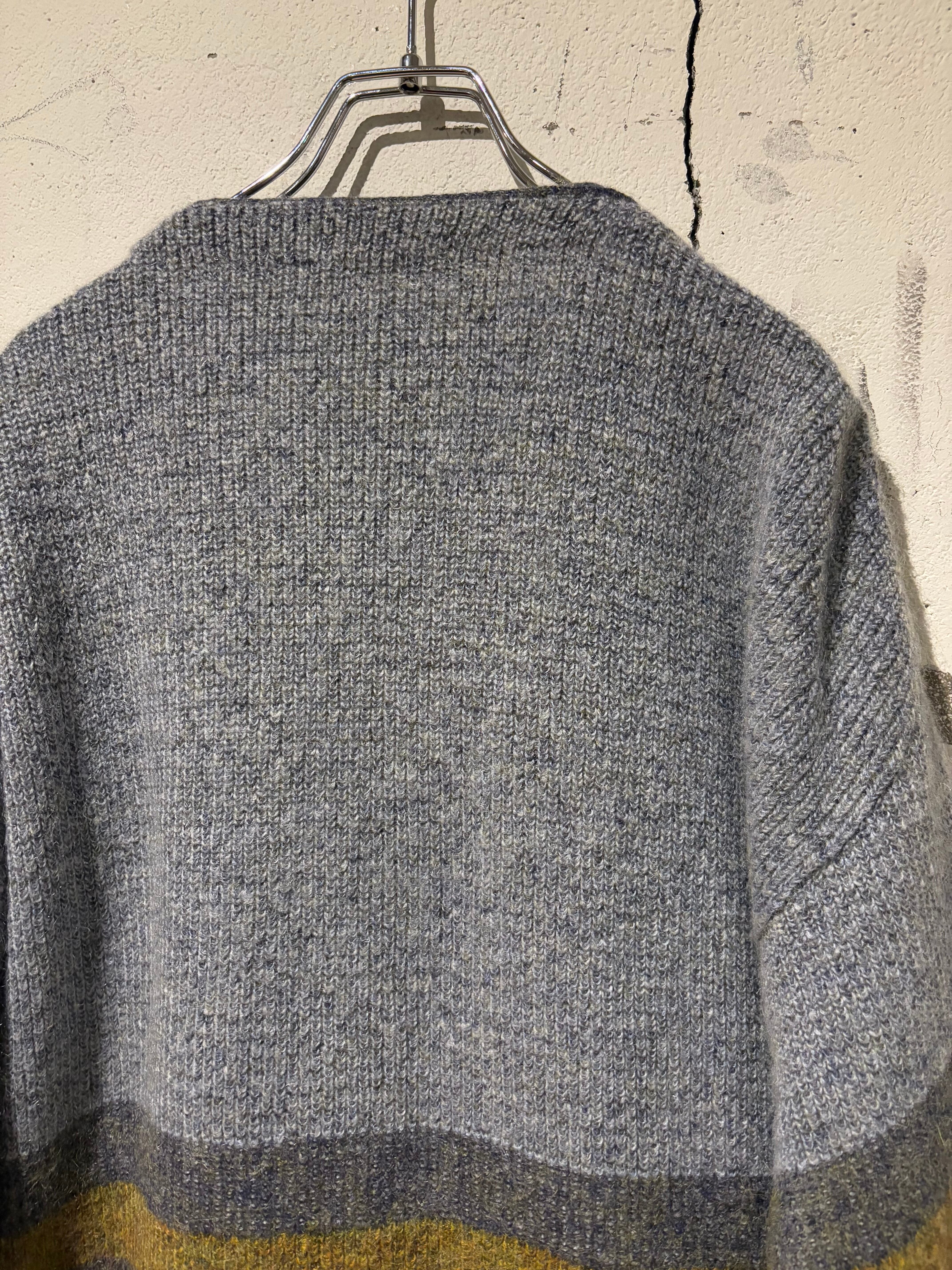 2トーンのグレーカラーのボディに、巧みなニッティングで黄色やオレンジを混ぜ込み、絶妙なカラーリングで仕上げたニットカーディガン。