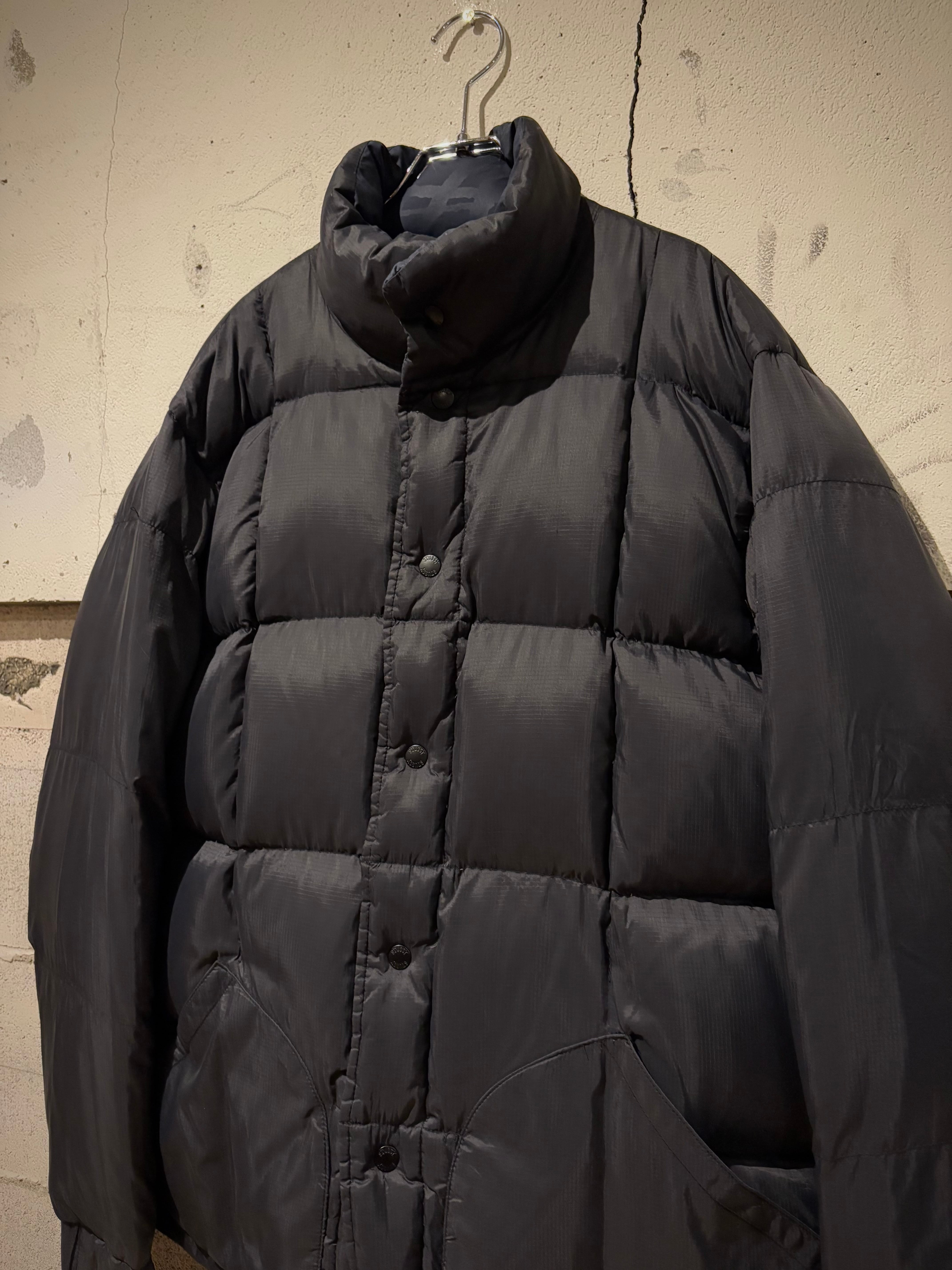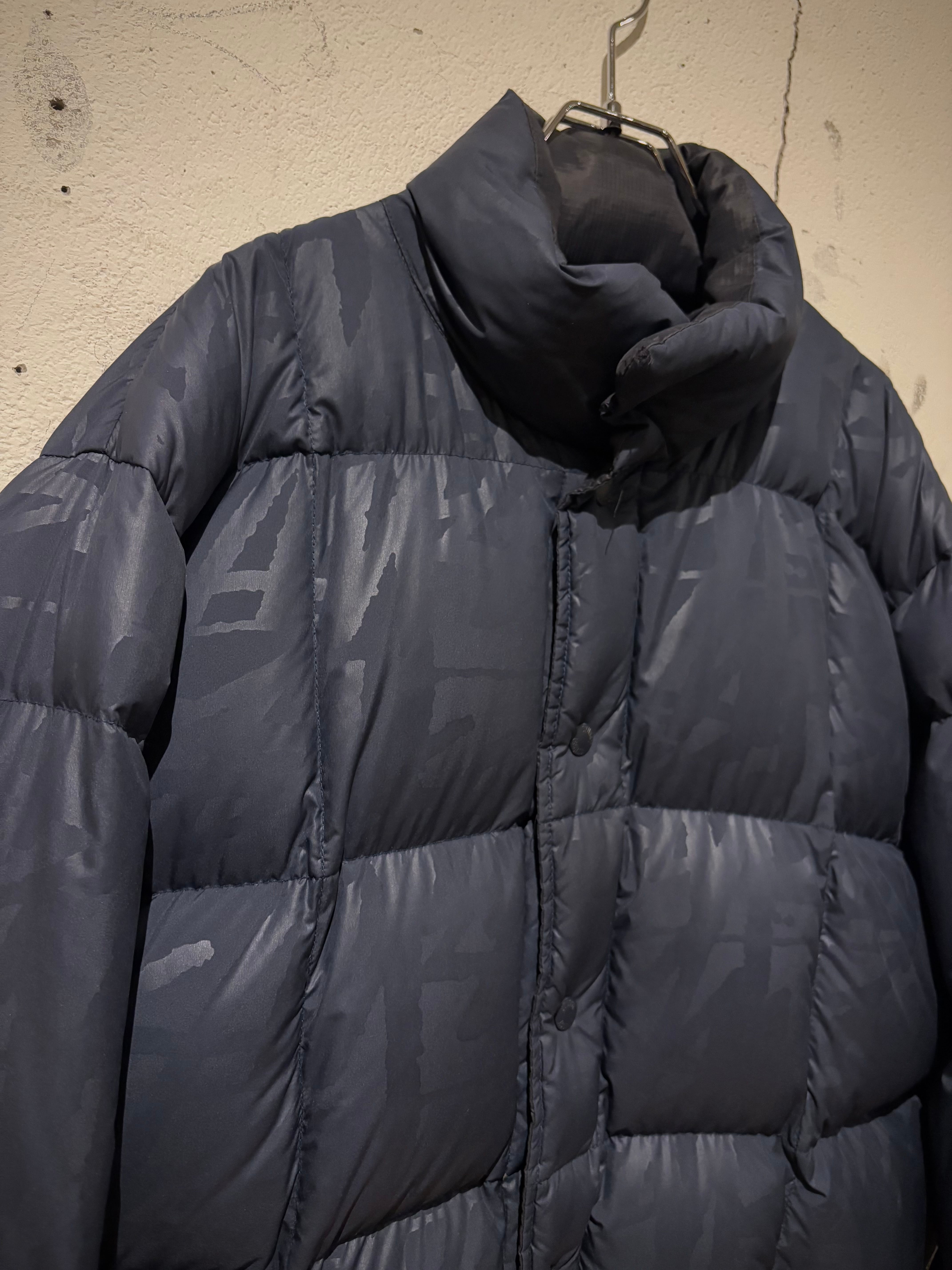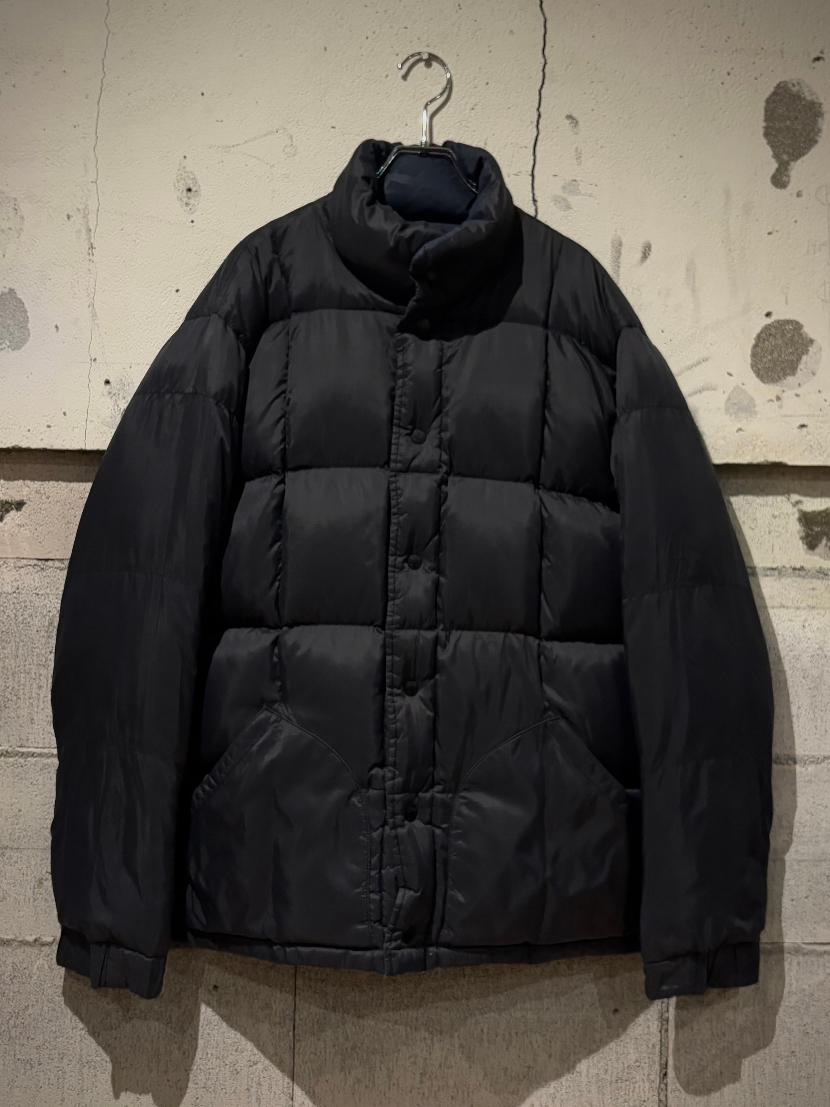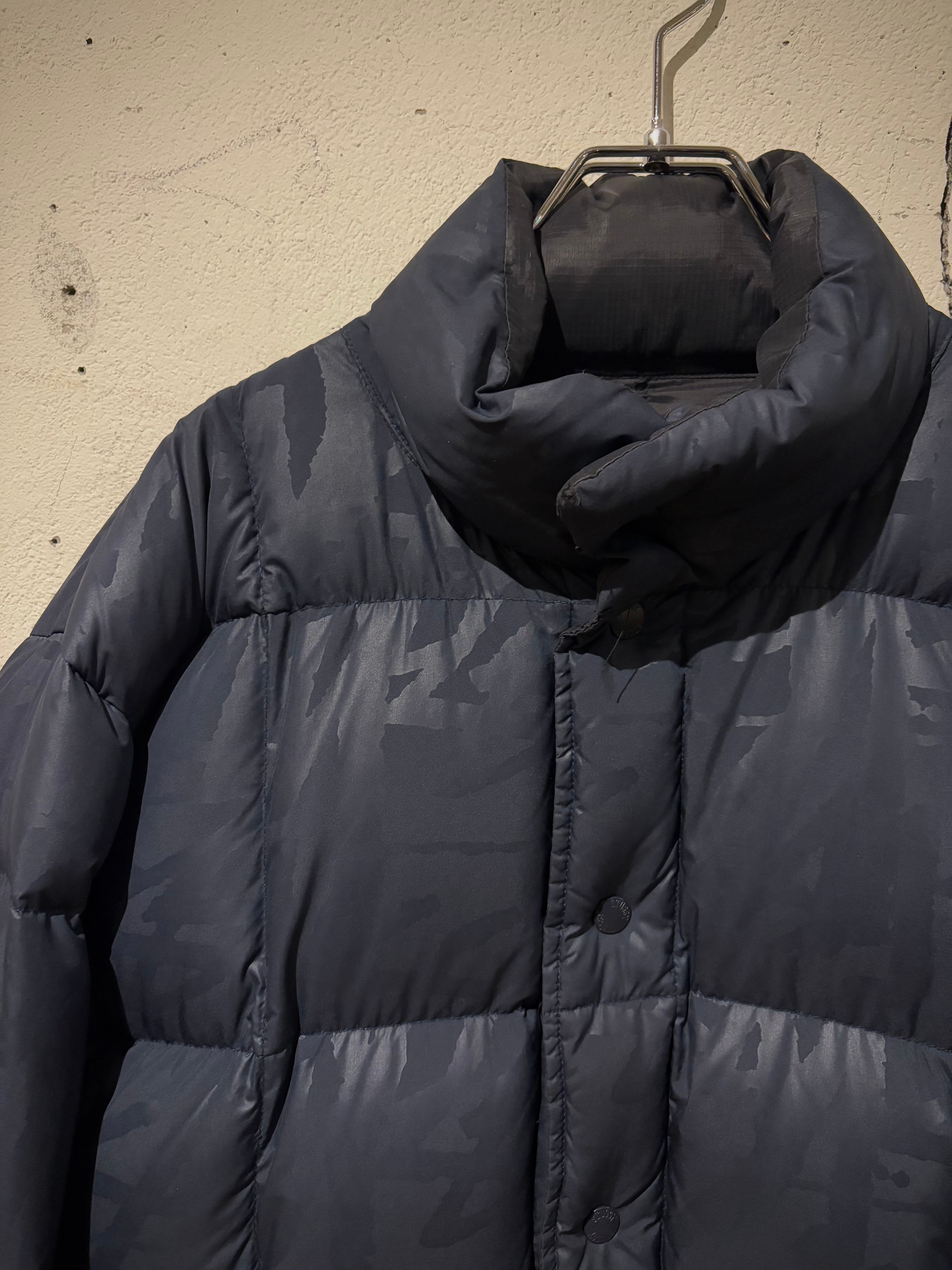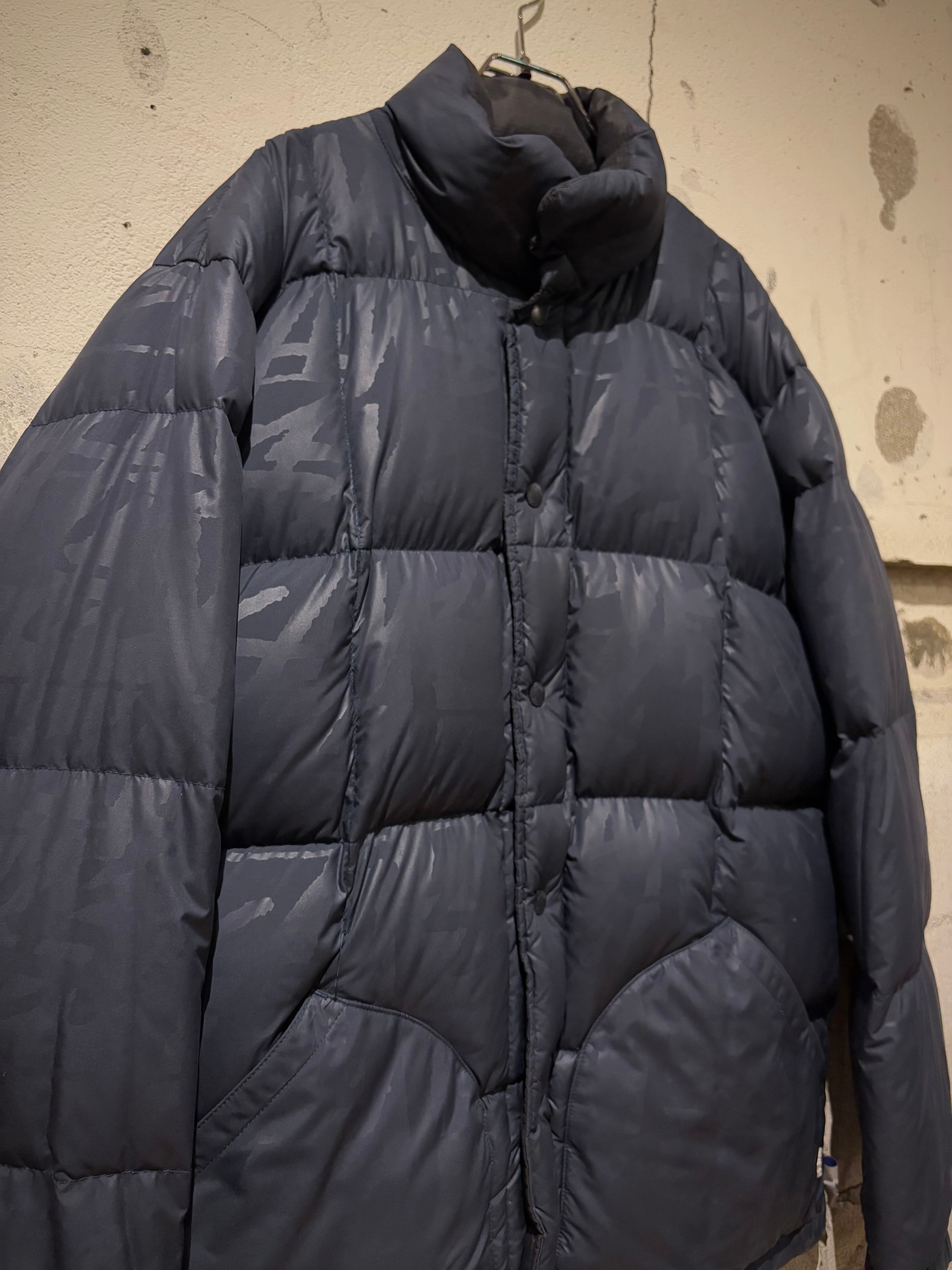 表面はネイビーのボディにブランドロゴをプリントで載せ、ガバッと裏返すとリップストップナイロンを用いたブラックのボディへと変化する、稀有なリバーシブル仕様のダウンジャケット。