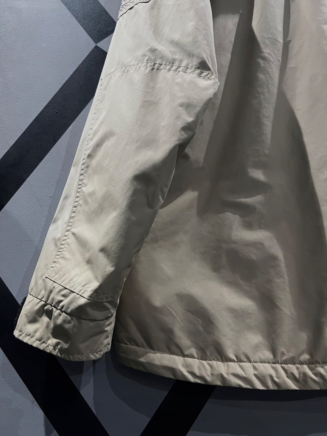 ハリのあるベージュのナイロン生地を用いたボディに、フロントにはポケット、首元にはドローコード、袖口はベルクロと、機能性を考慮したギミックが盛り込まれたギアジャケット。