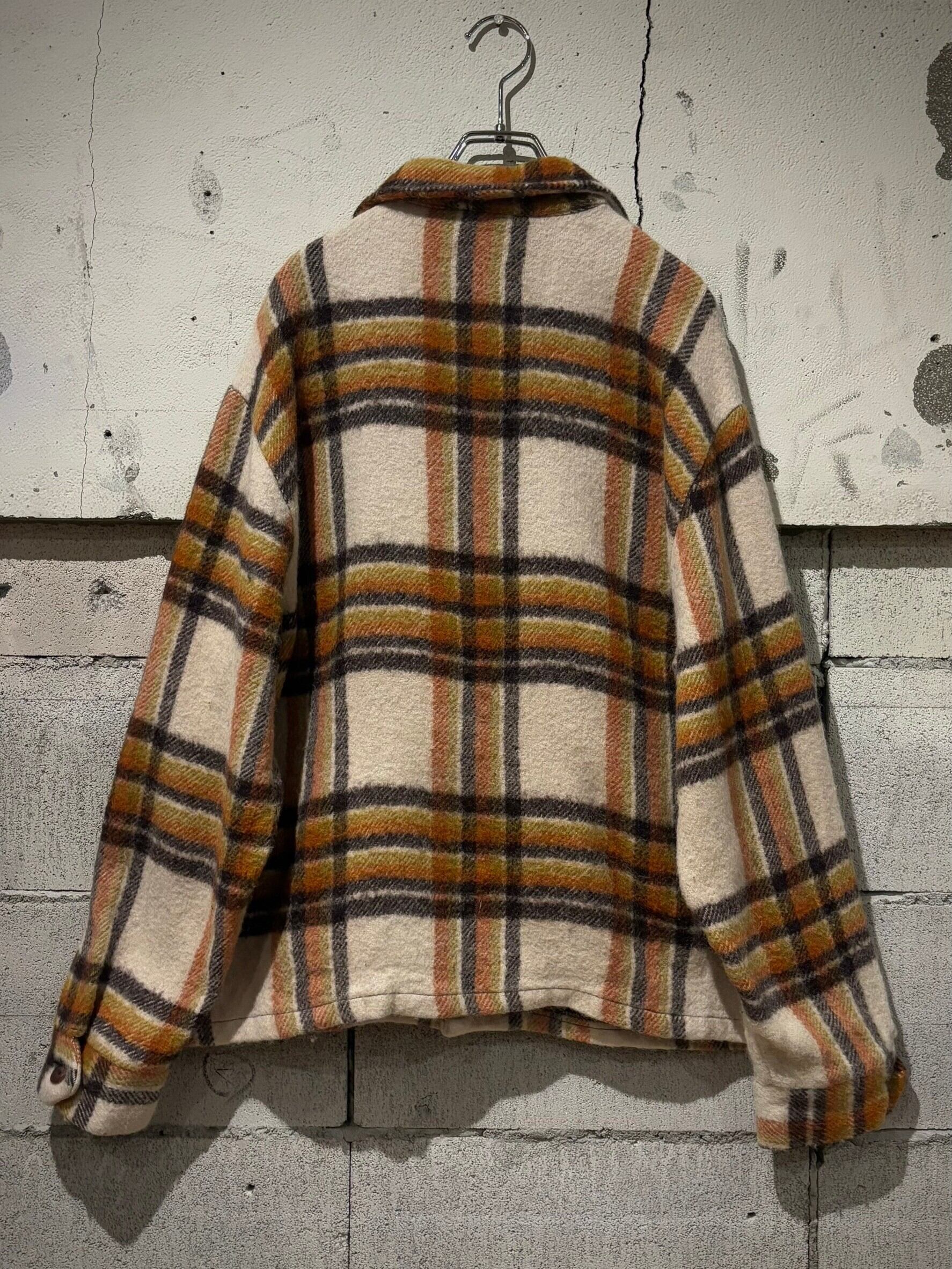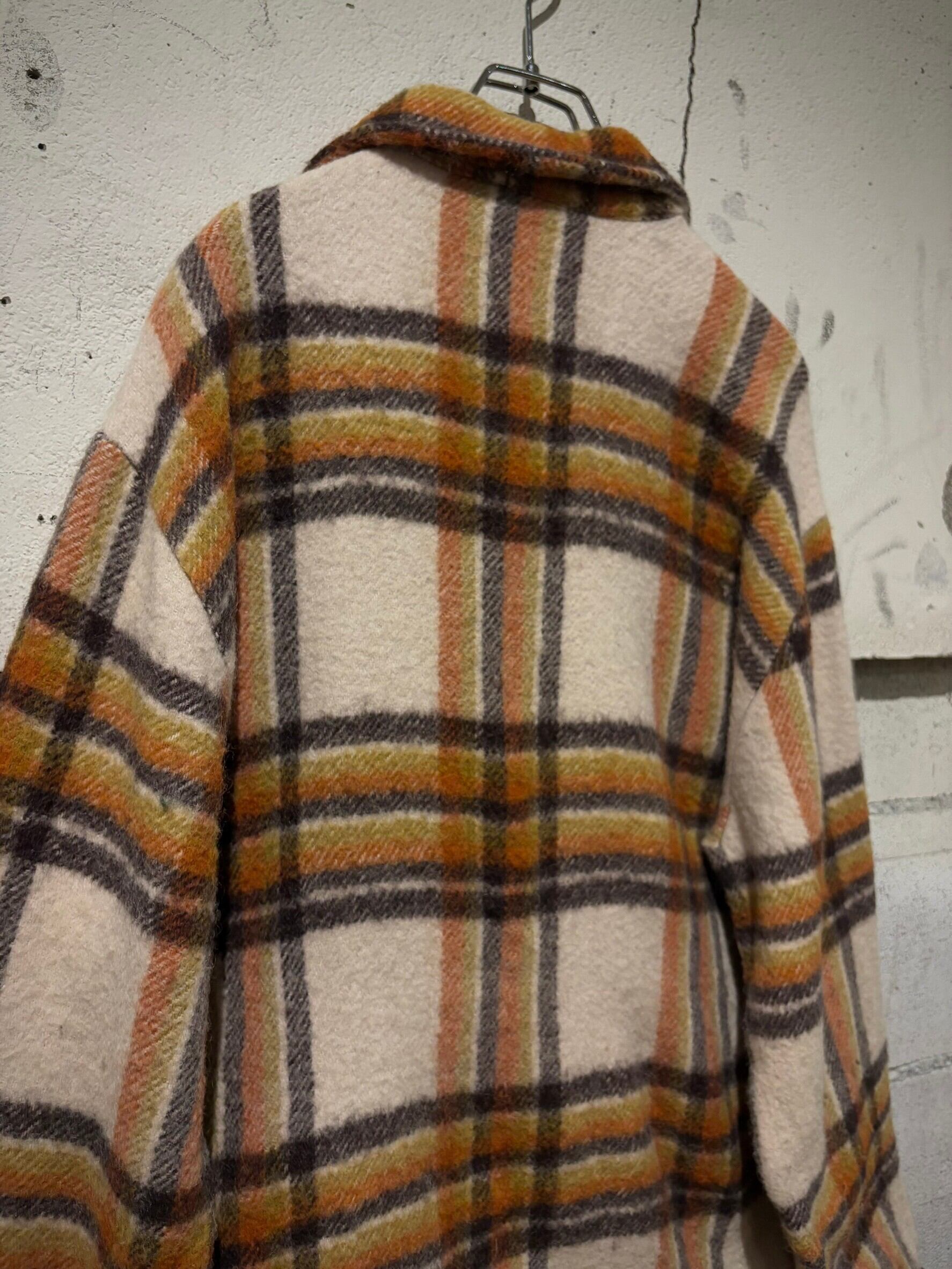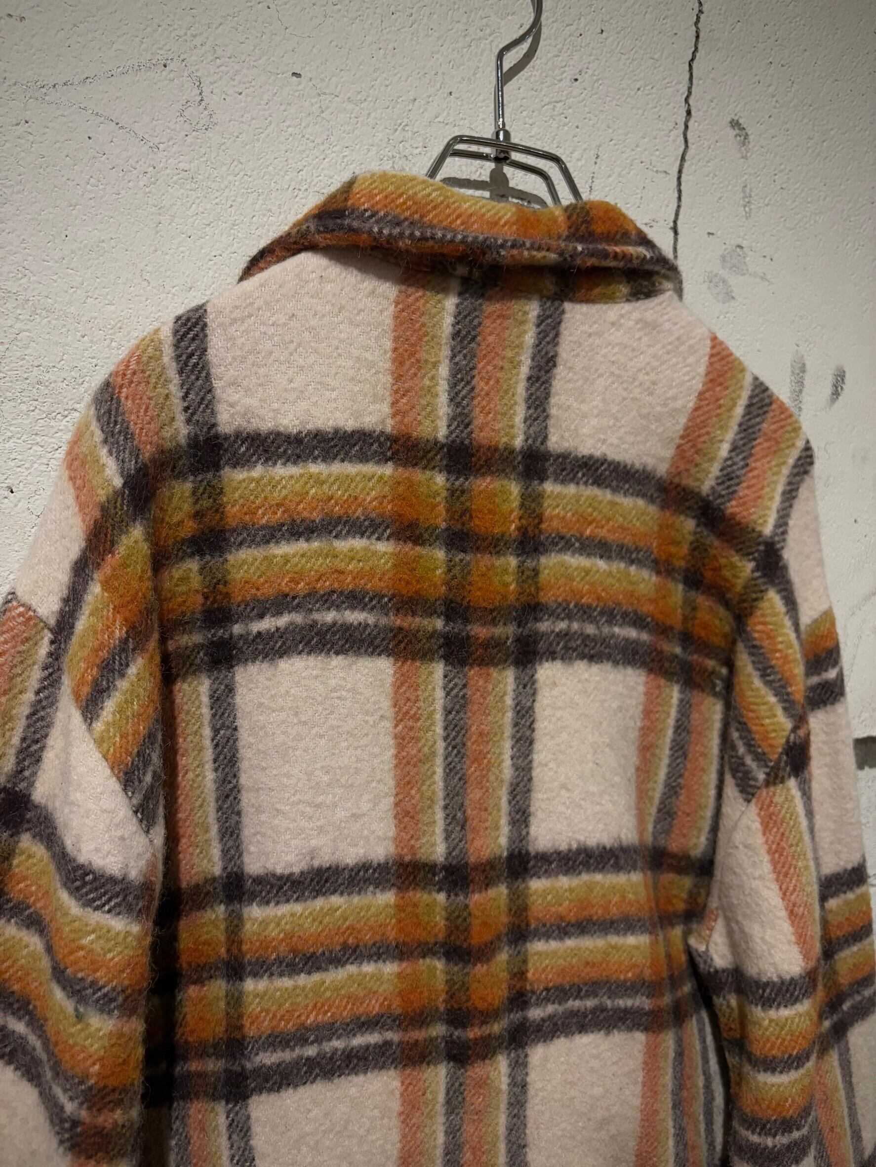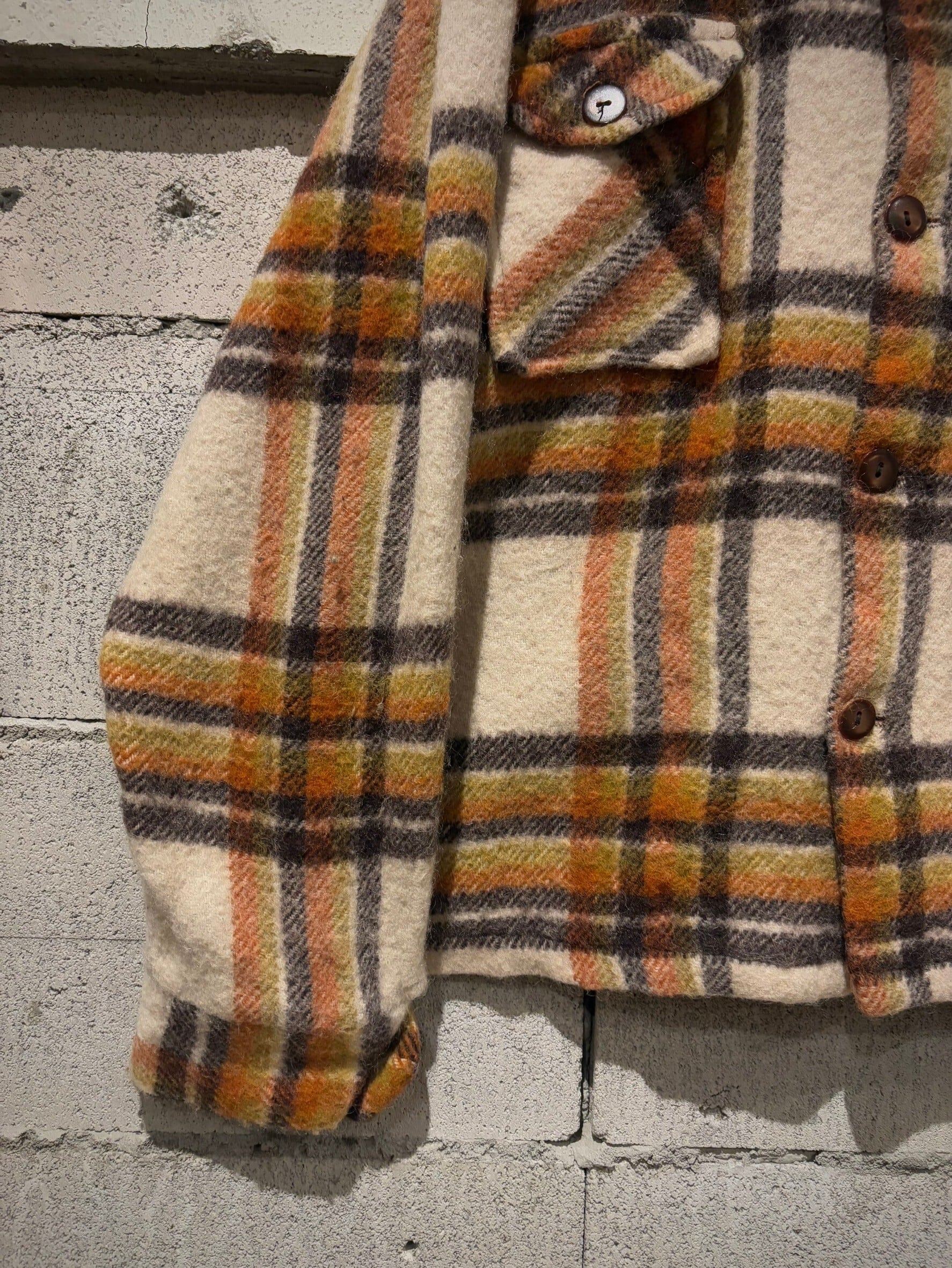柔らかく上質なウールを用いたボディに、ベージュ、オレンジ、黒の温かみのあるカラーリングでチェック柄を載せたシャツジャケット。