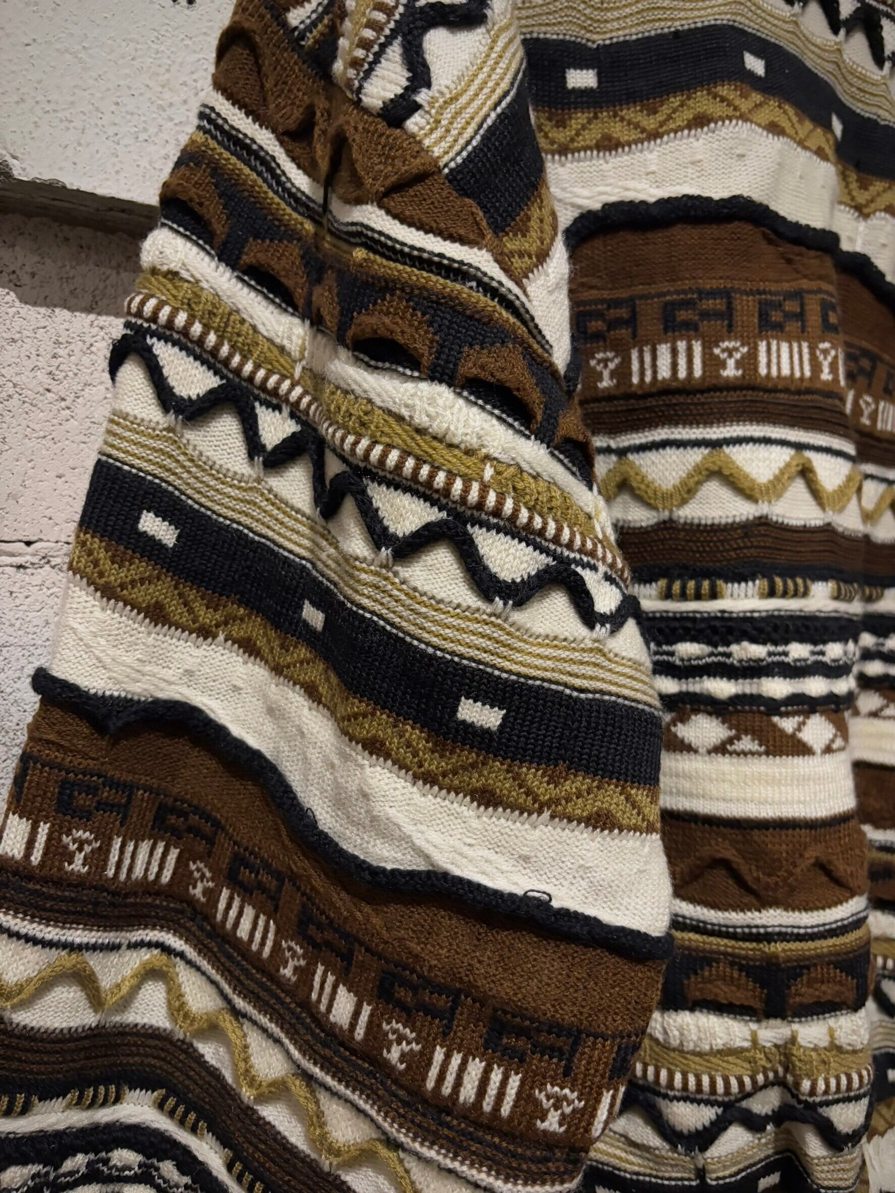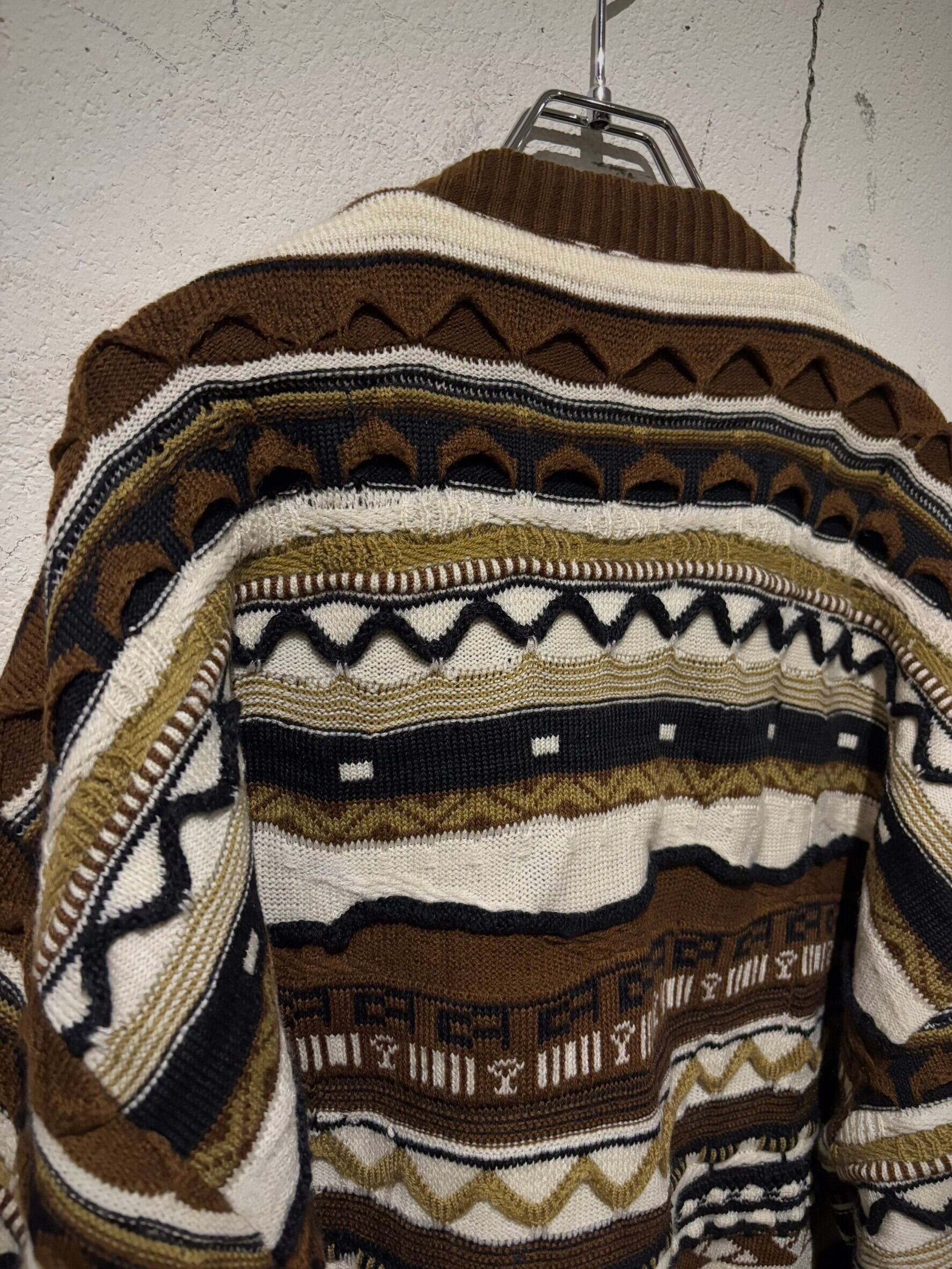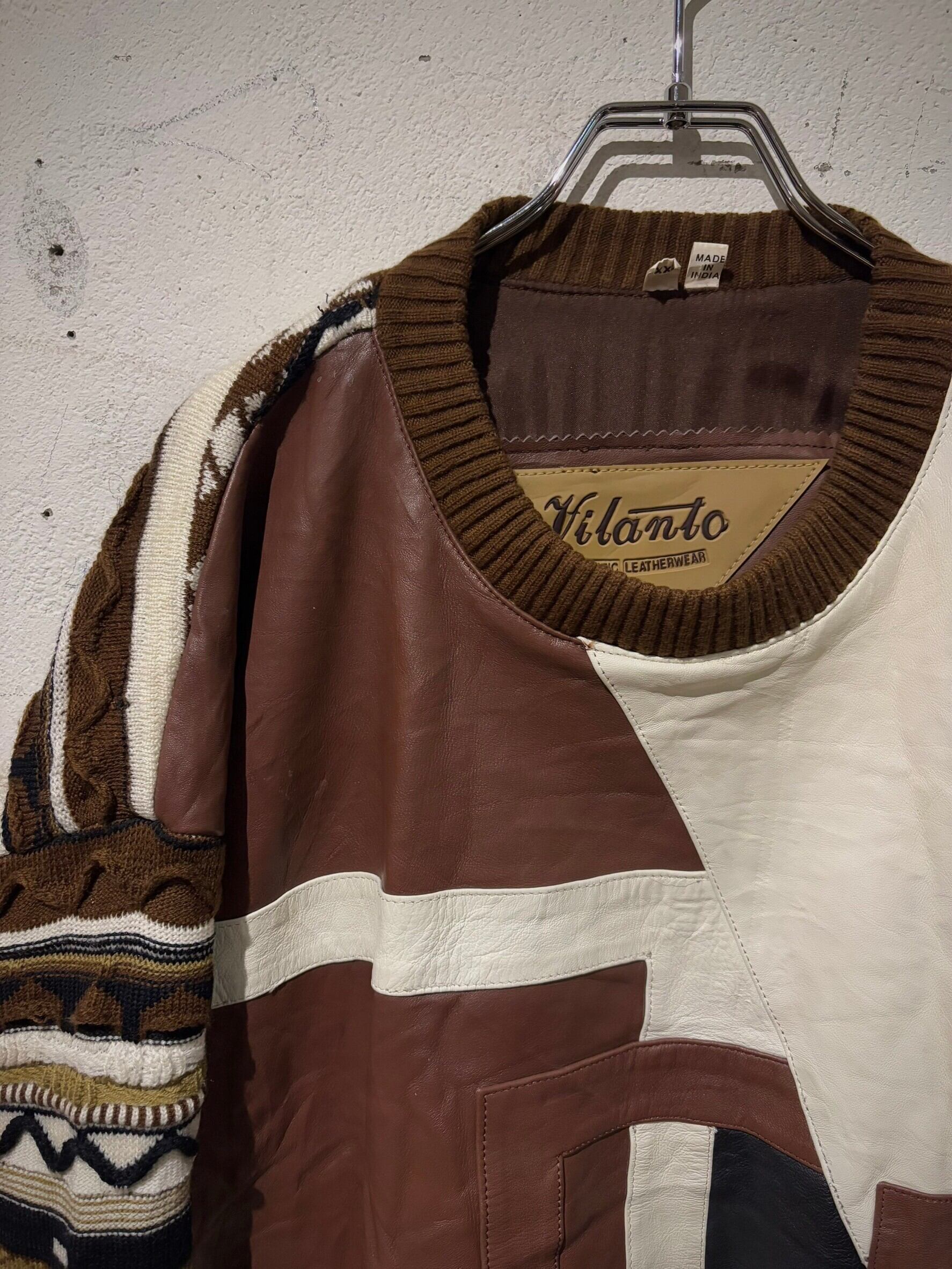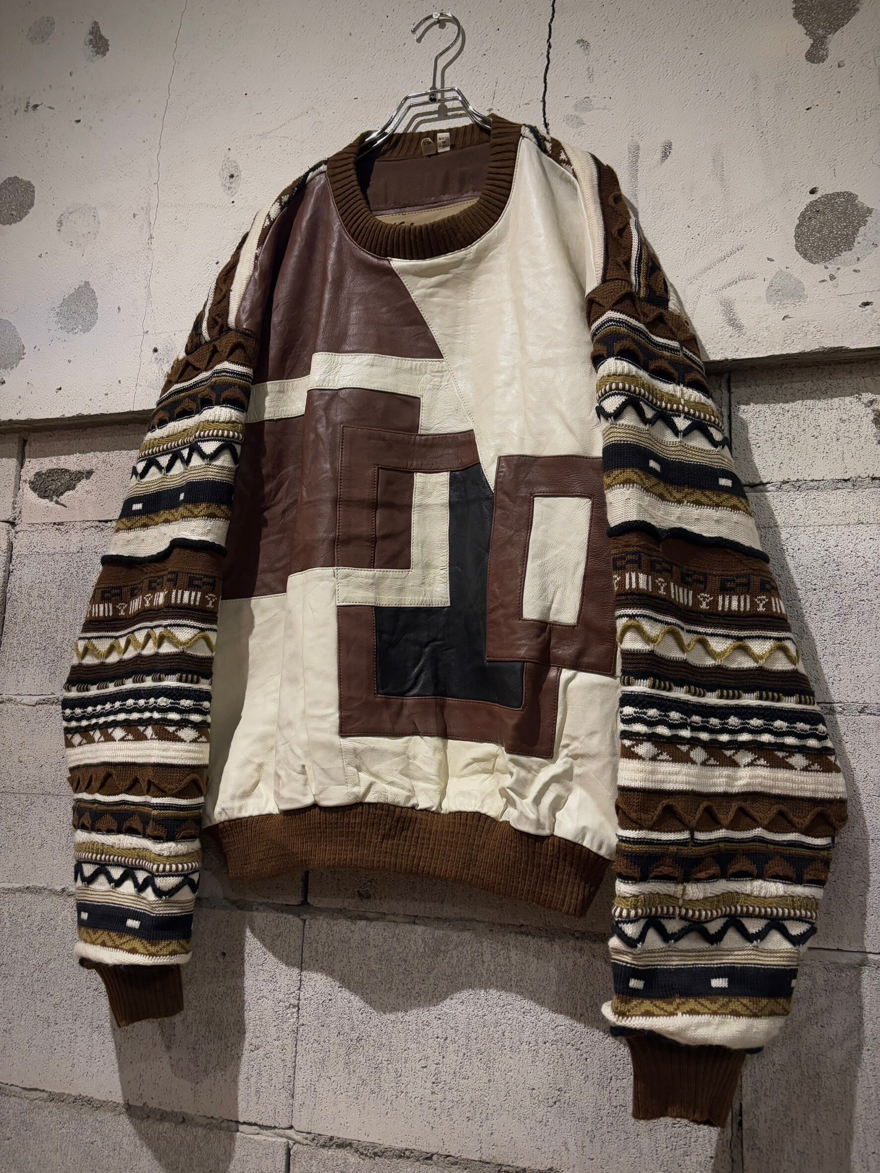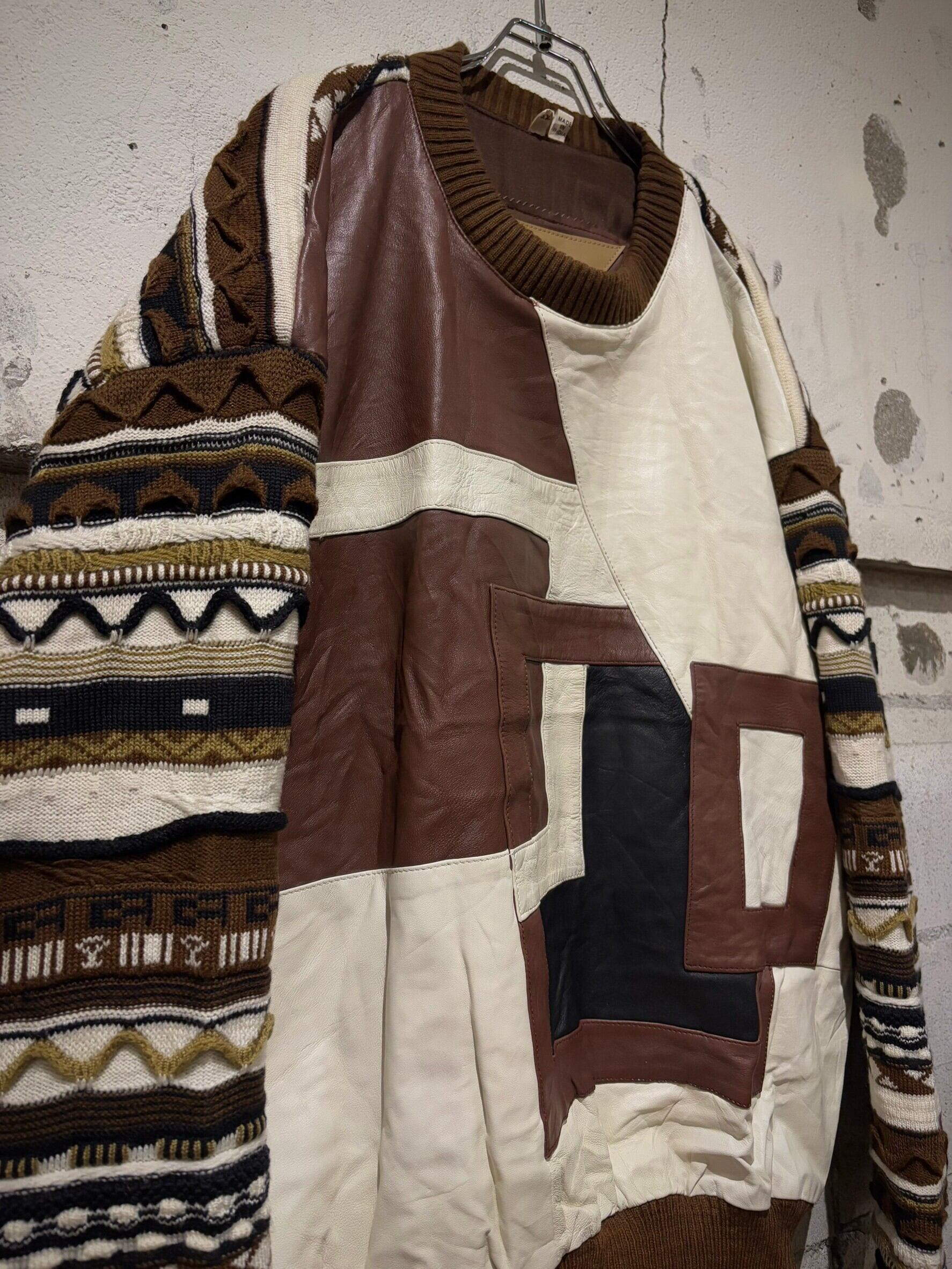茶、マスタード、ブラウン、ホワイトの落ち着いたカラーリングの立体感のある3Dニットに、フロントに鈍い光沢を帯びた極上レザーを幾何学的に切り替た稀有かつスペシャルな逸品。