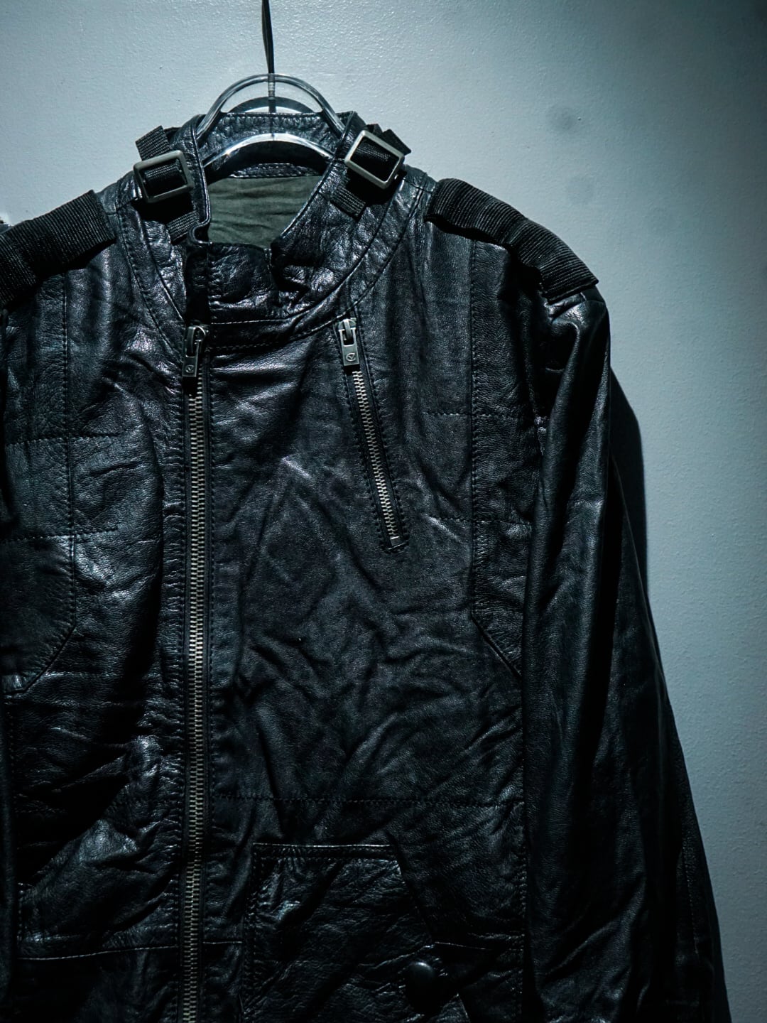 ダブルライダースのような仕様に2本のジップ、片側にのみ施されたポケットや、ガンパッチのような切替デザイン等様々なディテールが載せられた稀有かつデザイン性の非常に高い1着に仕上げられています。
