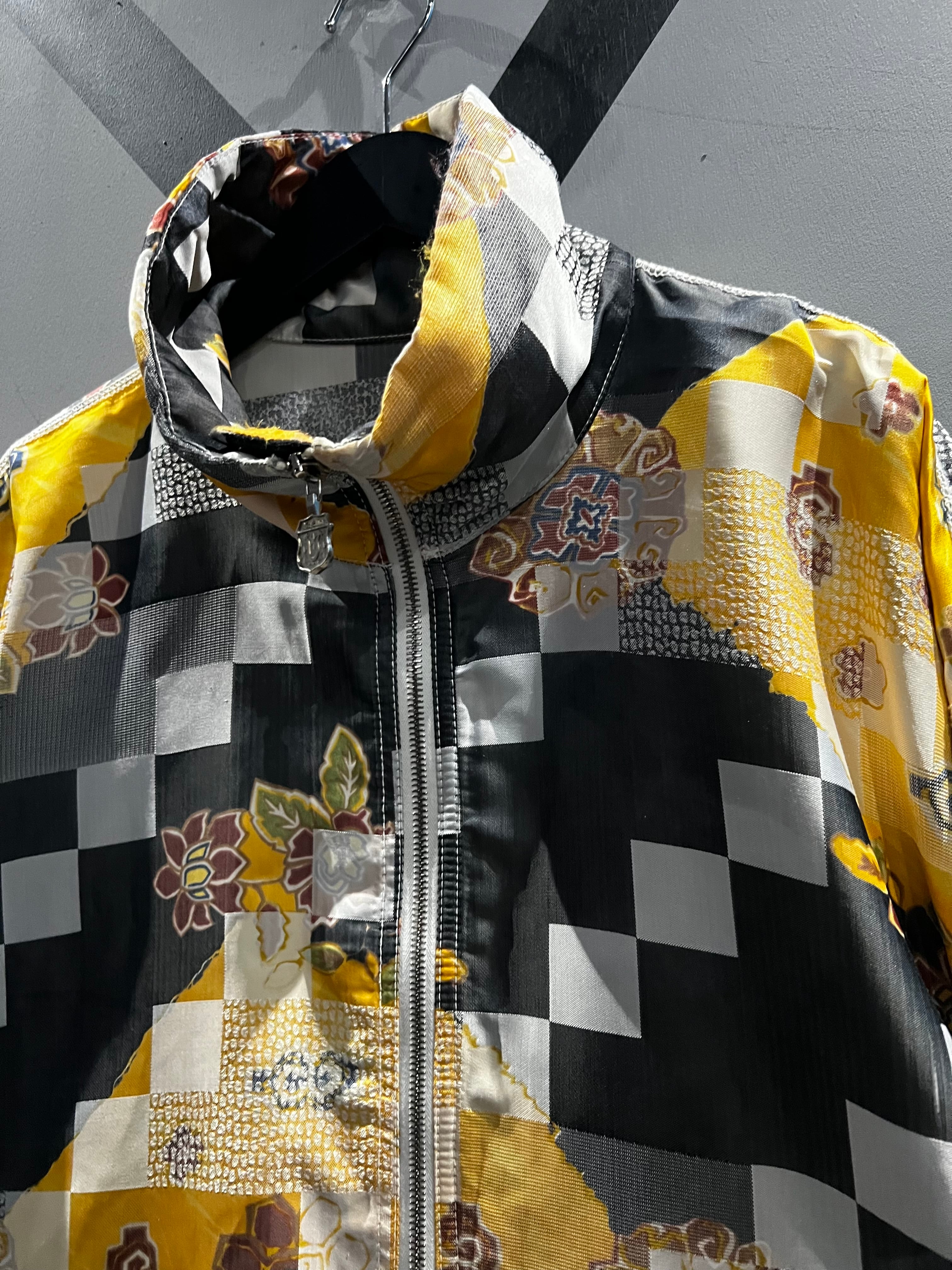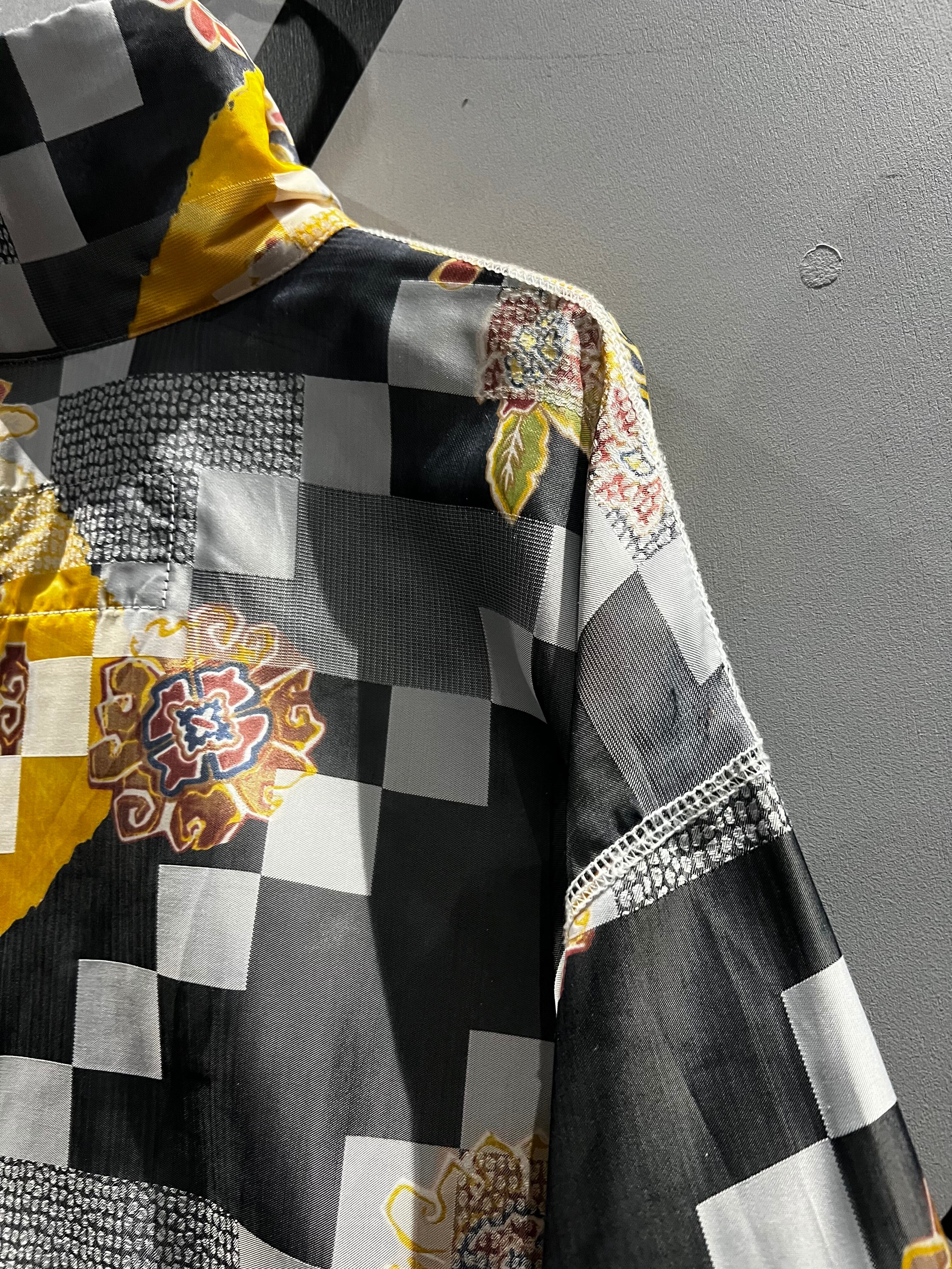 ハリのある軽やかな素材を用いたボディに、デジタル調のデザイン、オリエンタルな花のデザインを載せたハーフジップニット。