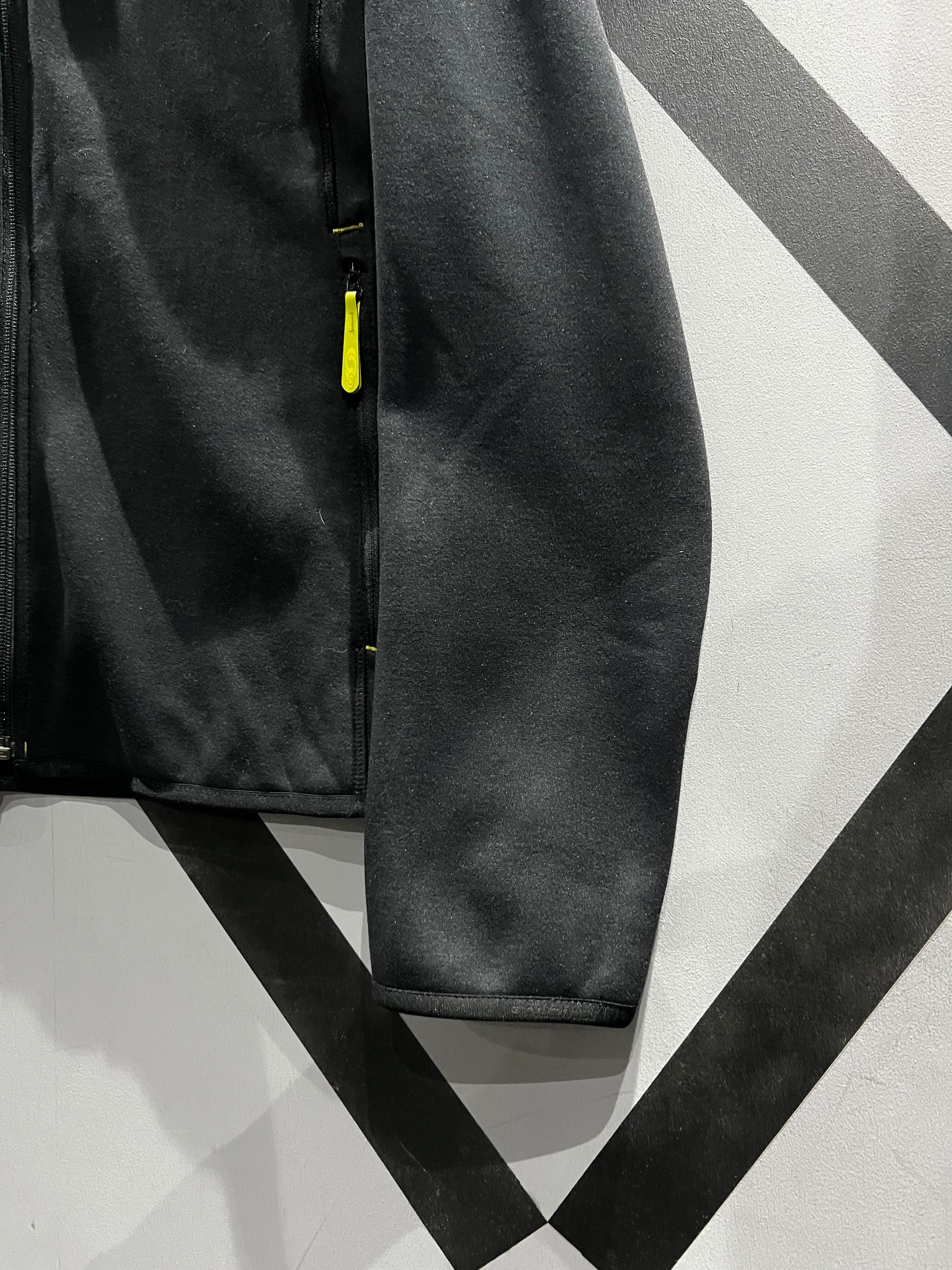 伸縮性のあるブラックのボディに、ネオンイエローでジップポケットのギミックを載せた、シンプルでソリッドに仕上げられたジップアップフーディジャケット。