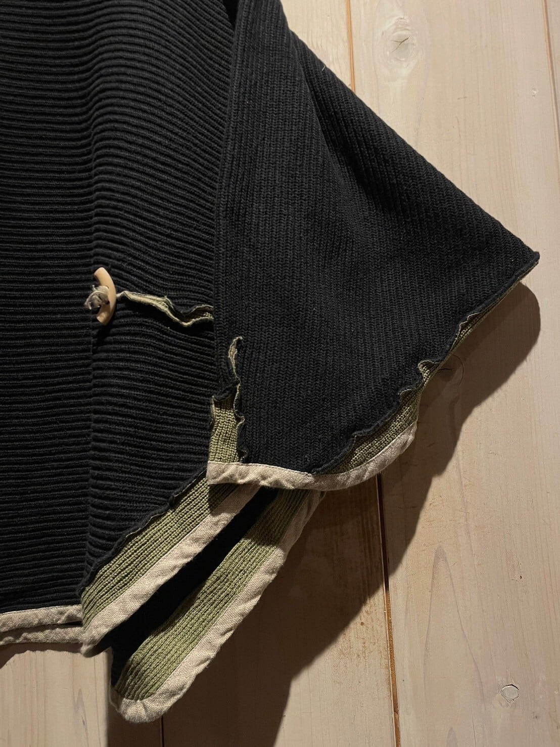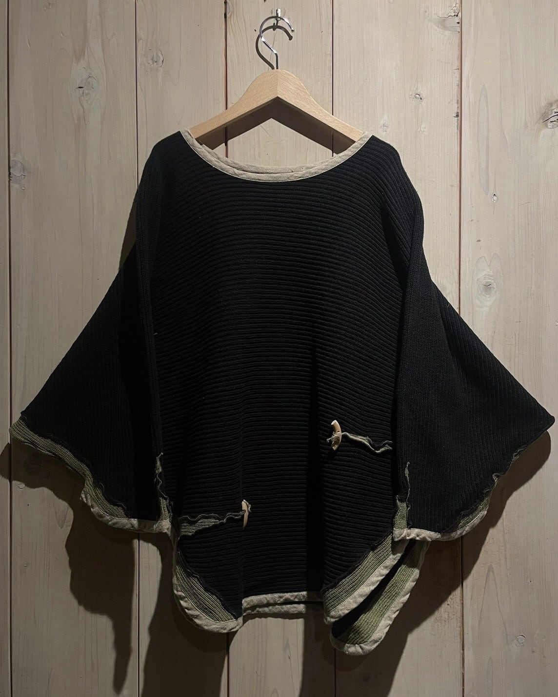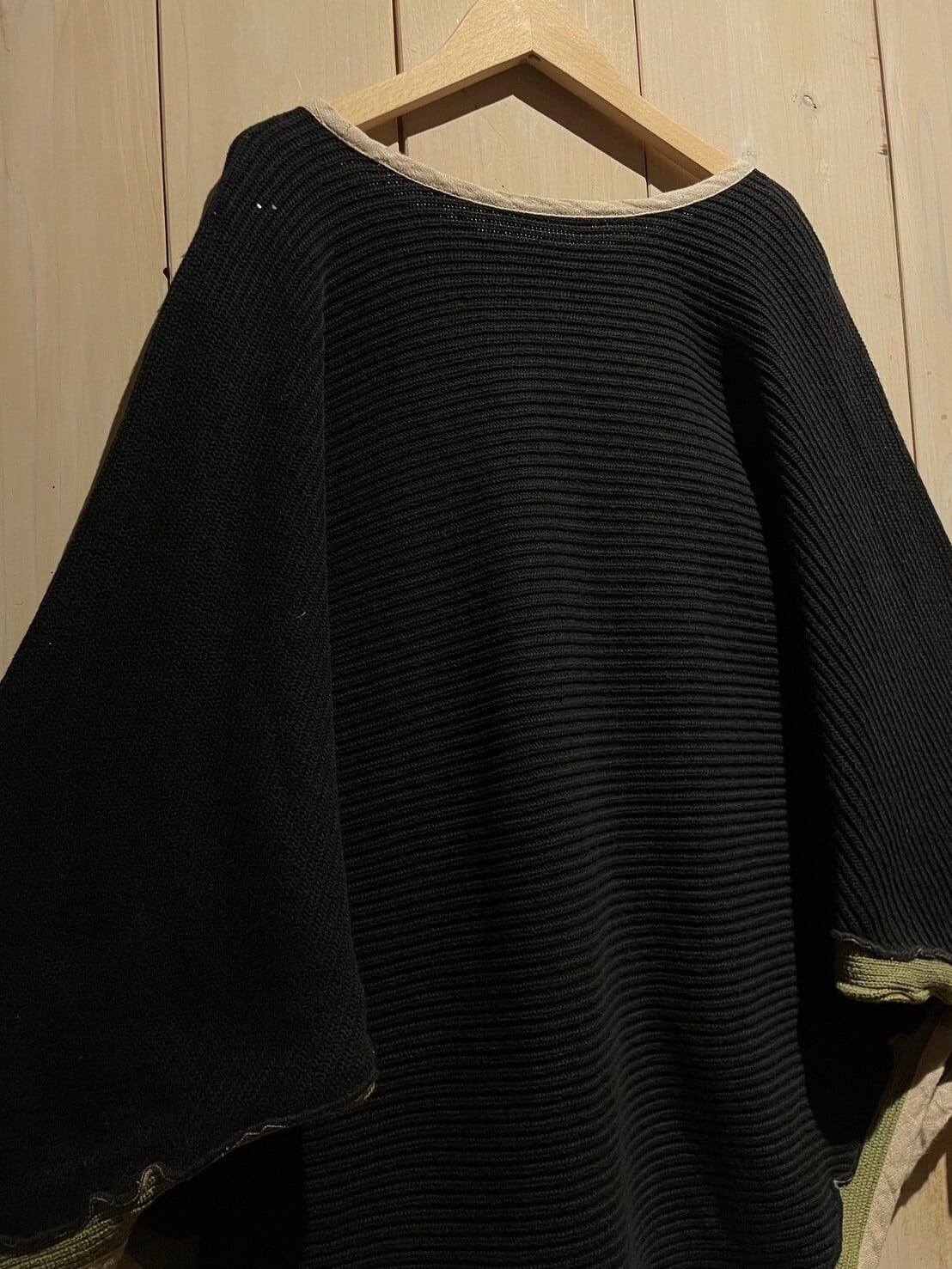 ブラックのニット地をベースに、裾部分にはグリーンの生地を切り替えたニットポンチョ。