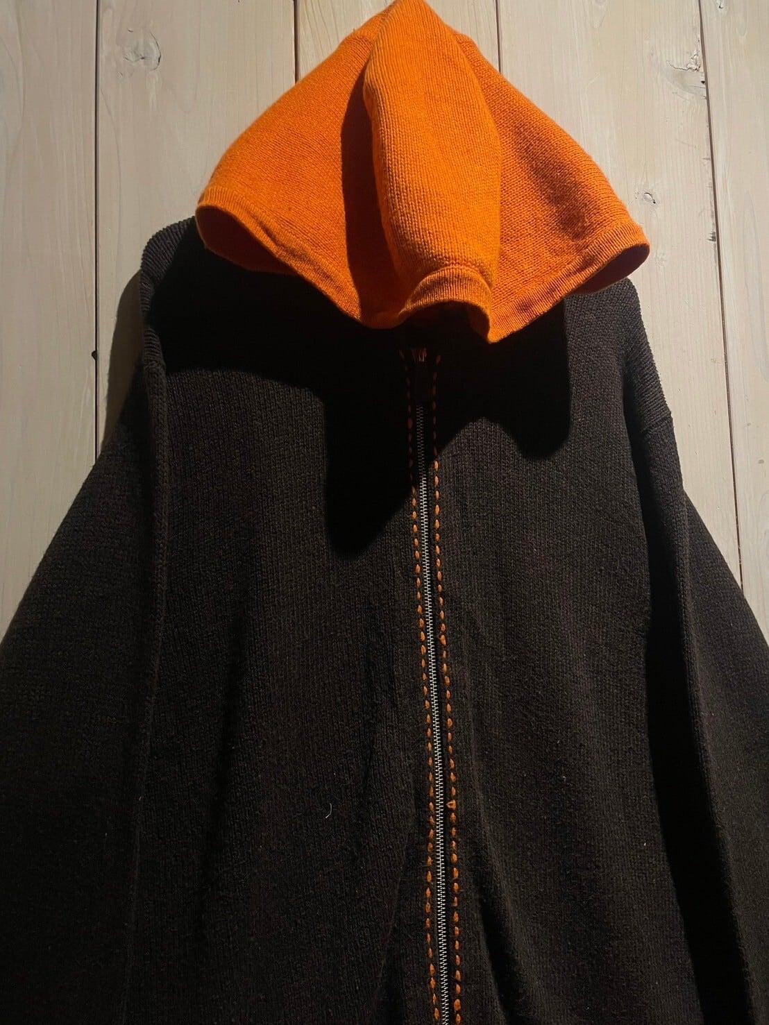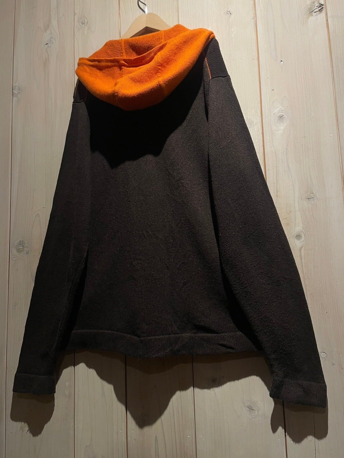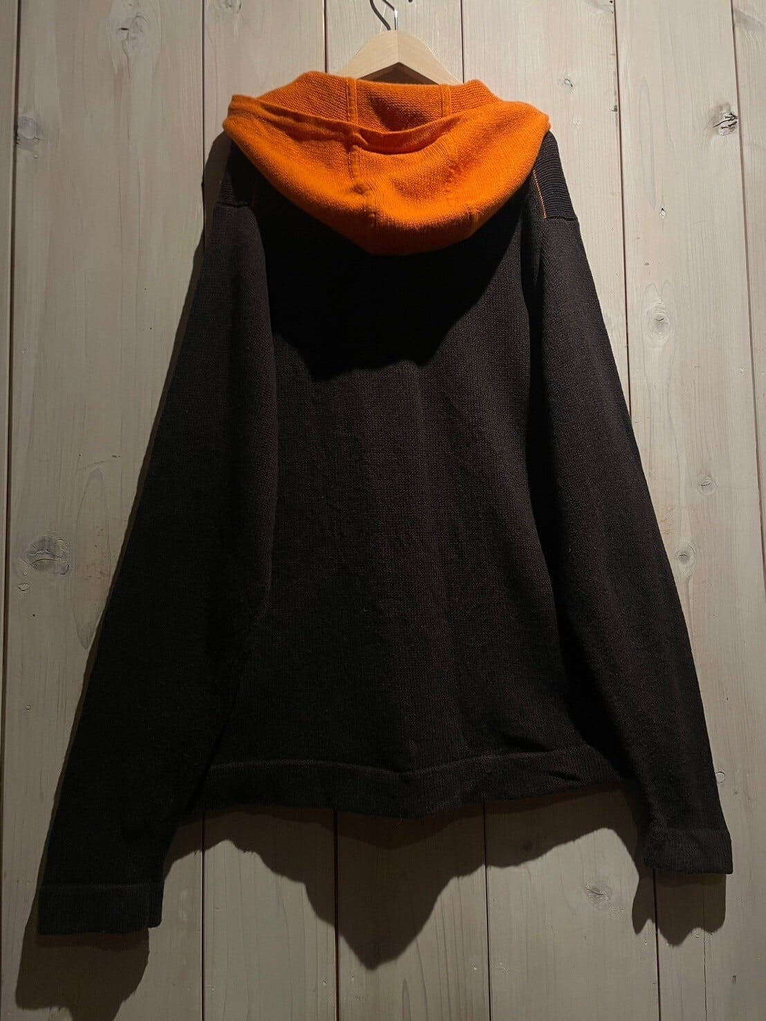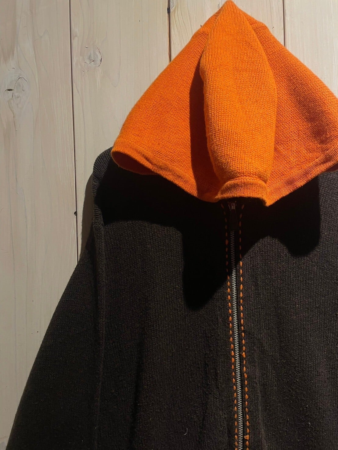 ブラウンのニットをベースに、オレンジのフード、ステッチ、リブを切り替えたニットフーディー。